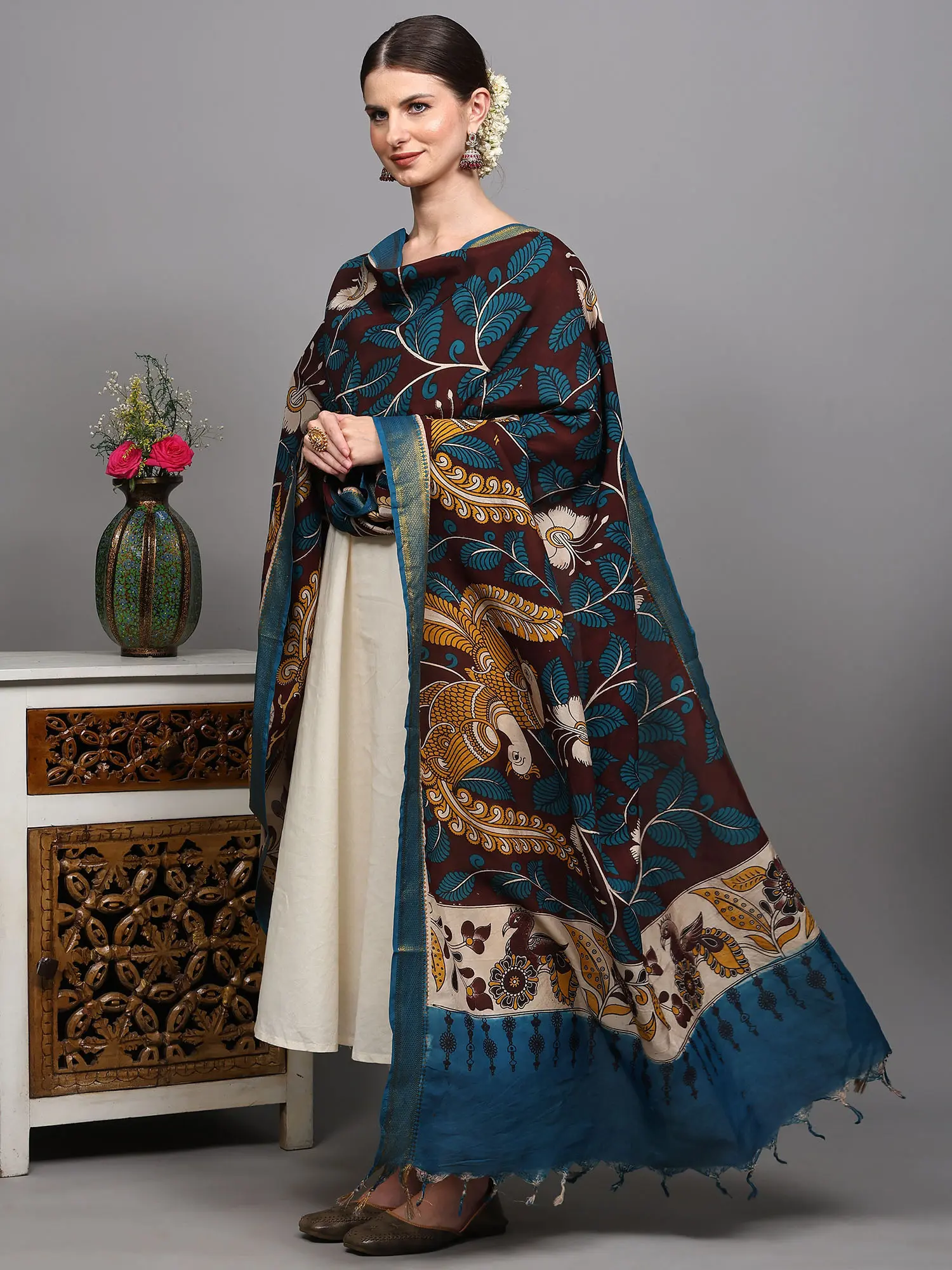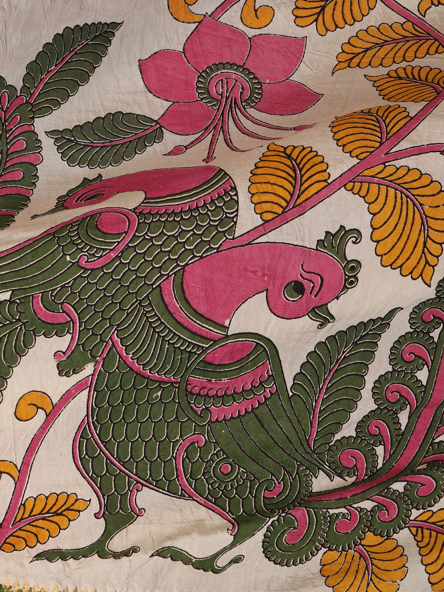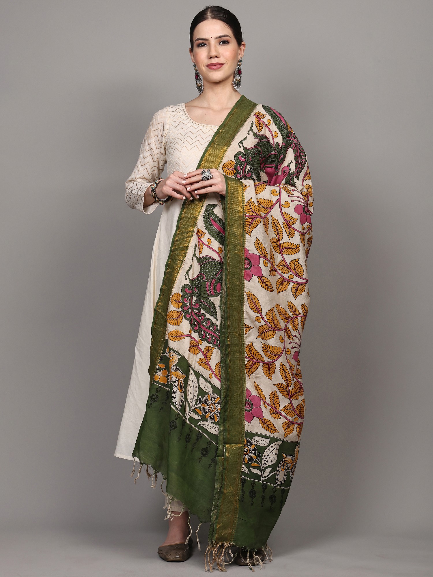 Cannoli-Cream Aari Embroidered Kalamkari Stole with Printed Multicolor Paisleys-Flowers Motifs from Punjab