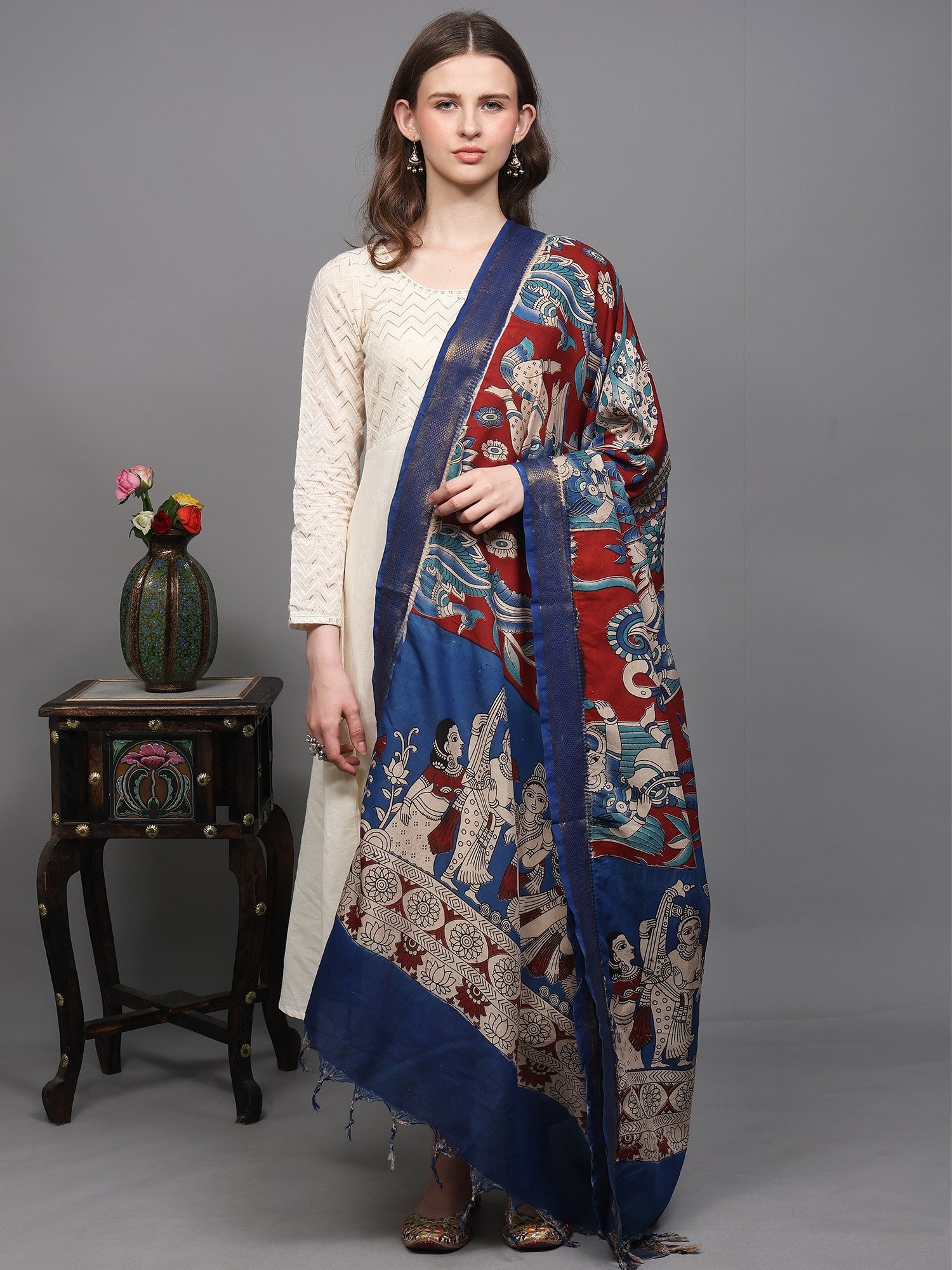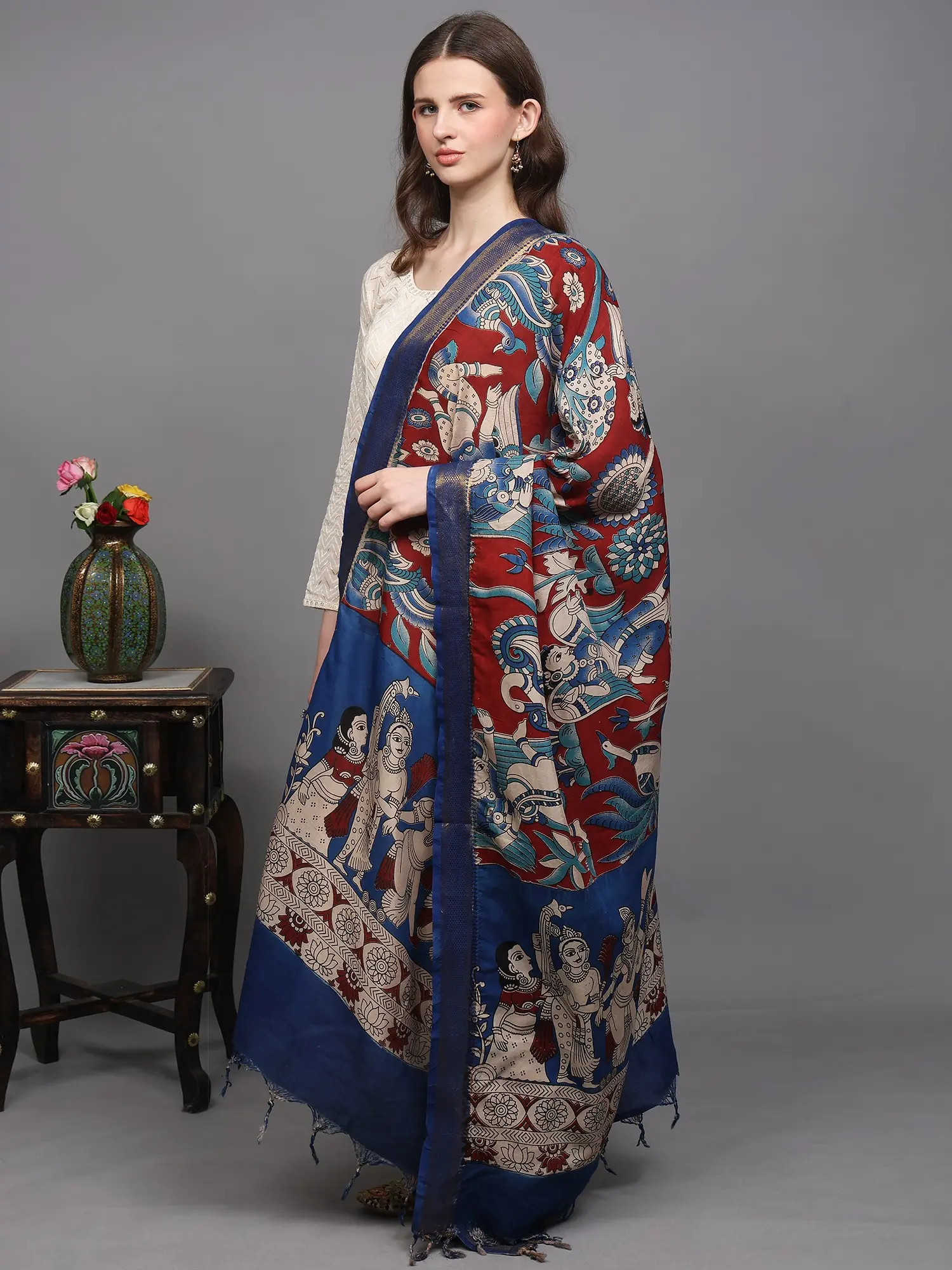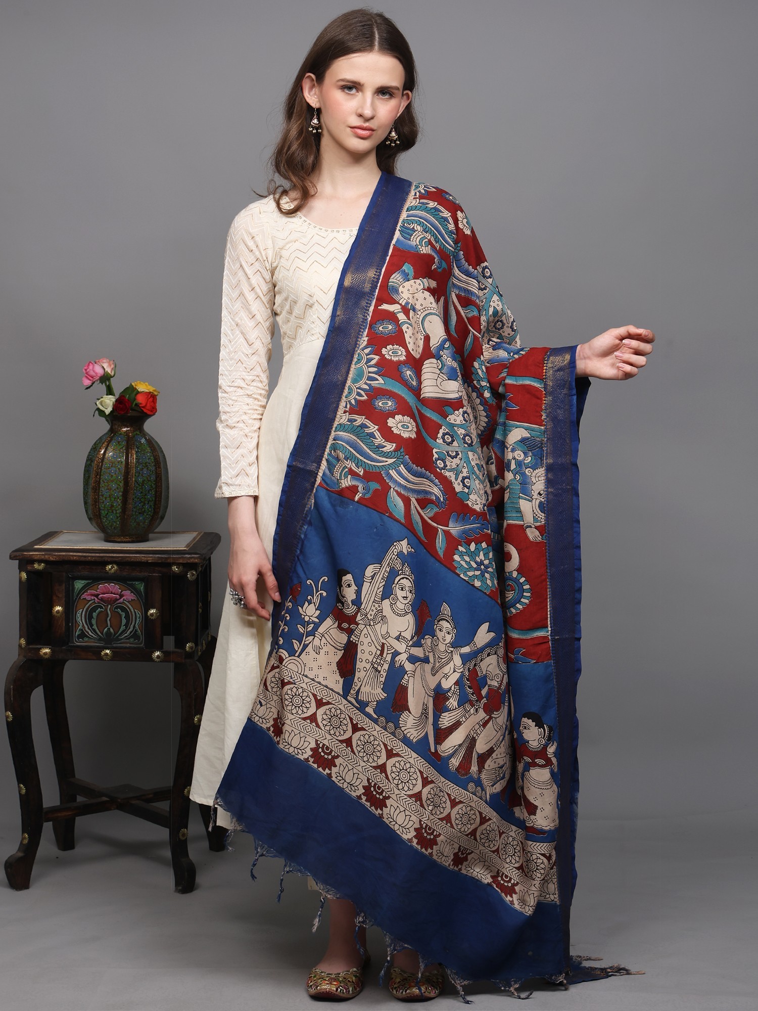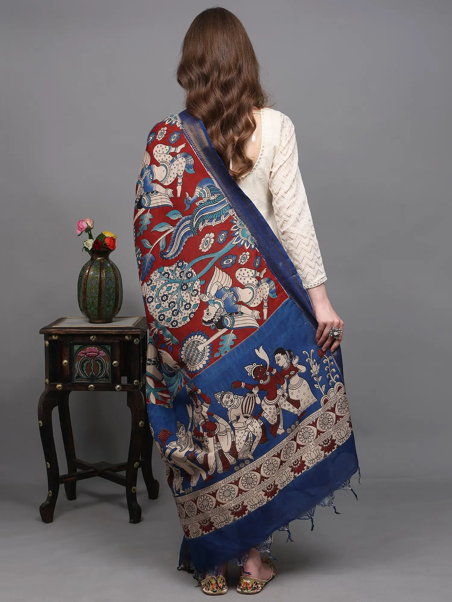 Bellwether-Blue Pure Cotton Kalamkari Saree with Printed Birds on Tree Branch