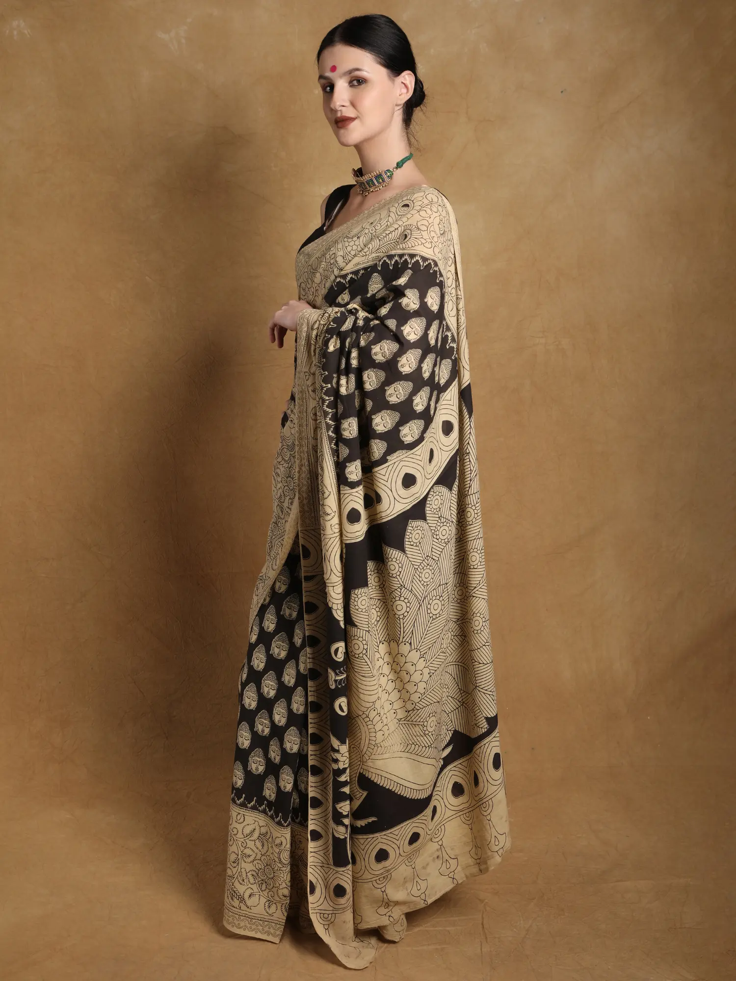 Drape yourself in comfort and culture with this gorgeous pure cotton saree from Telangana, transformed into an aesthetic scroll that exhibits the beauty of traditional Kalamkari painting. Cotton becomes the perfect canvas for the hand-painted patterns on the field of the saree. Buddha heads cover the entire drape, giving it a serene charm, amplified by the beauty of peacocks and floral vines on the border and pallu.