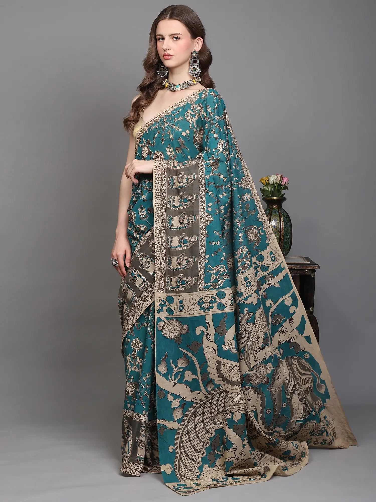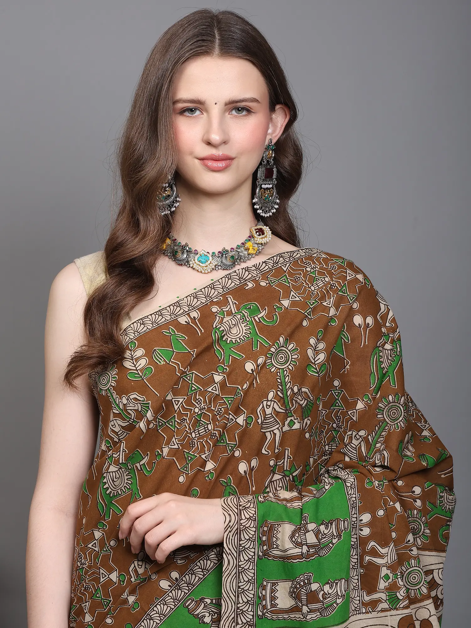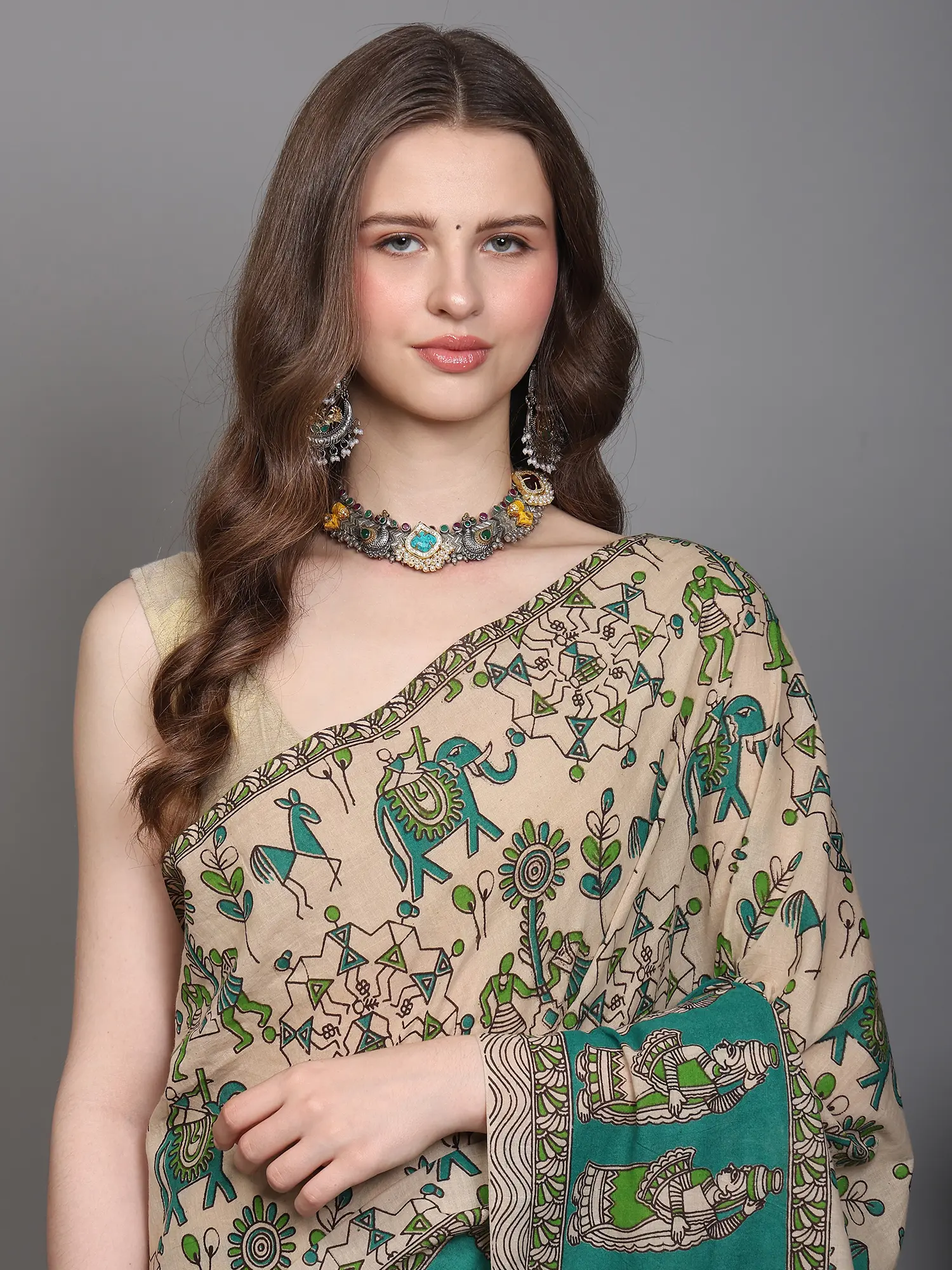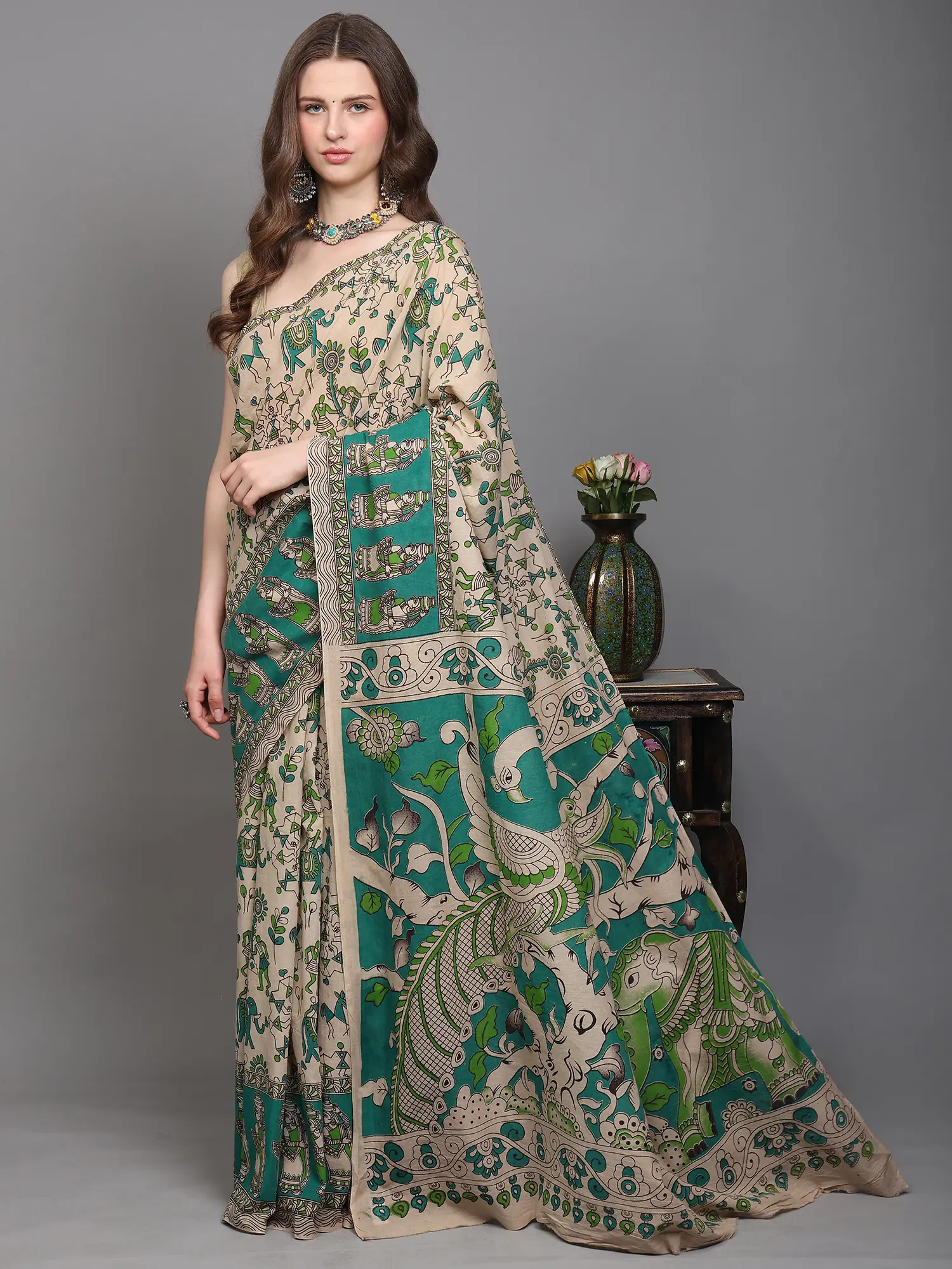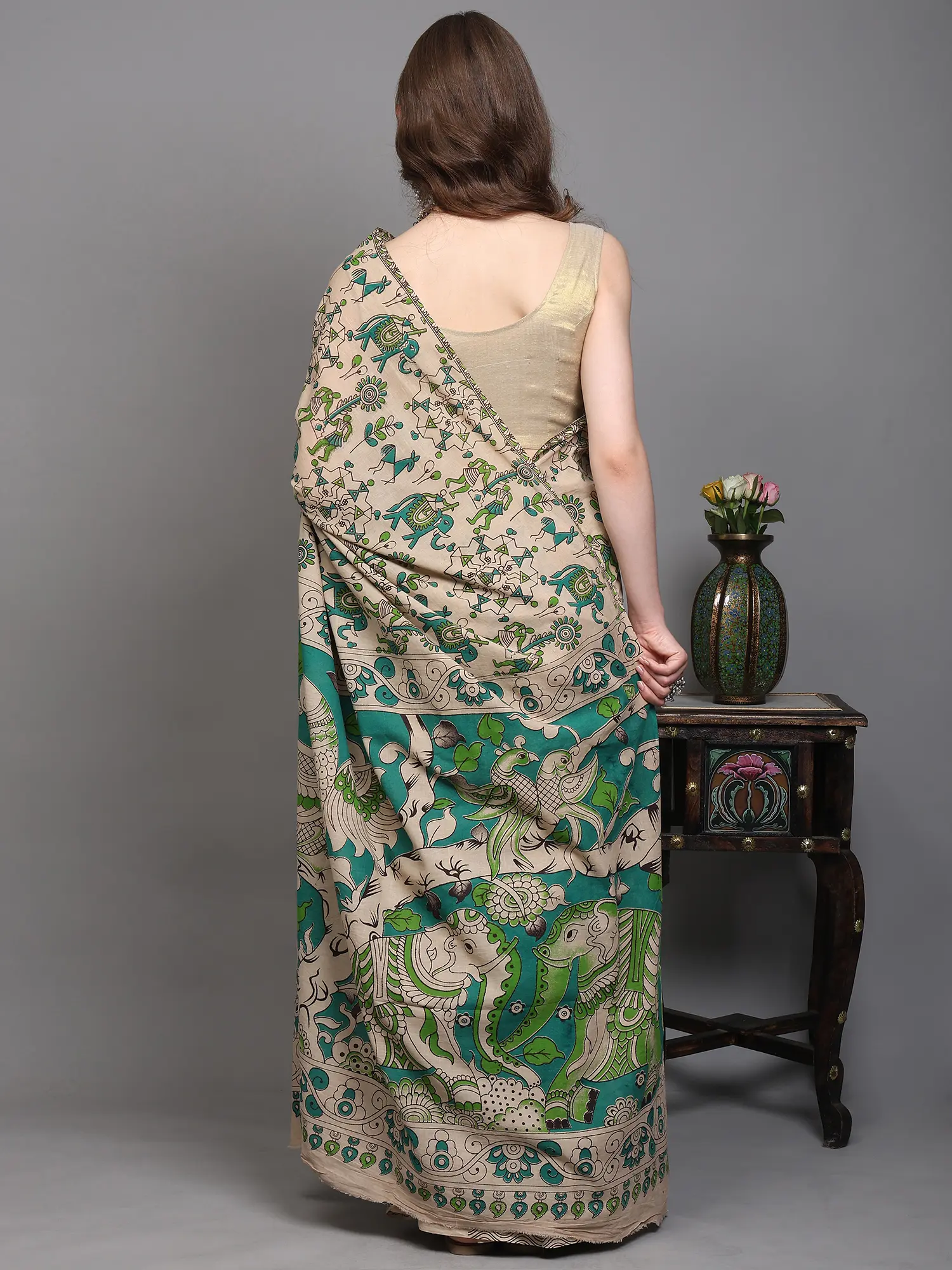 Multicolor Tussar Silk Hand Painted Pen Kalamkari Saree With Designer Pallu