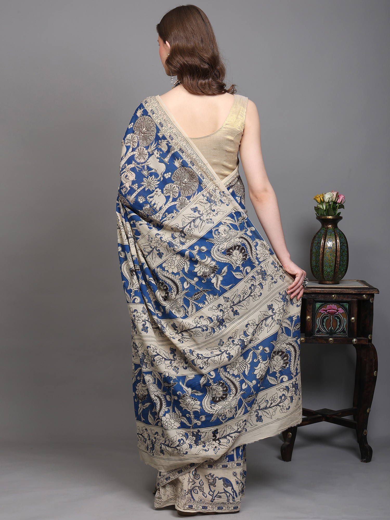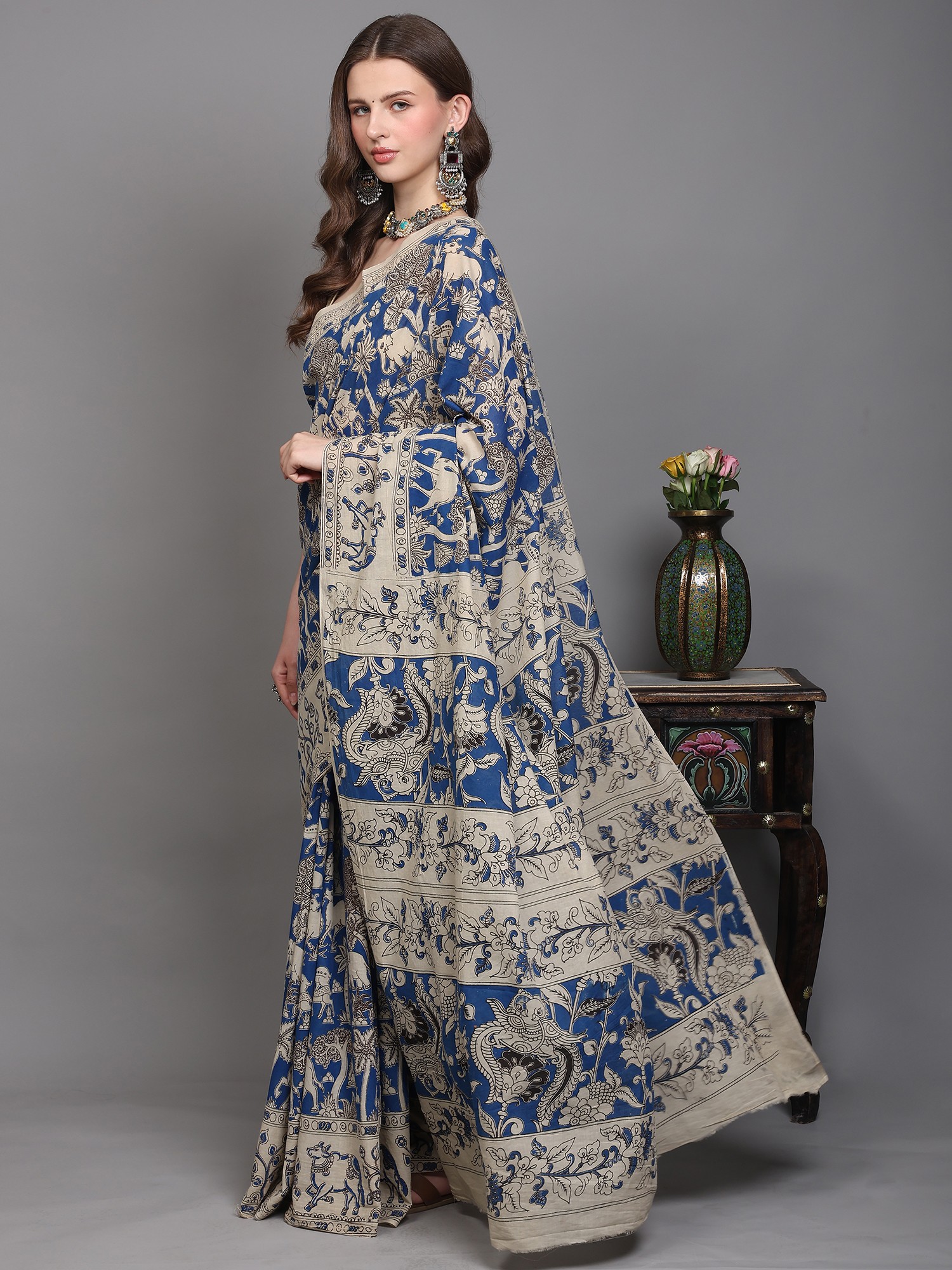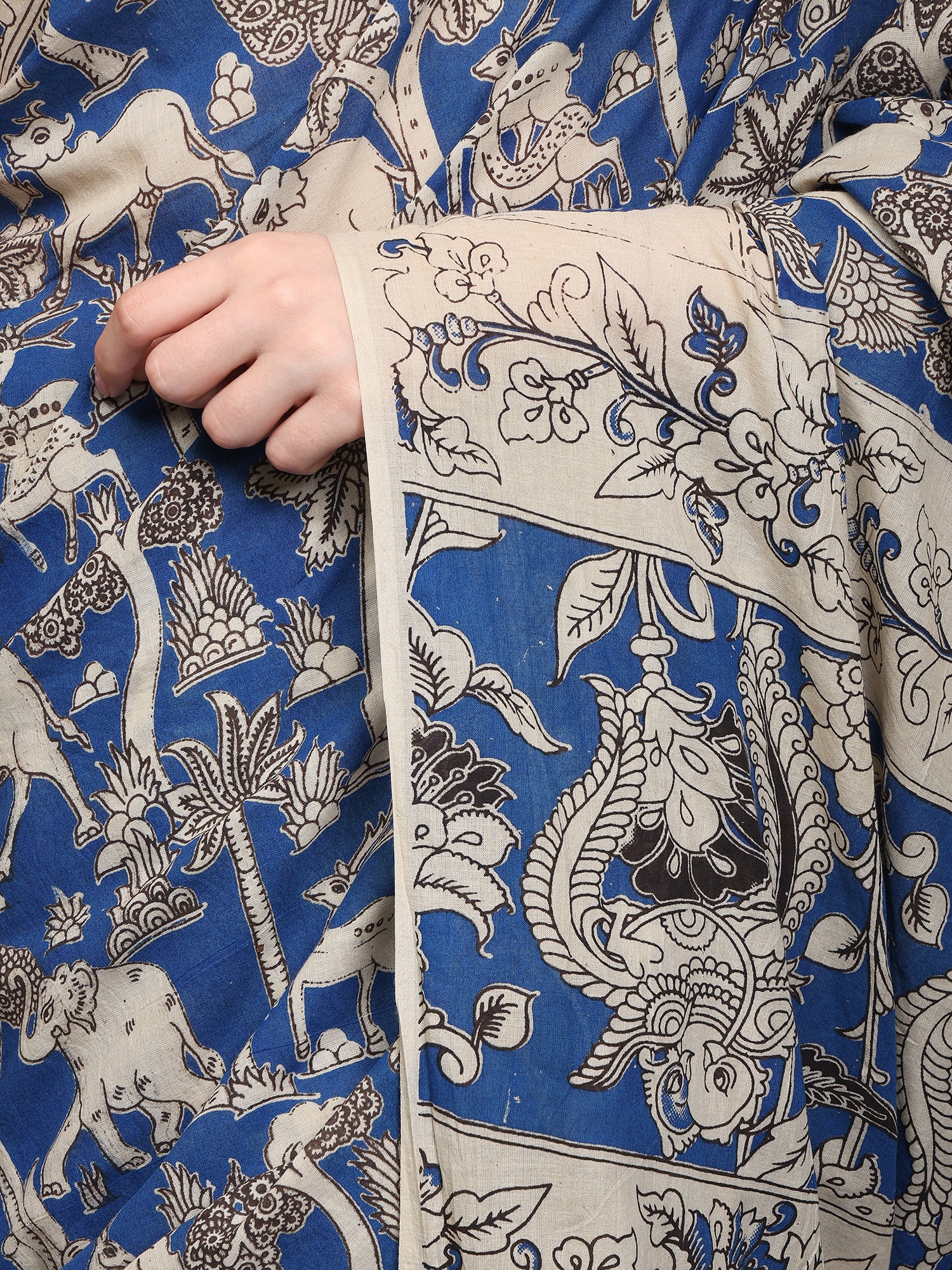 Parisian-Blue Pure Cotton Kalamkari Blocked Printed Fabric