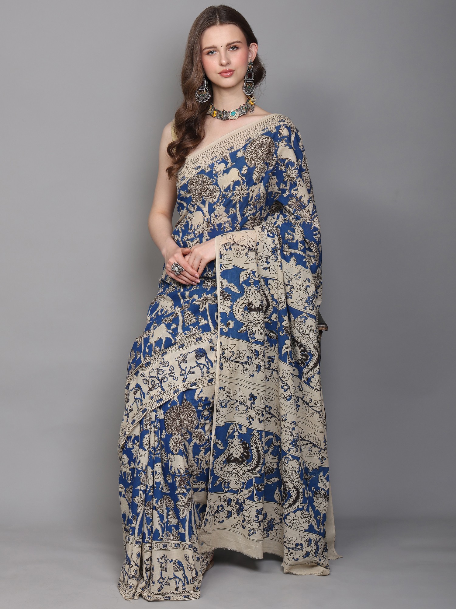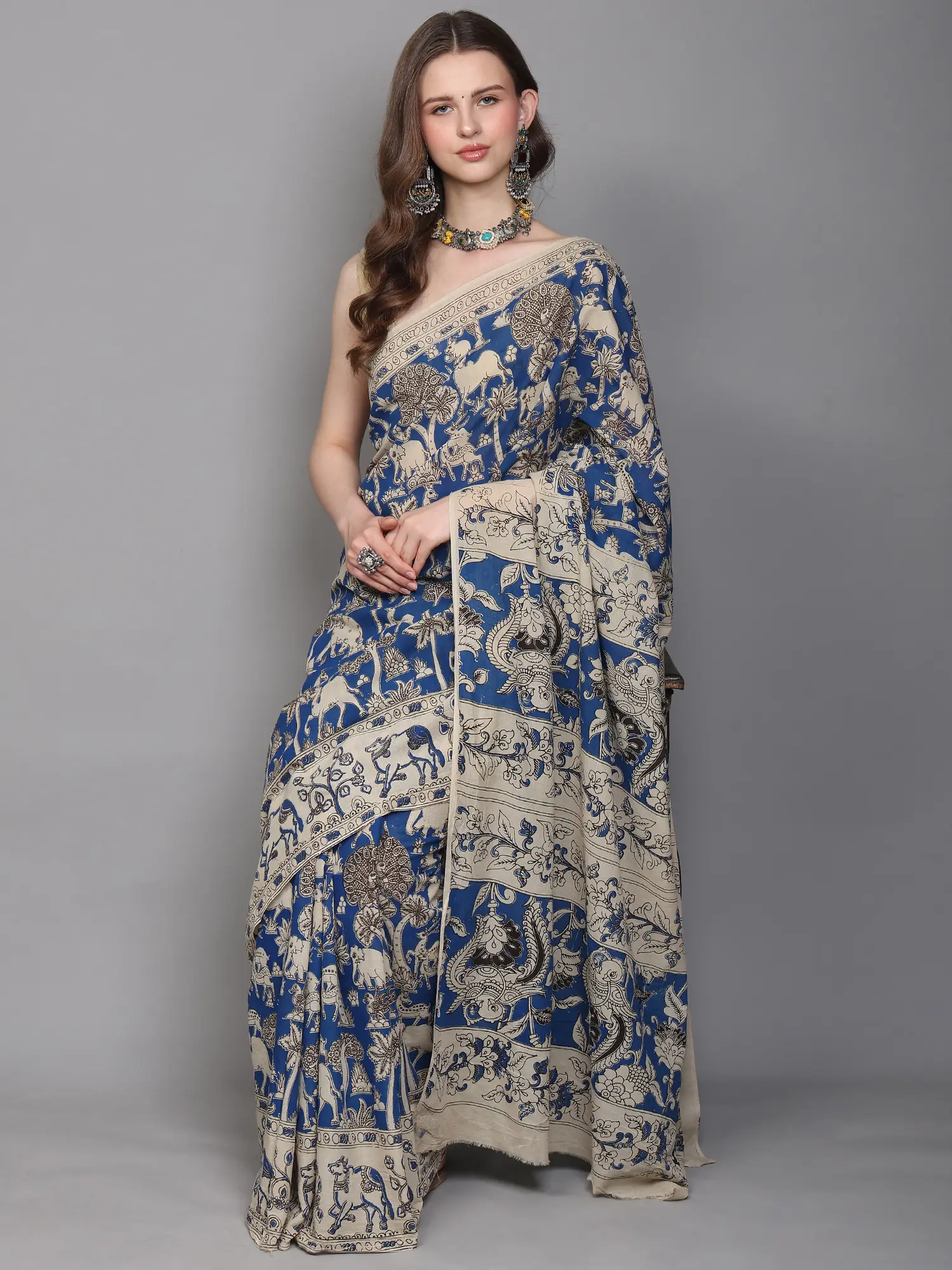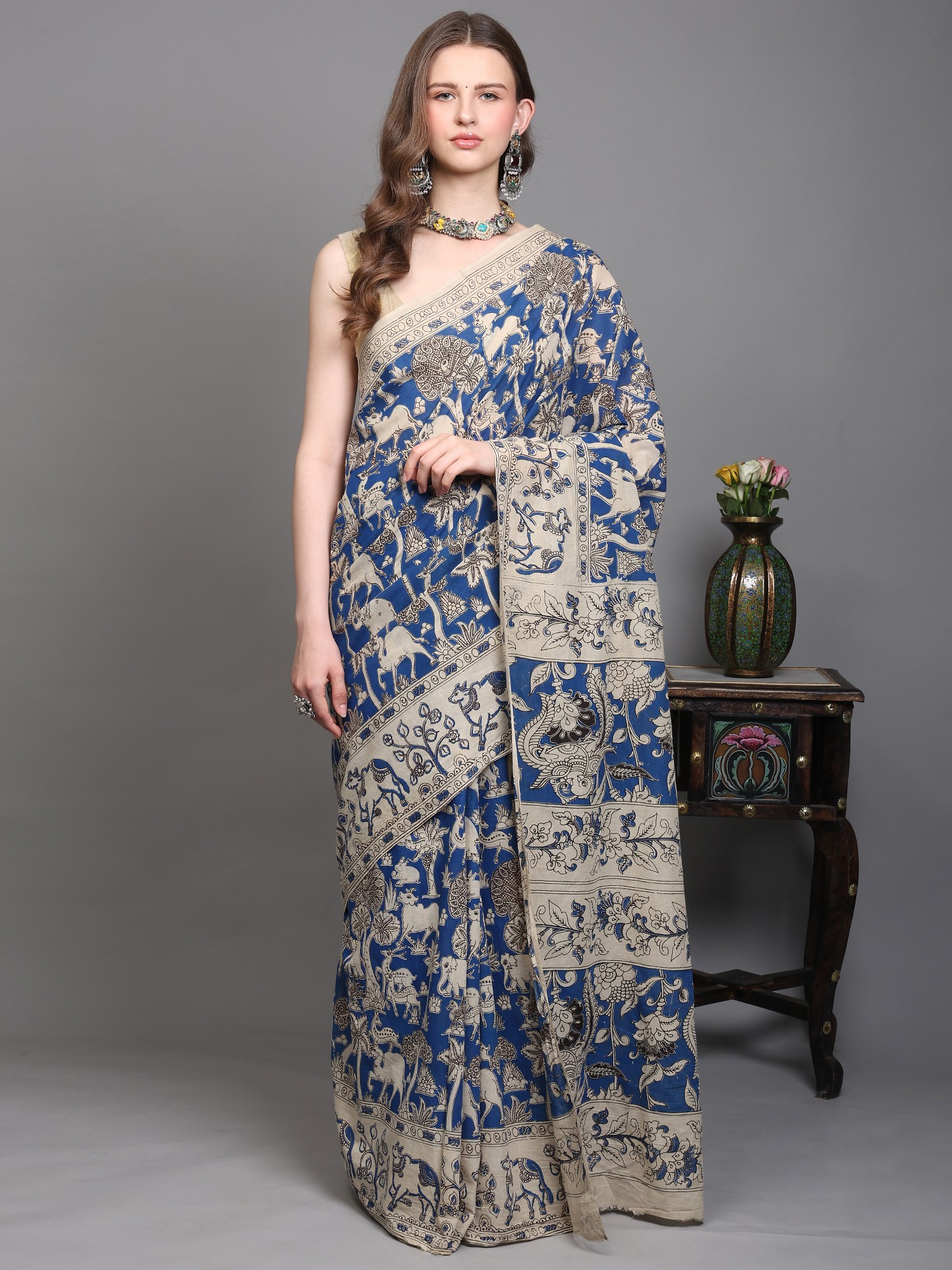 Parisian-Blue Pure Cotton Kalamkari Blocked Printed Fabric
