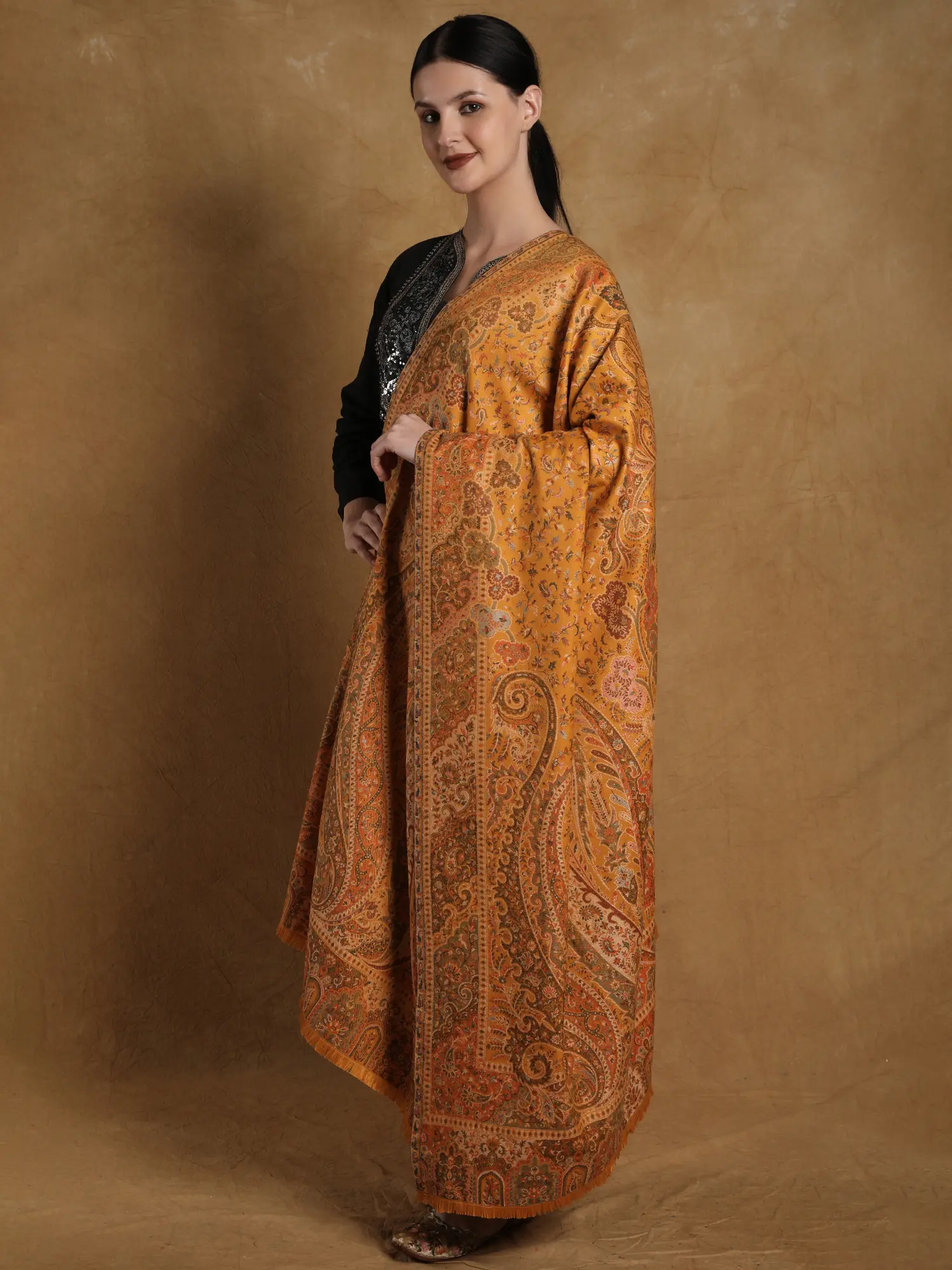 This “Amritsar-made Kani Jamawar Wool Shawl” is a tribute to exceptional craftsmanship and eternal beauty. Sprawled across its opulent fabric are vivid, colorful weaved flowers, each whispering a narrative of tradition and artistic mastery.