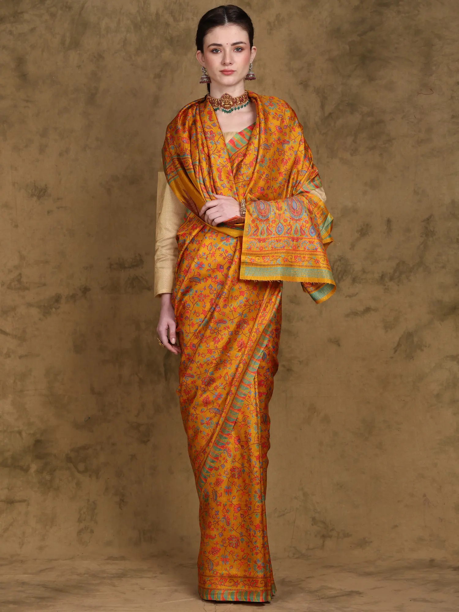 Pastel-Yellow Digital Printed Kani Polyester Saree with Floral Border and Shawl