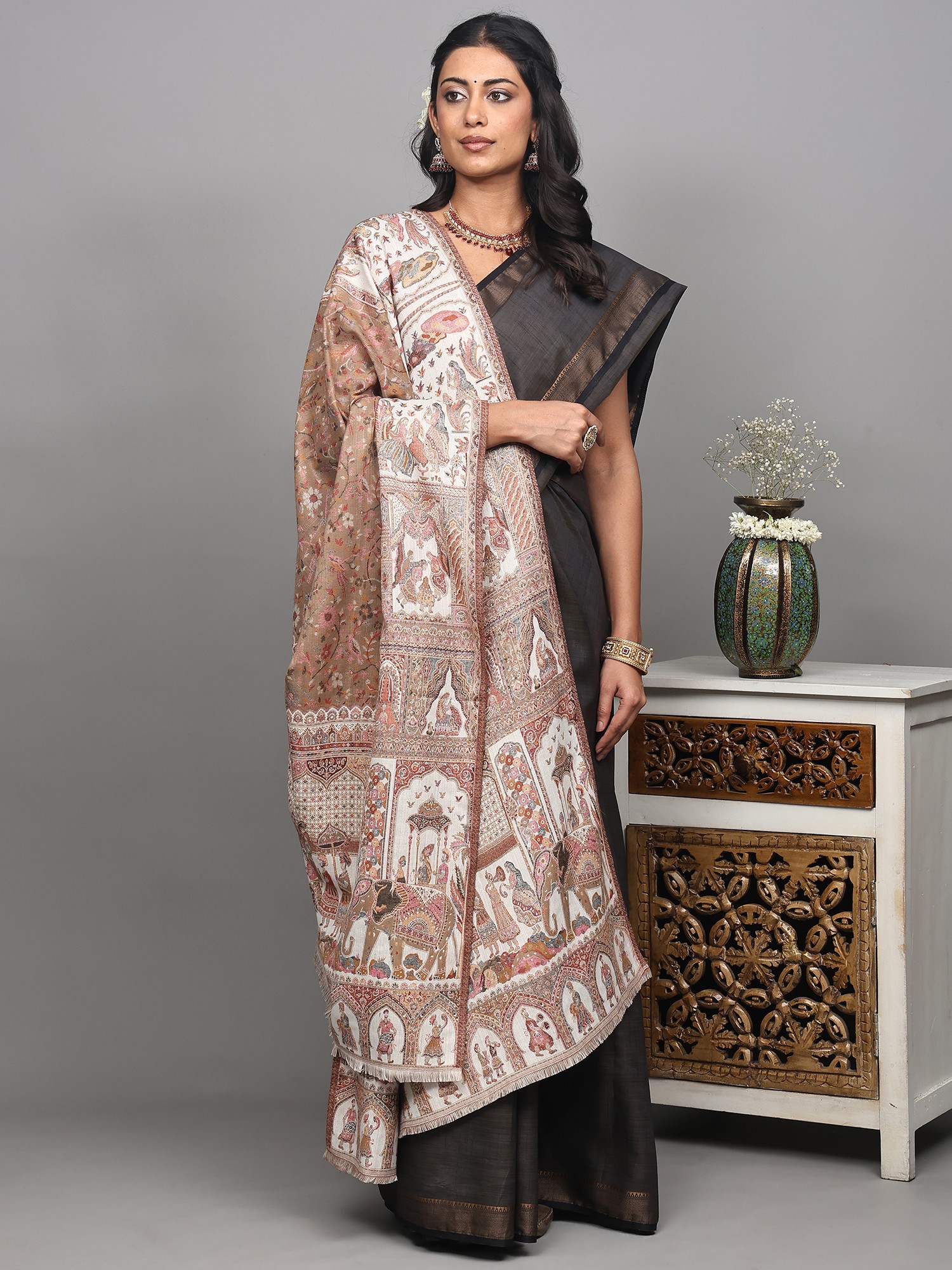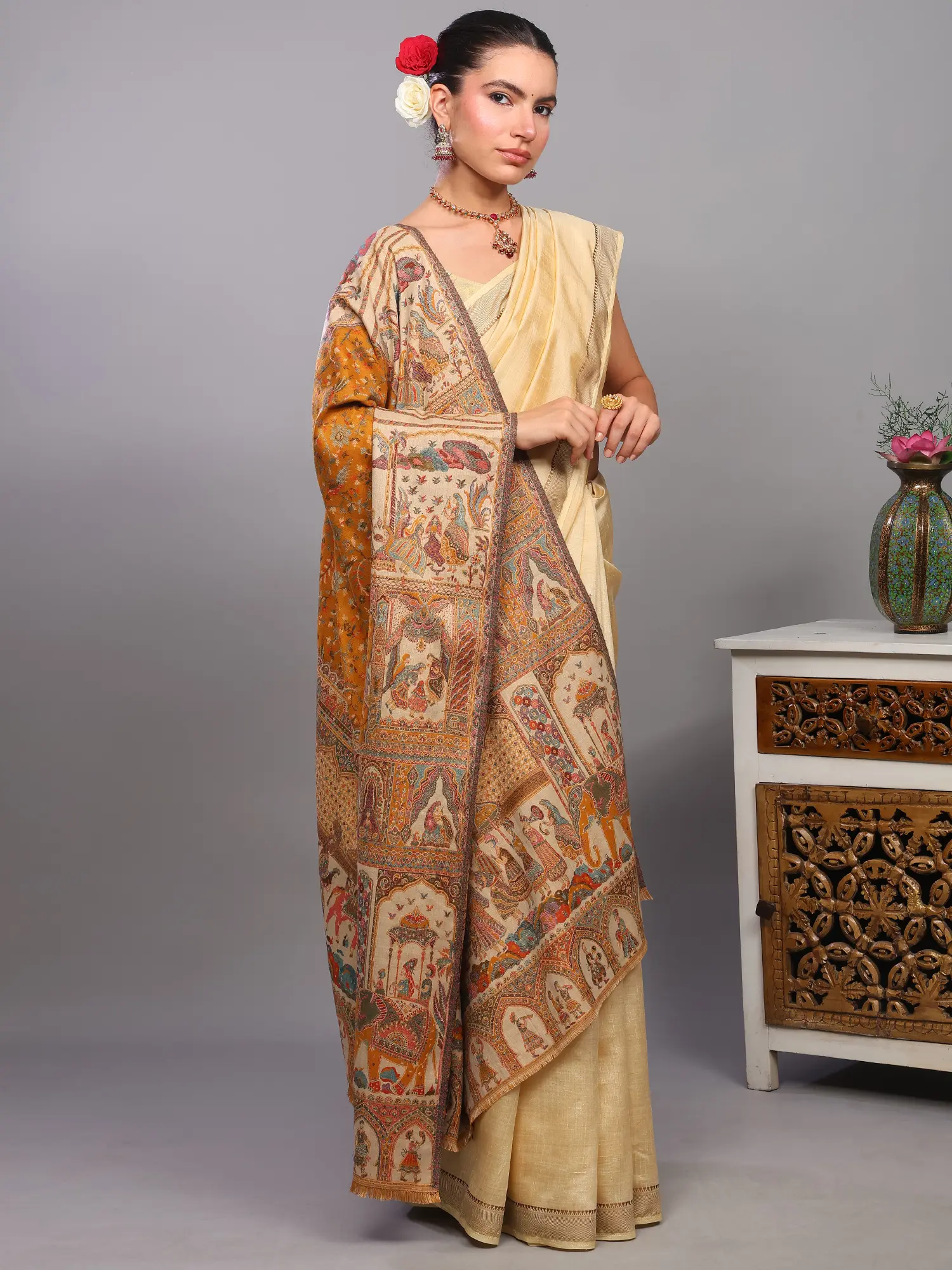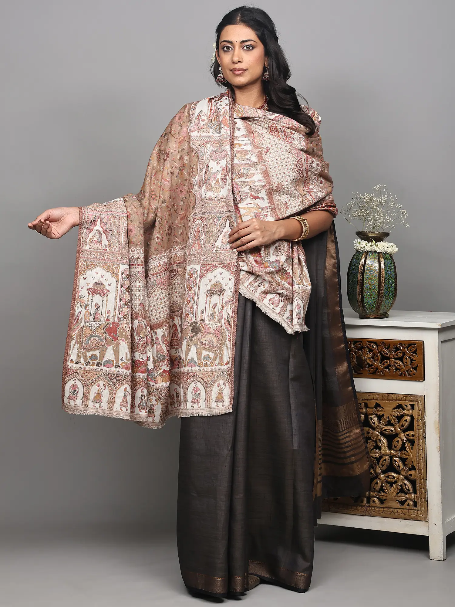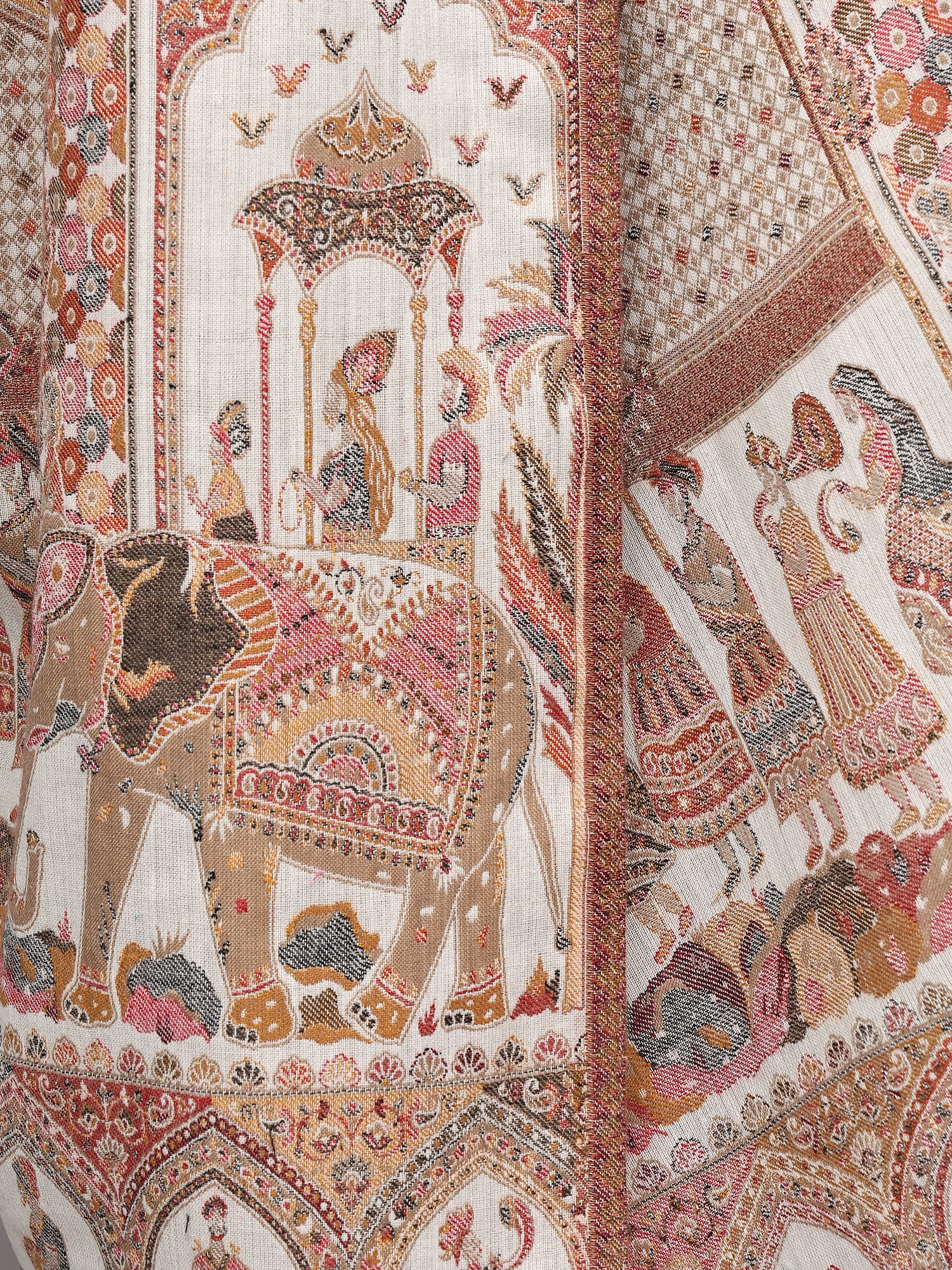 Dune-Brown Kani Pashmina Shawl From Kashmir with Kalamkari Hand Embroidery