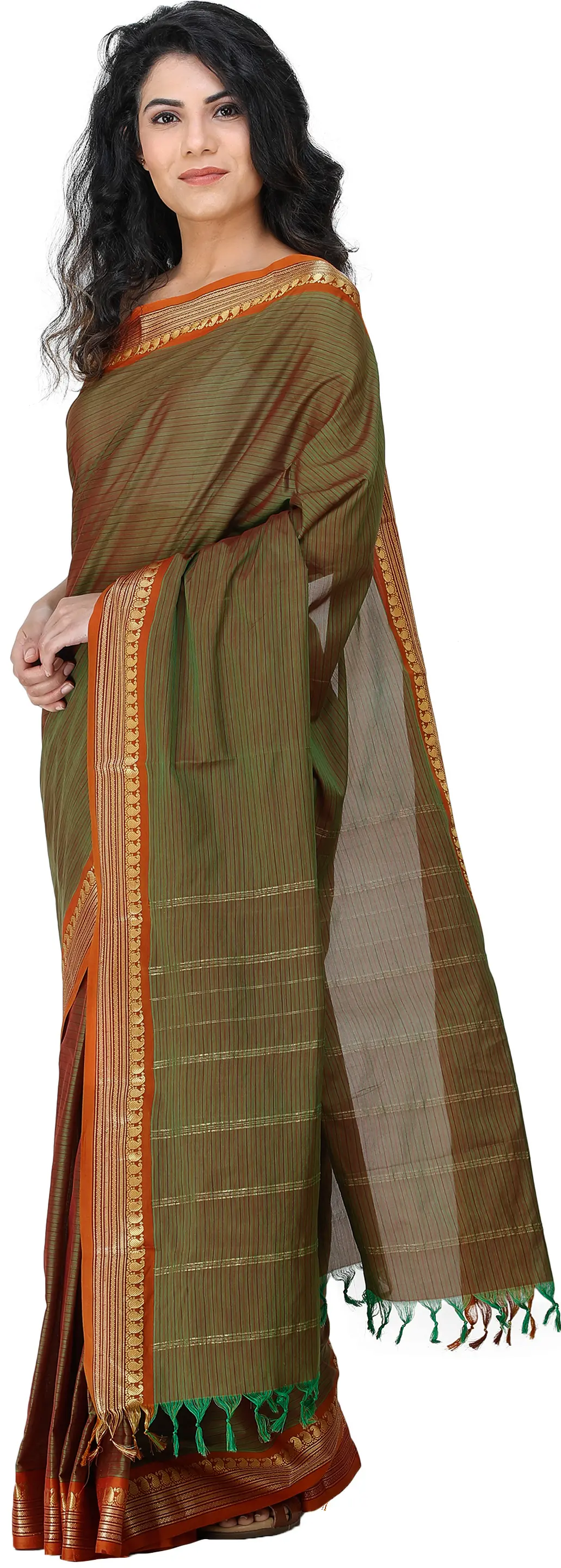 The saree field is covered in parallel running thin lines which add to it a beautiful symmetry, which is contrasted and balanced by the golden weave of floral vine on the border.