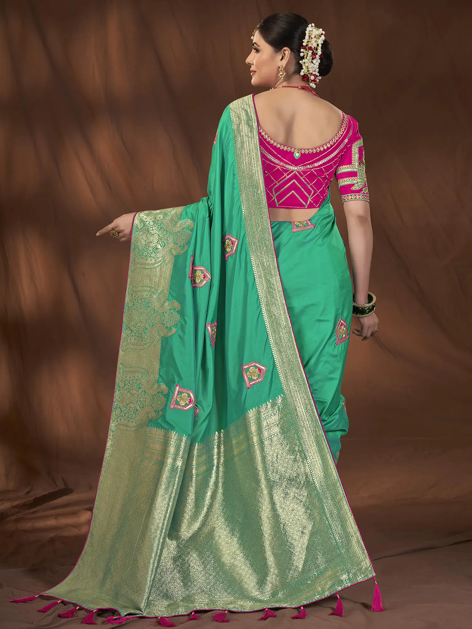 Party Wear Vichitra Silk Saree With Gold Zari Work On Border And Motifs All-Over