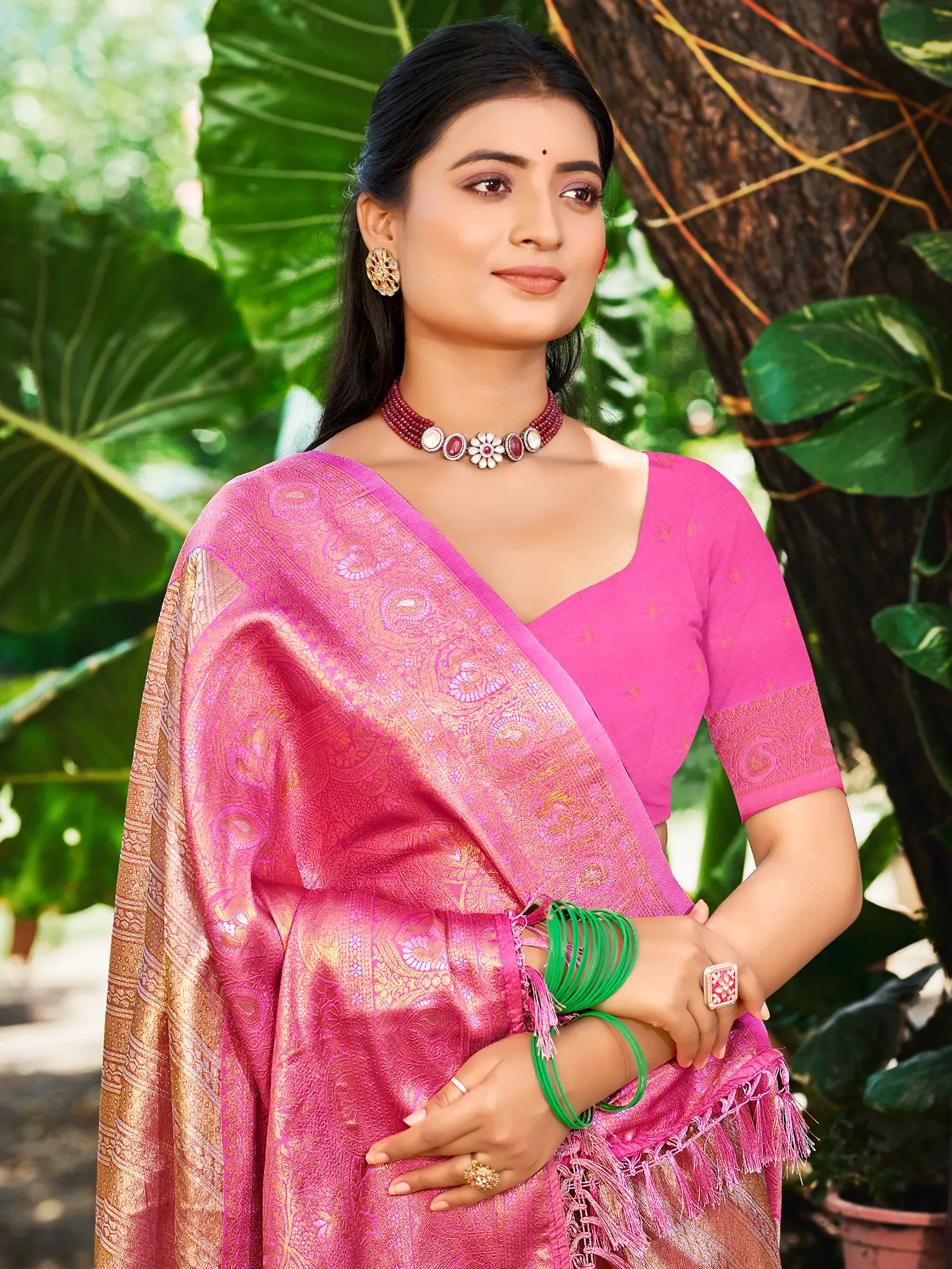 Embrace the epitome of traditional Indian artistry with this breathtaking Kanjivaram silk saree. Renowned for their opulent weave and rich heritage, Kanjivaram silks are a testament to centuries-old craftsmanship. This particular piece showcases the quintessential South Indian weaving technique, presenting a luxurious fabric that drapes beautifully and shimmers with an inherent glow. The intricate patterns woven into the silk tell a story of tradition, making each saree a unique work of art.