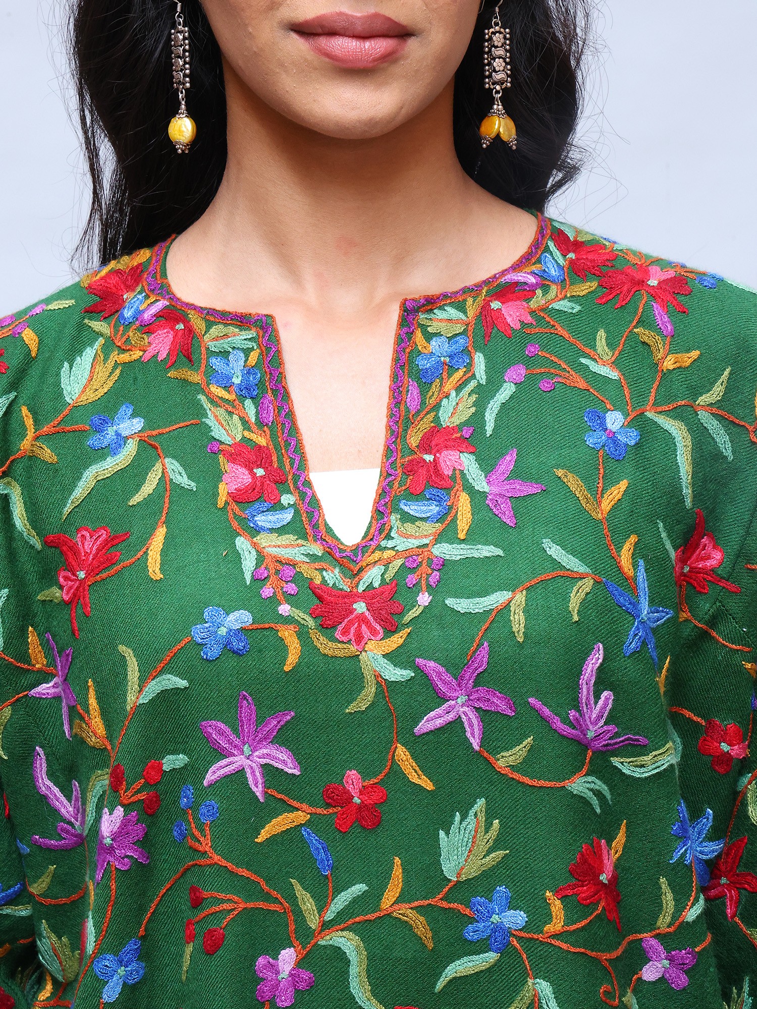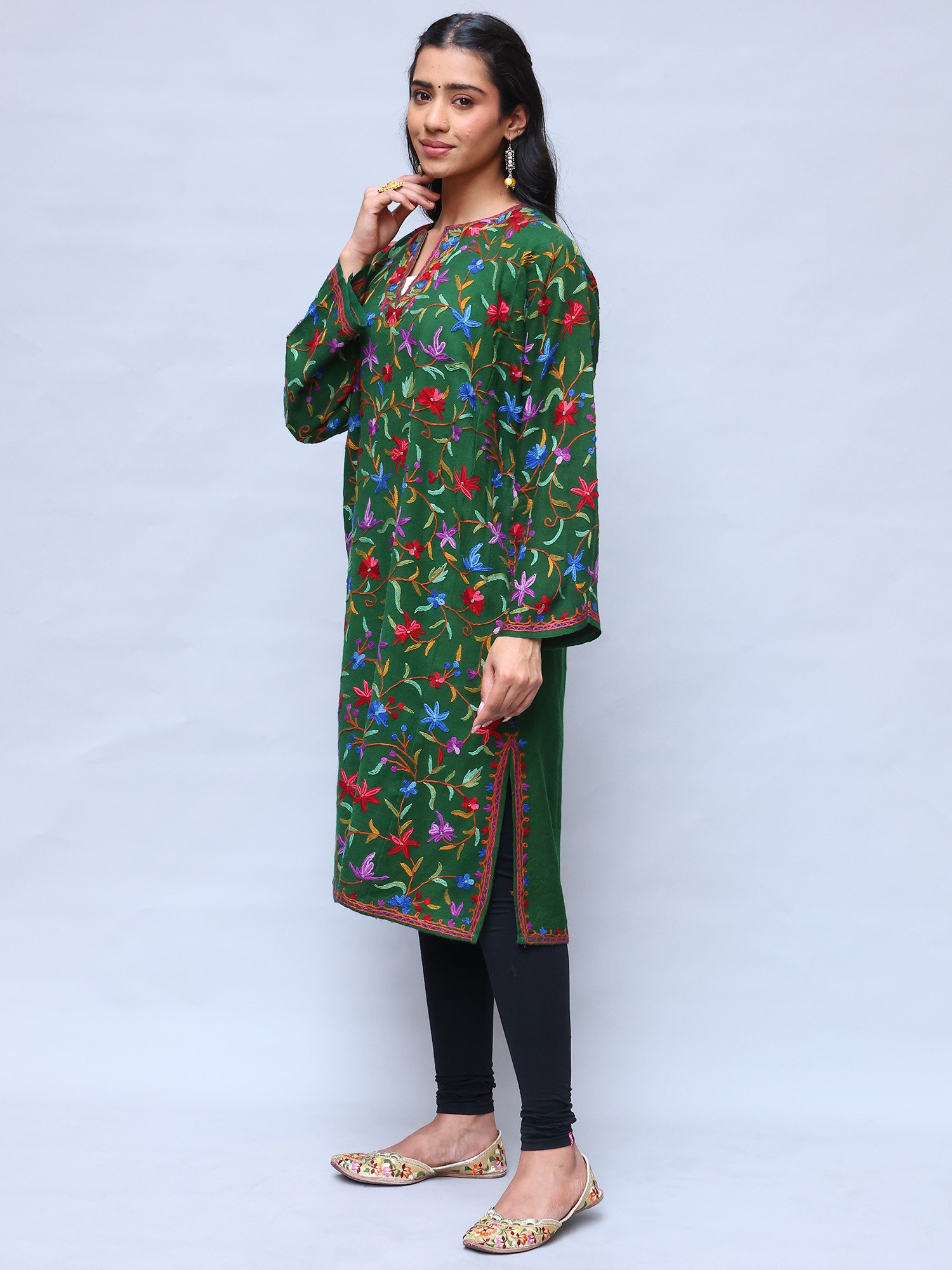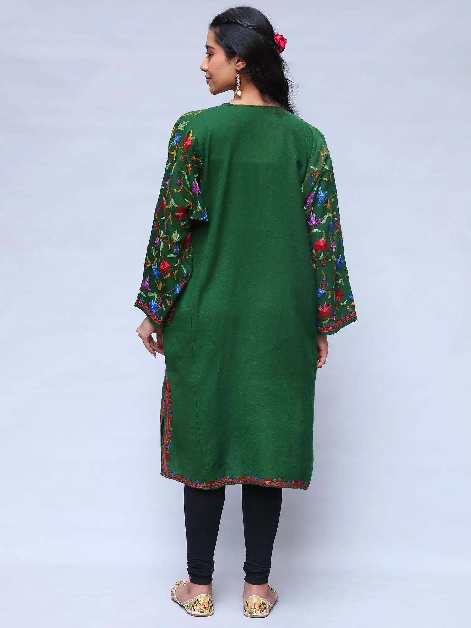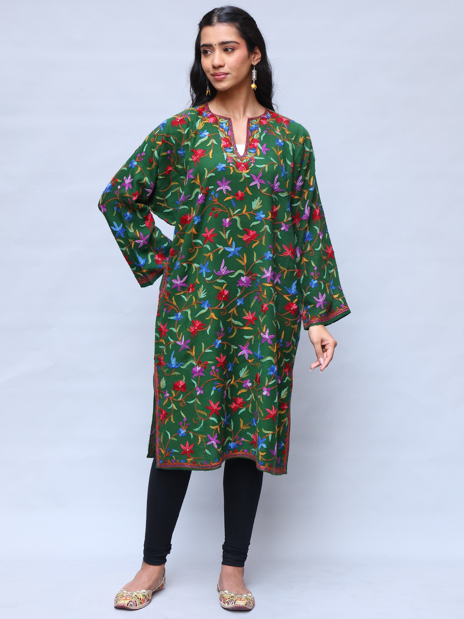 This wool phiran is a versatile piece that can be styled in countless ways. Dress it up with elegant jewelry and heels for a sophisticated evening look, or pair it with leggings and boots for a more casual, everyday ensemble. The vibrant colors and intricate embroidery make it a statement piece that will elevate any outfit. Whether you're attending a special occasion or simply running errands, this phiran will add a touch of elegance and cultural flair to your style. It’s not just an item of clothing; it's an expression of your appreciation for art, culture, and timeless style.