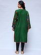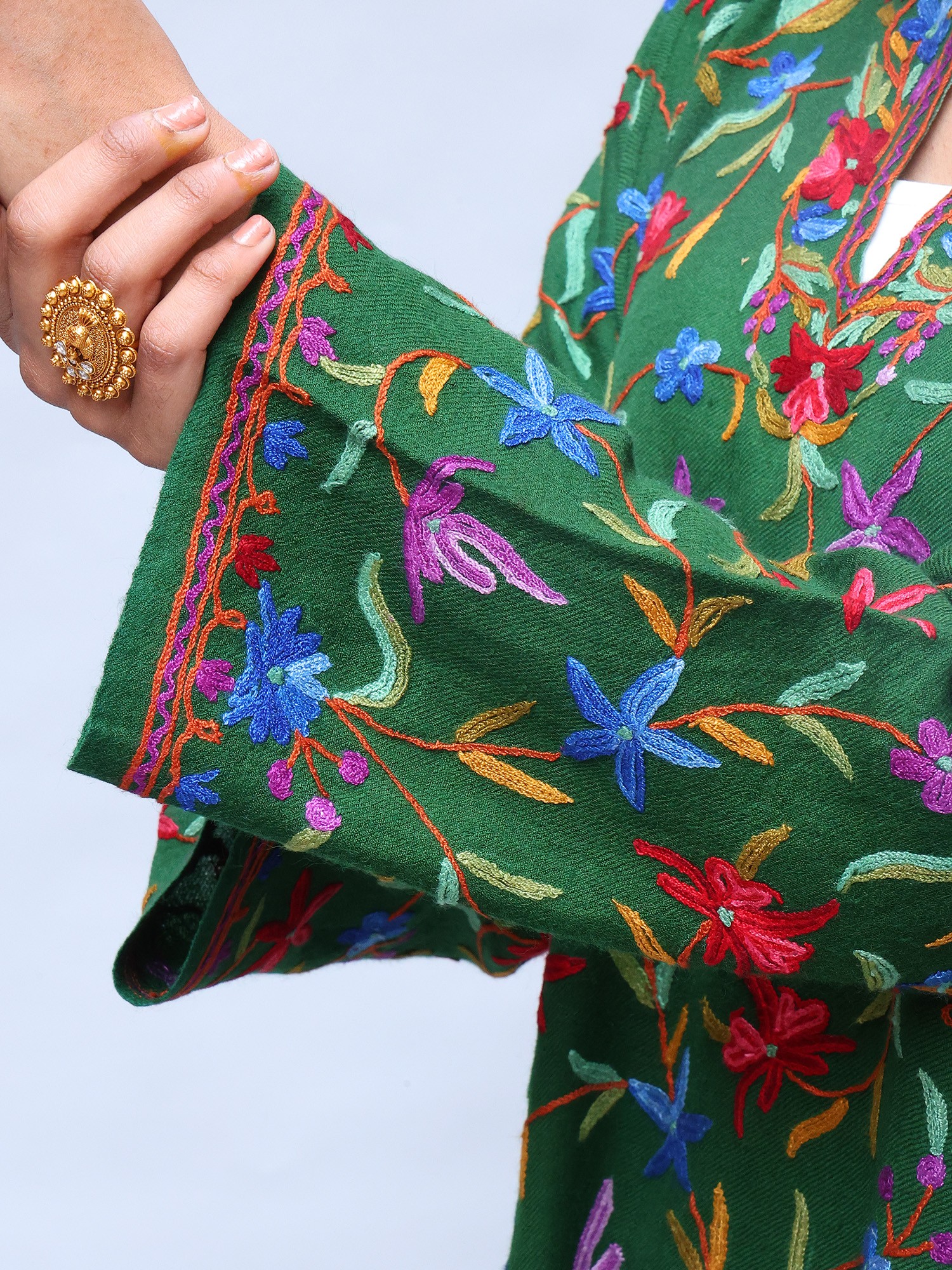 The phiran showcases the breathtaking artistry of Aari embroidery, a hallmark of Kashmiri craftsmanship. A vibrant floral jaal, or net, adorns the entirety of the phiran, transforming the rich, verdant wool into a canvas bursting with life. Notice the intricate details of each flower, meticulously stitched with colorful threads to create a mesmerizing tapestry of color and texture. The floral design, a signature element of Kashmiri textiles, adds a touch of timeless elegance and sophistication. Each stitch tells a story of dedication and passion, reflecting the rich cultural heritage of the region.