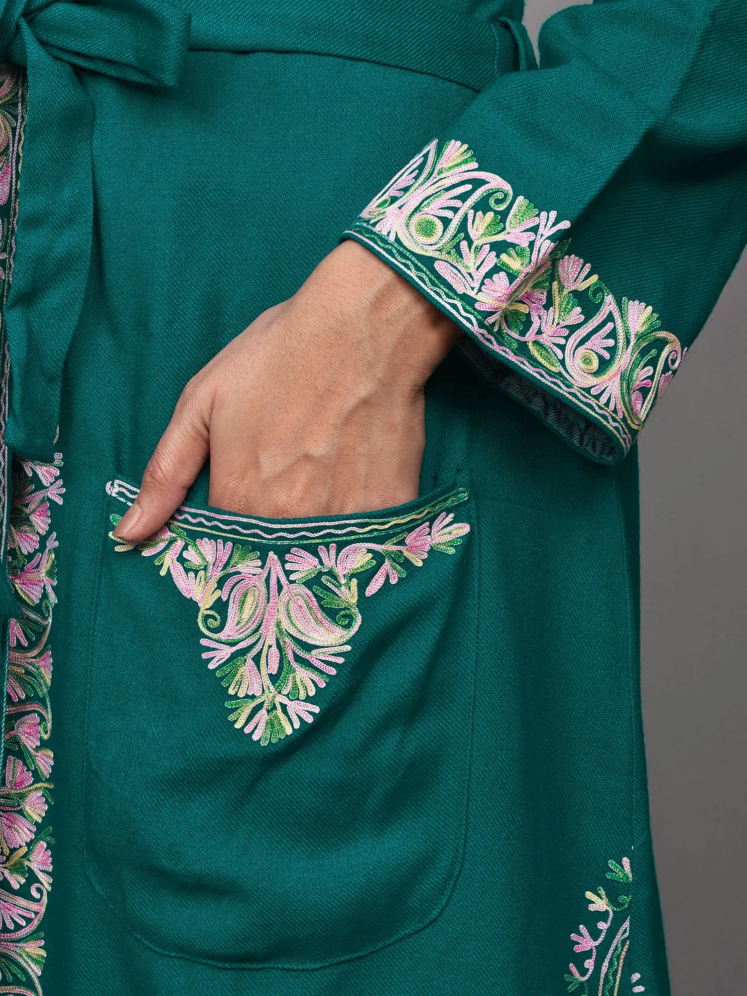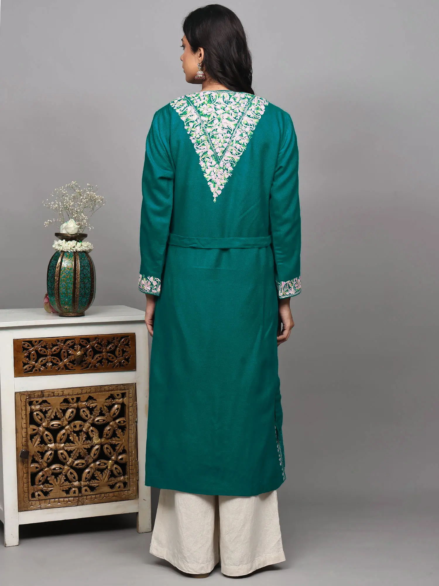 Immerse yourself in the rich heritage of Kashmiri craftsmanship with this exquisite robe. Crafted from a luxurious wool blend, this garment offers both supreme comfort and a timeless aesthetic. The deep, alluring teal hue serves as a canvas for the vibrant, hand-embroidered Aari work, a traditional Kashmiri embroidery technique renowned for its intricate patterns and fine detailing.