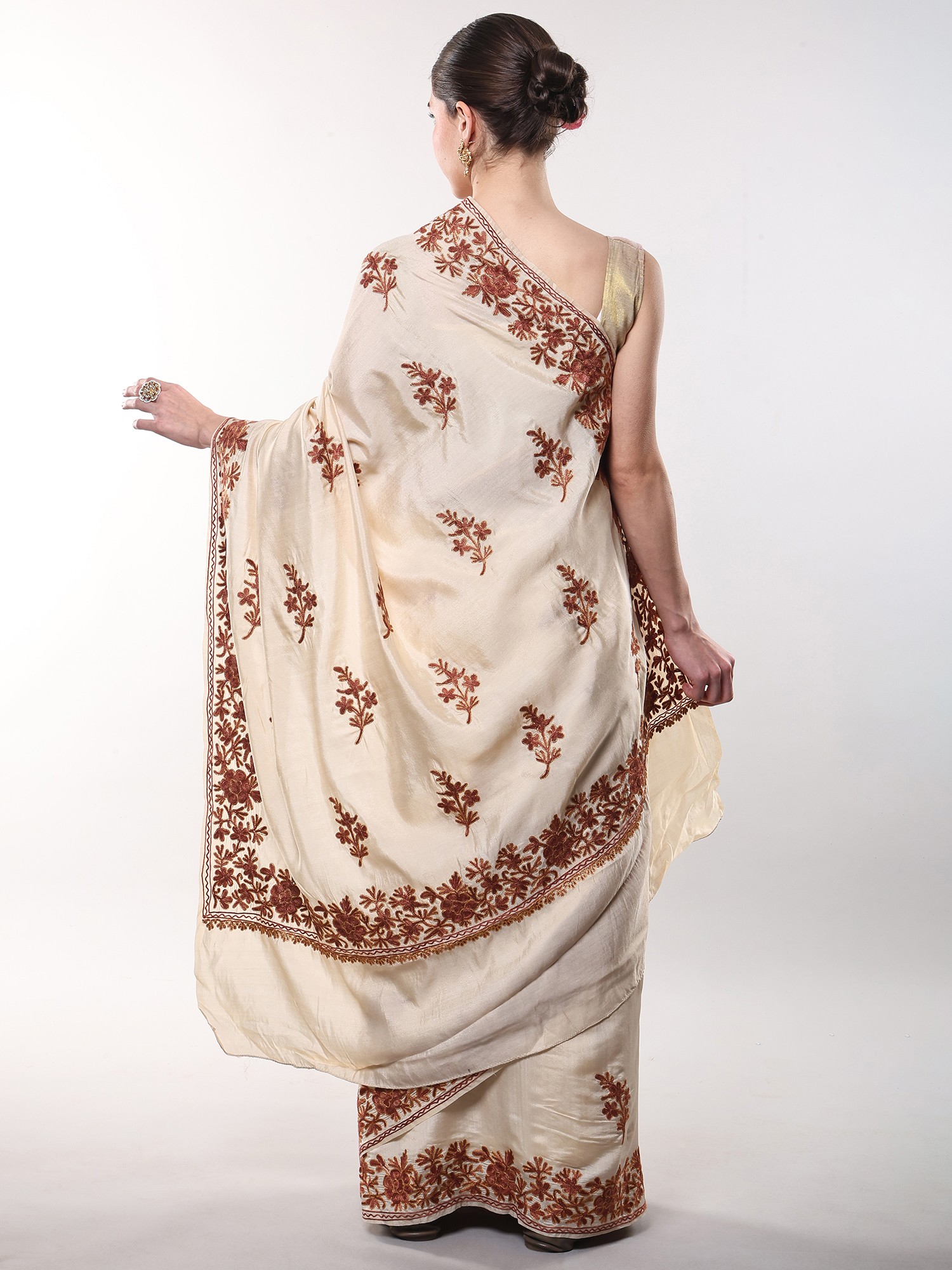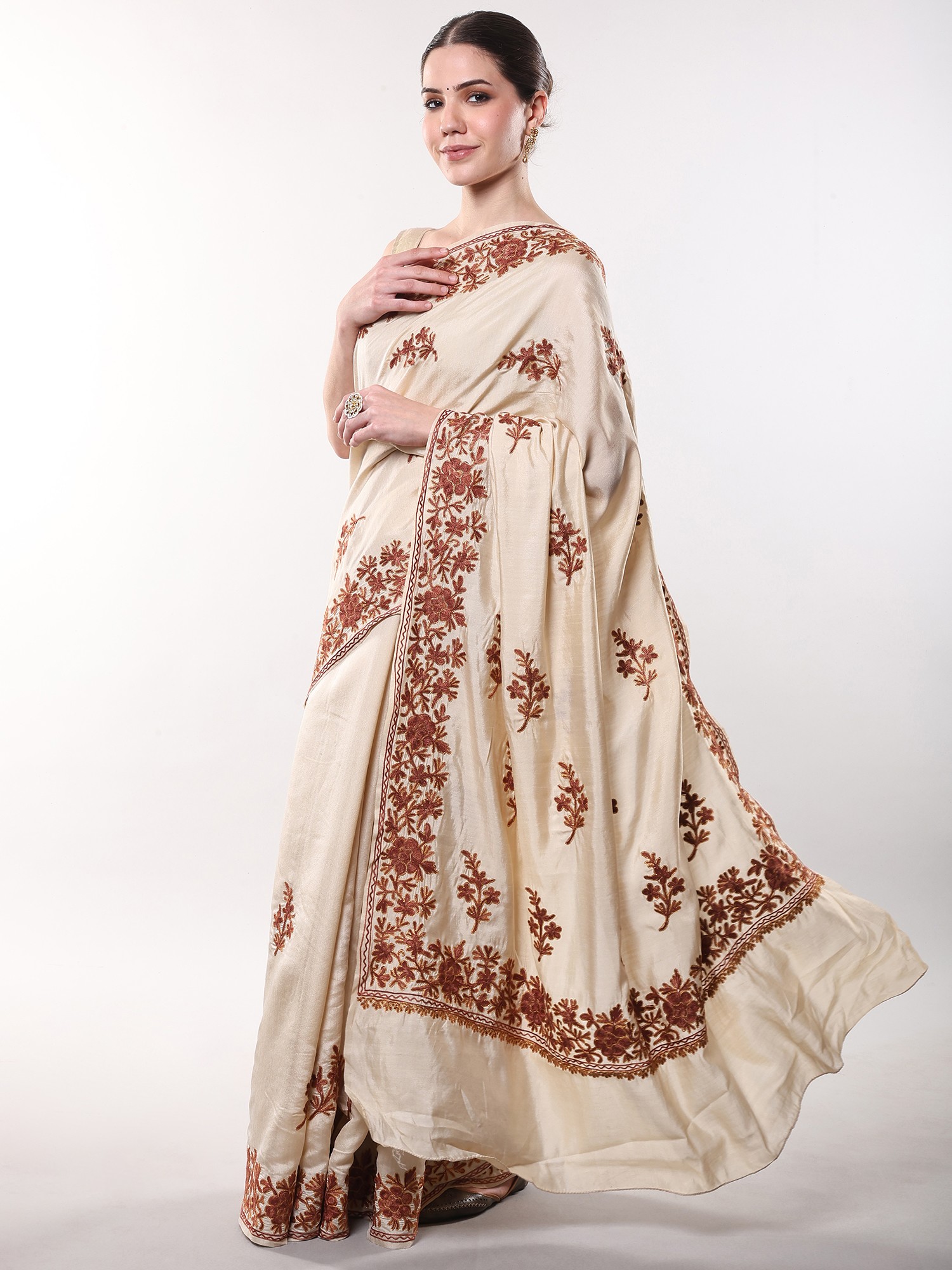 Georgette Kashmiri Saree with Chain Stitch Aari Embroidered Maple Leaf Vines
