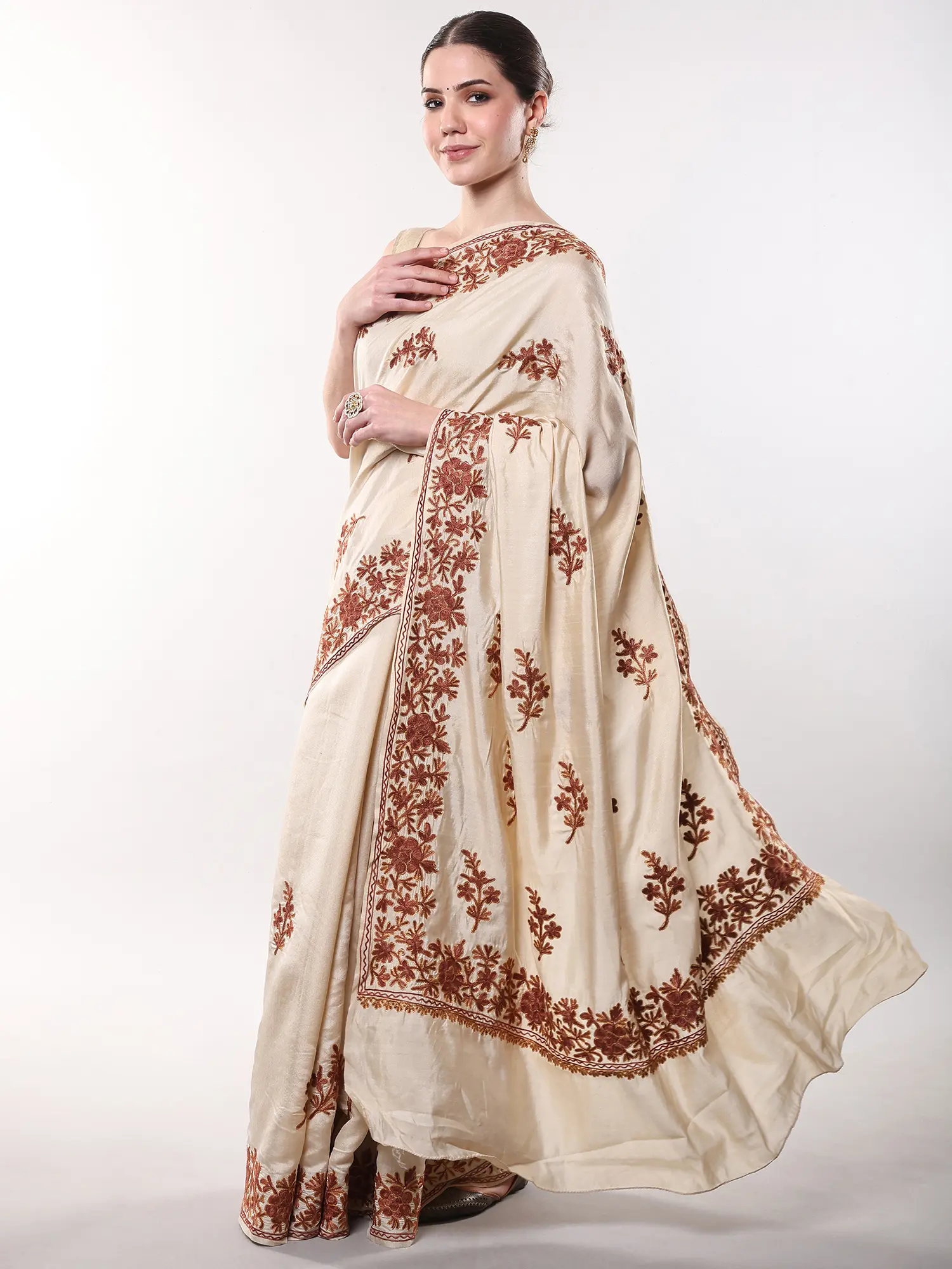 Kashmiri Saree with Aari Embroidered Floral Border and Pallu