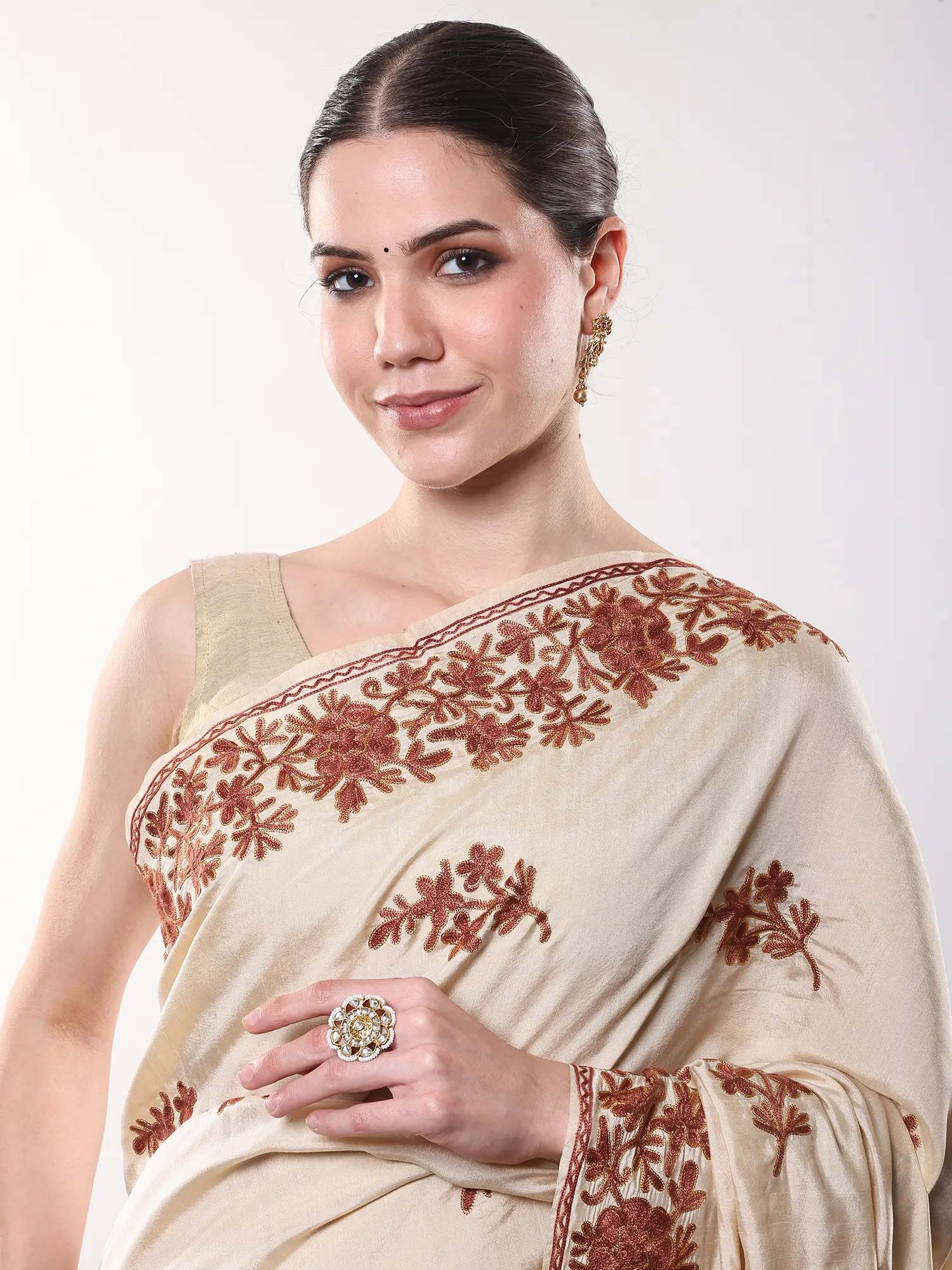 The exquisite Aari embroidery, rendered in a rich, earthy hue, flows gracefully along the border and adorns the pallu with captivating floral motifs. This detailed artistry creates a stunning visual contrast against the creamy base of the art silk, lending an air of understated opulence. The way the fabric catches the light, highlighting the subtle sheen and the depth of the embroidery, is truly captivating.