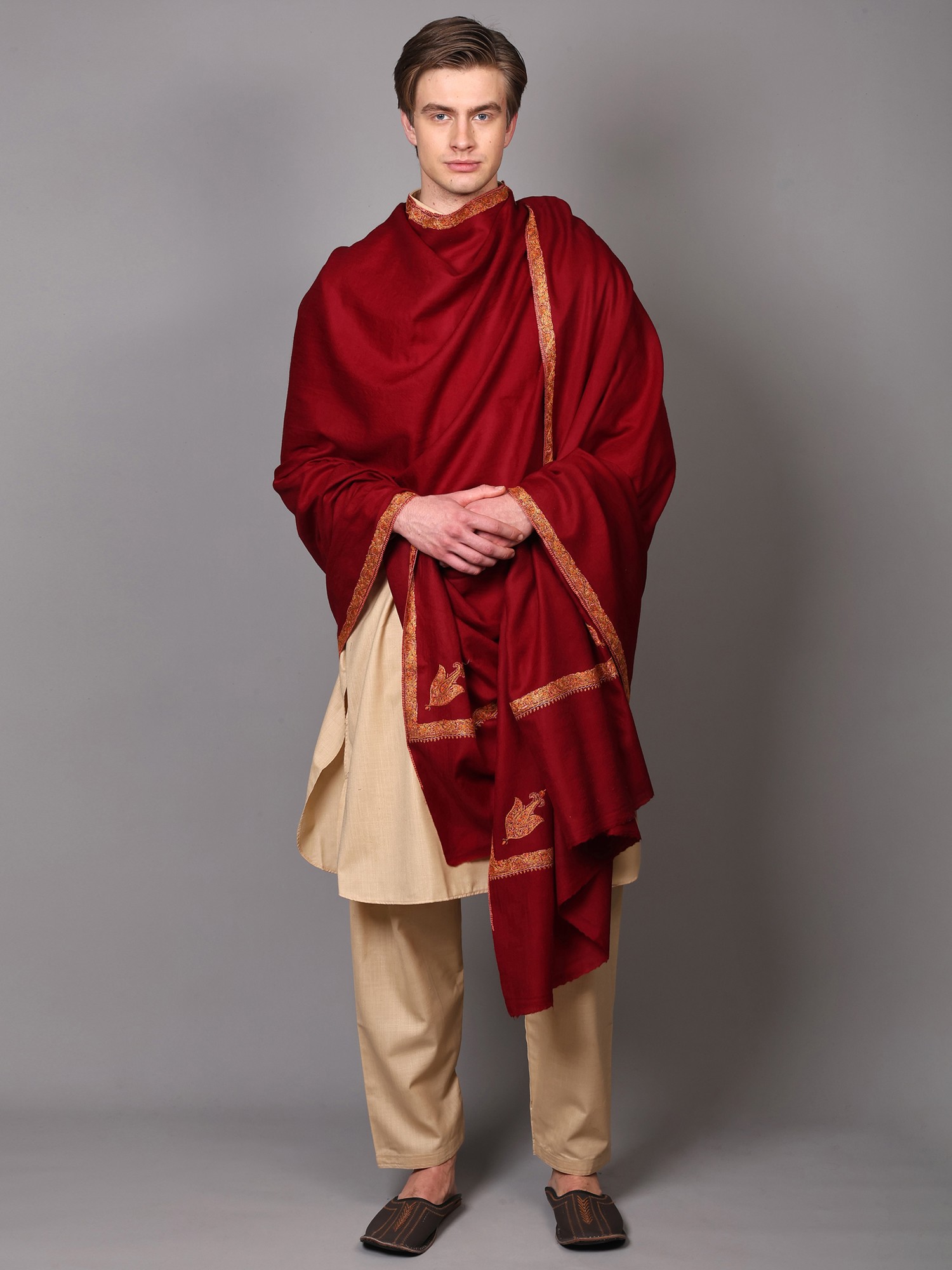More than just an accessory for warmth, this shawl is a statement piece. Its generous size allows for versatile styling options, whether draped elegantly over the shoulders for a formal occasion or wrapped around for a cozy, refined look on a cooler evening. It perfectly complements traditional Indian attire like kurtas and achieves a sophisticated ensemble. For those seeking to add a touch of understated opulence and artisanal beauty to their wardrobe, this hand-embroidered wool shawl from Kashmir is an exceptional choice. It embodies a fusion of comfort, tradition, and exquisite craftsmanship, destined to become a cherished heirloom.