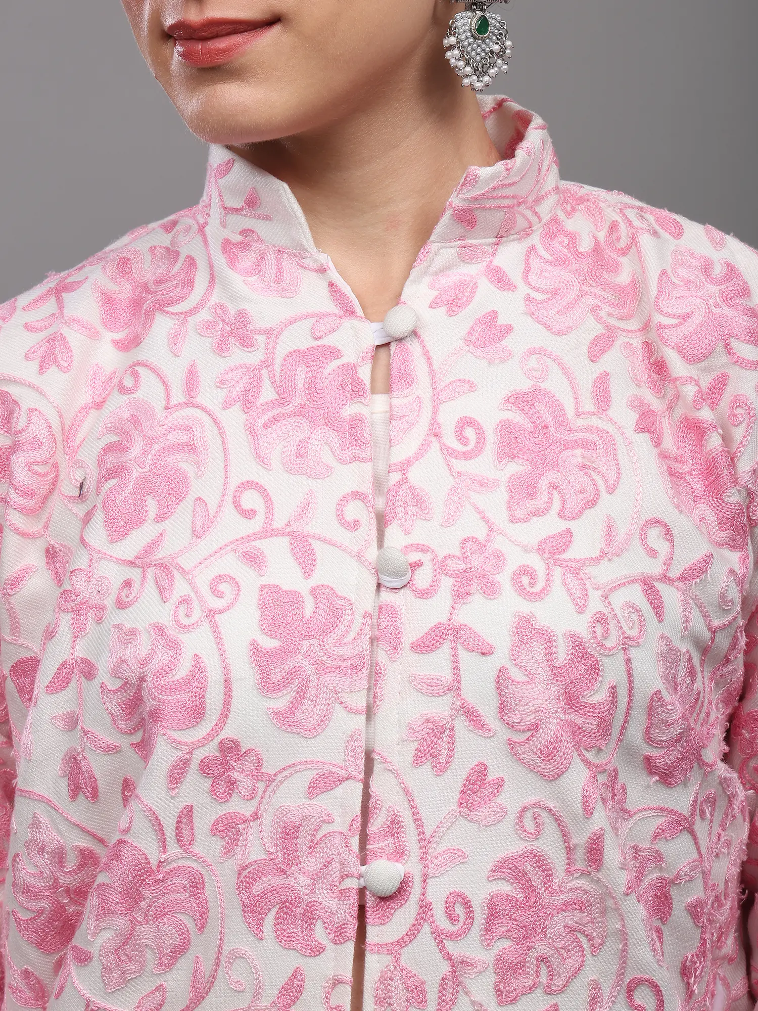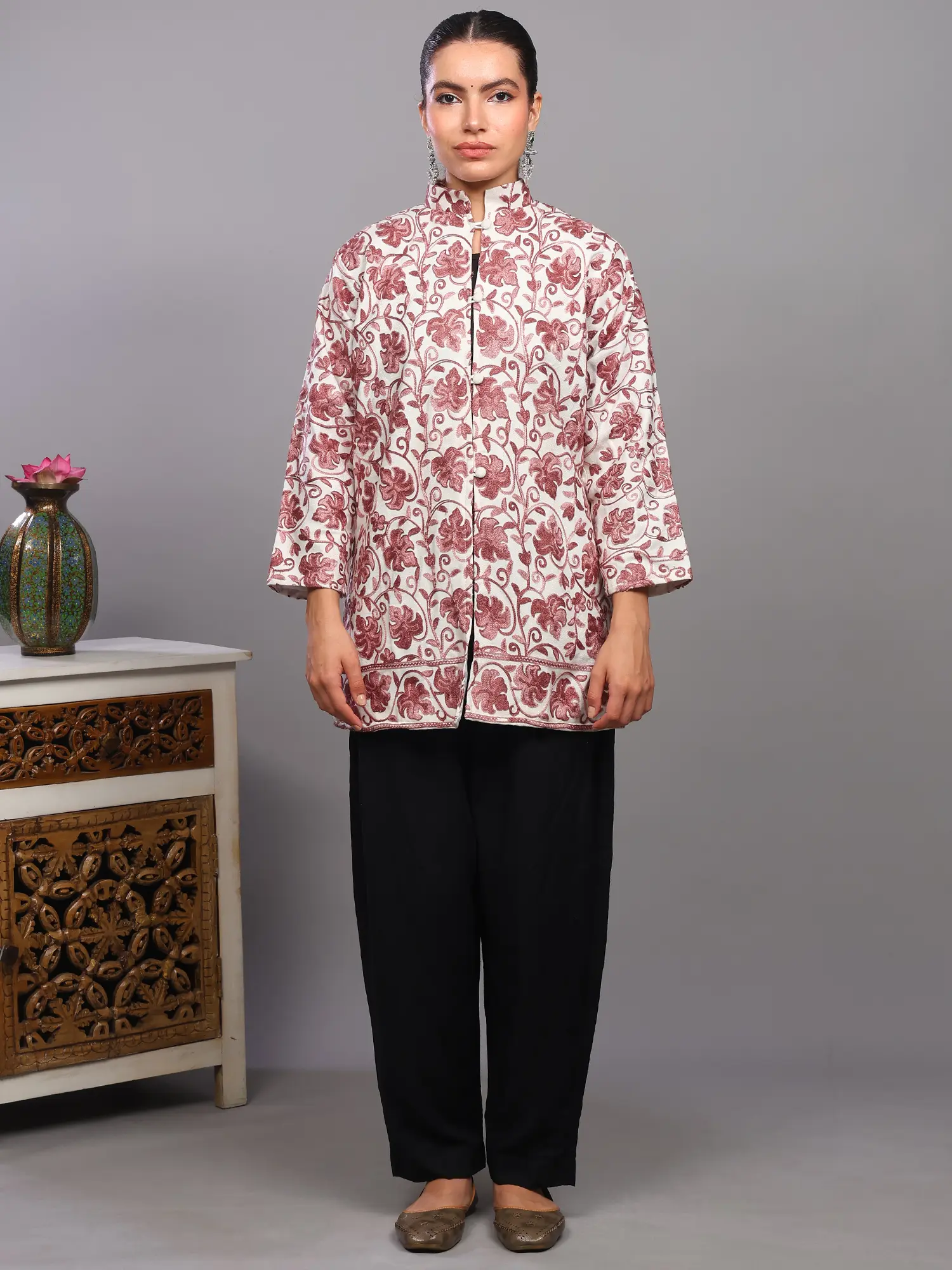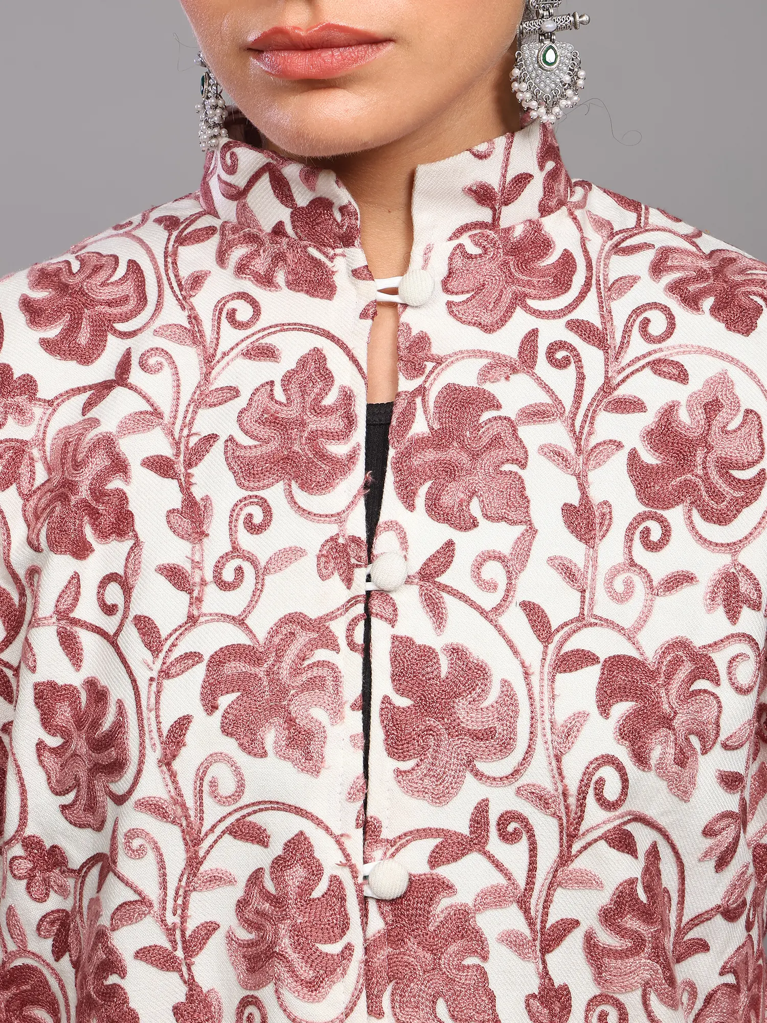Lucent-White Wool Kashmiri Short Jacket with Multicolor Floral Vine Aari Embroidery