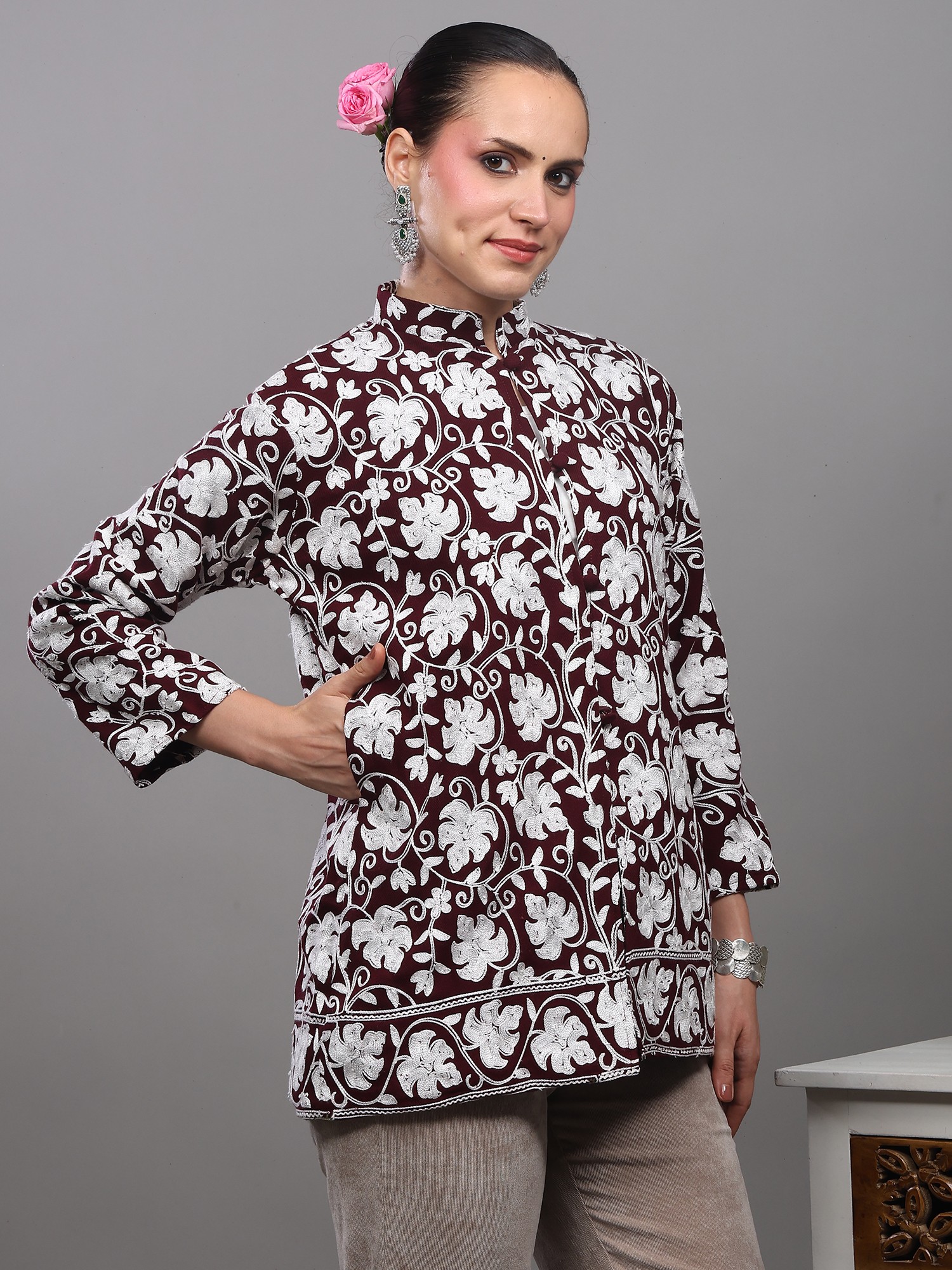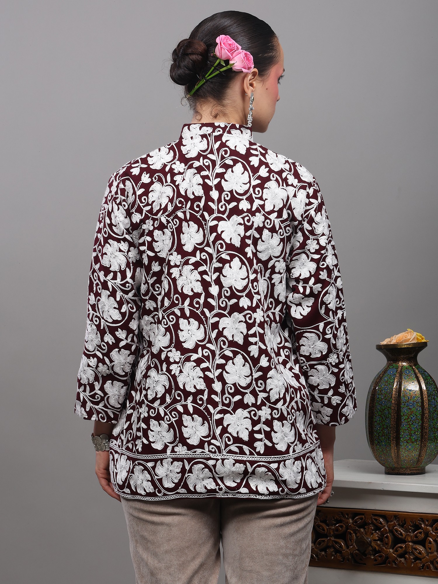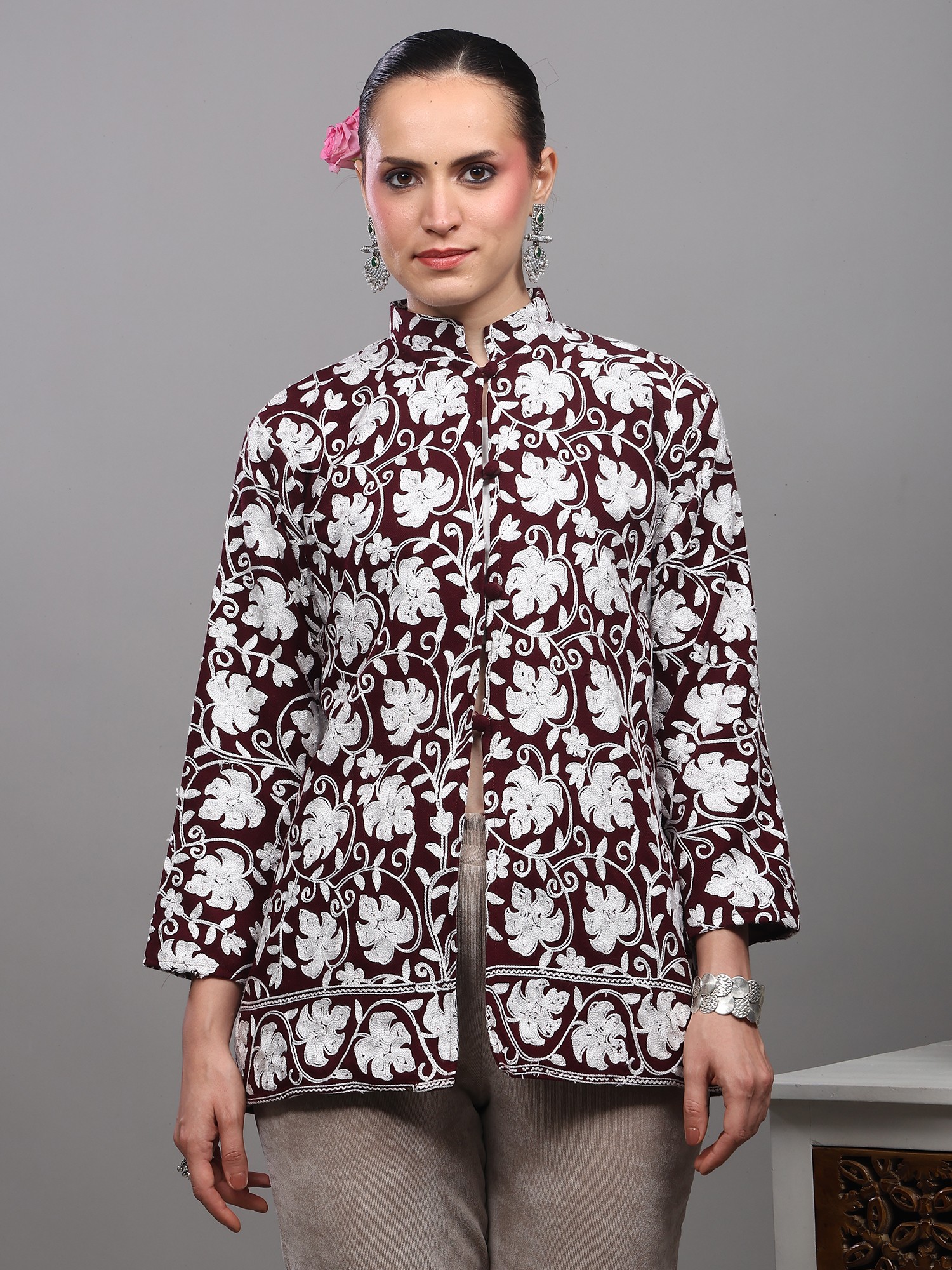 Lucent-White Wool Kashmiri Short Jacket with Multicolor Floral Vine Aari Embroidery