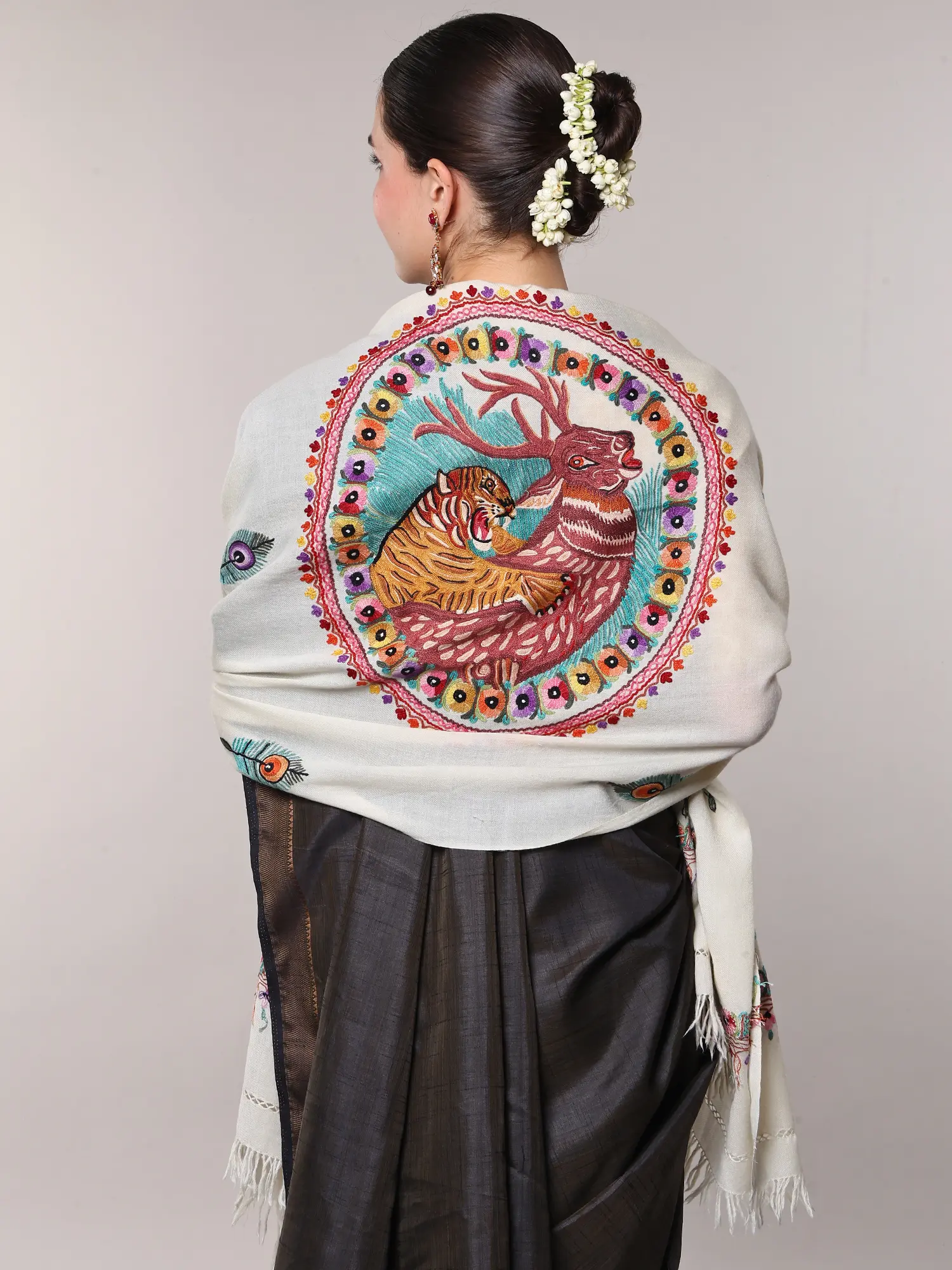 The focal point of this remarkable stole is its stunning Aari embroidery, a technique renowned for its precision and the beautiful satin stitch that creates a raised, textured effect. One end of the stole is adorned with a magnificent depiction of a peacock feather, its iridescent blues, greens, and oranges meticulously rendered, symbolizing beauty, grace, and royalty. Following this, and continuing across the breadth of the stole, is a mesmerizing scene of a deer hunt. The skillful needlework brings to life the dynamic energy of the hunt, with the deer captured in a moment of swift movement, surrounded by the subtle hints of foliage, all rendered with incredible detail and vibrant color. Scattered across the expanse of the stole are smaller, individual peacock feather motifs, each a delicate testament to the artisan's skill, creating a sense of rhythm and visual flow.