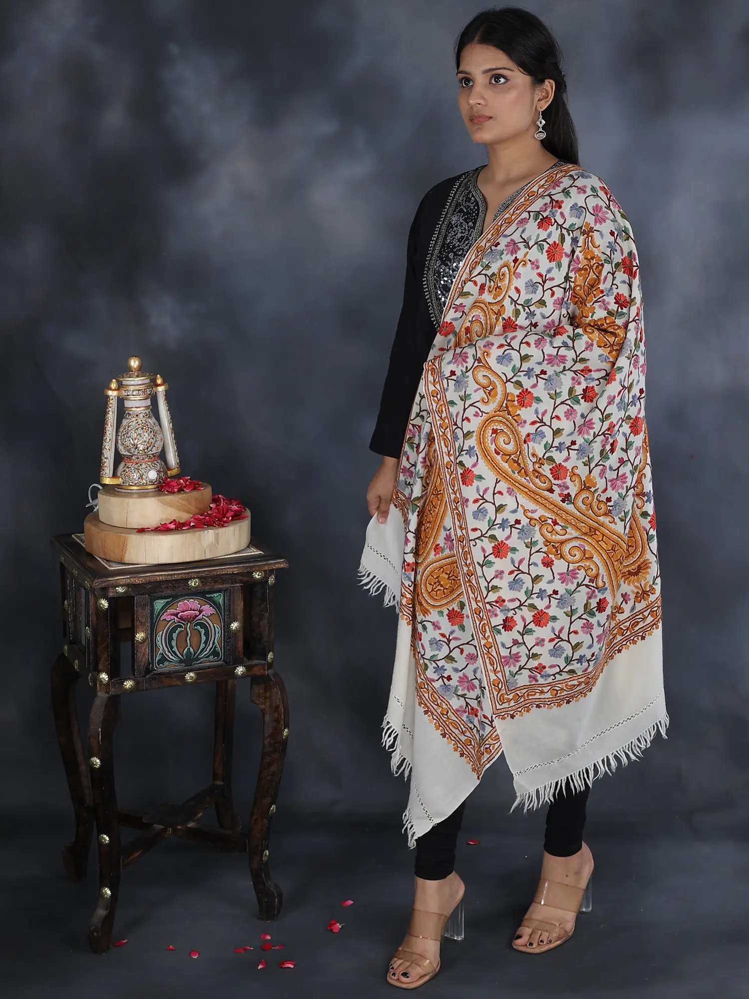 Wrap yourself in the elegance of our Kashmiri Stole. Aari hand-embroidered flowers and paisleys adorn this stole, reflecting the impeccable skill of Kashmiri artisans. The colors chosen mirror the breathtaking beauty of the Kashmir Valley. Aari embroidery has an enduring history and seamlessly merges with today's fashion. When you wear this stole, you carry a piece of Kashmir's craftsmanship and history, embracing a timeless accessory that transcends trends. It's a testimony to the grandeur of design from the region and a tribute to tradition that remains ever-trendy.