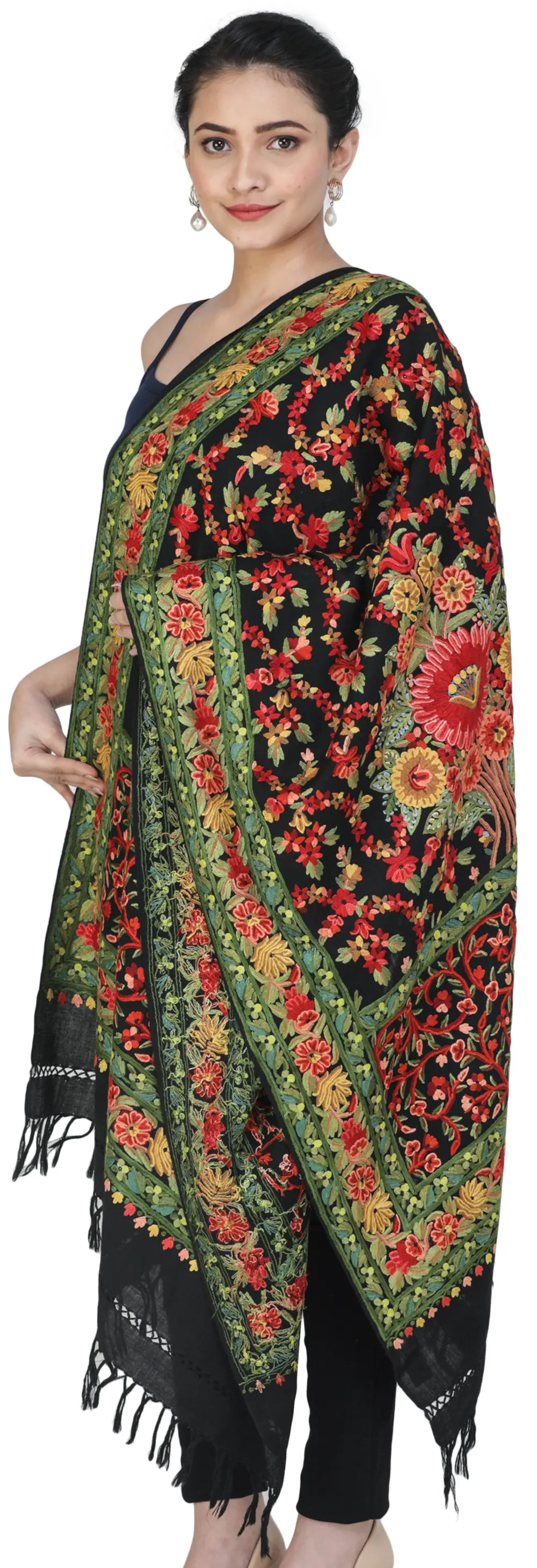 This Kashmiri Stole is a masterpiece, reflecting the age-old heritage of Kashmiri craftsmanship. Skilled artisans have meticulously hand-embroidered multicolored flowers, creating a vibrant symphony of colors on a canvas of warmth and elegance. The tradition of this design dates back centuries, making it a true representation of timeless artistry. Today, it remains an embodiment of Kashmir's cultural grandeur and an ideal choice for those who seek to intertwine heritage with contemporary fashion.