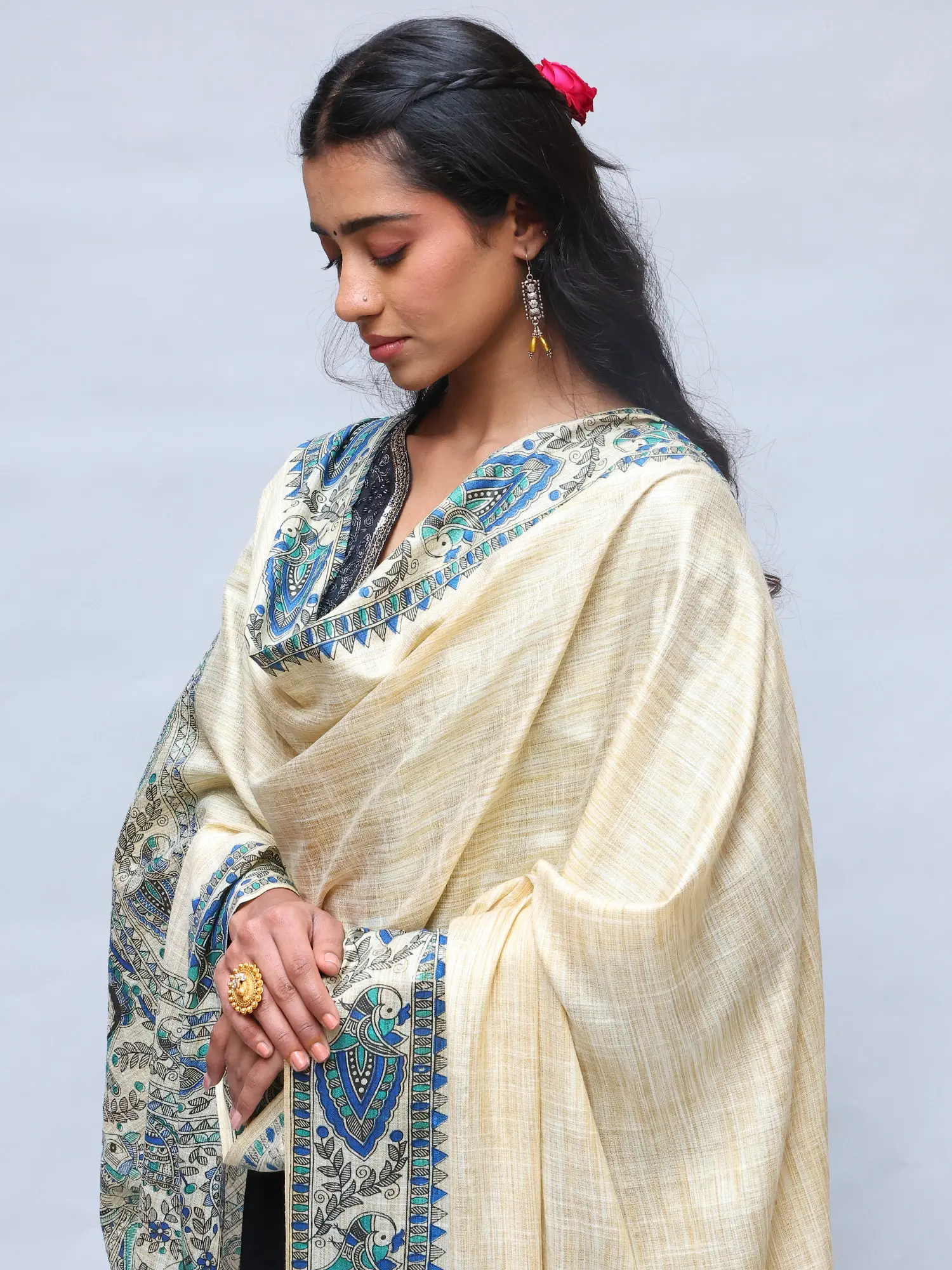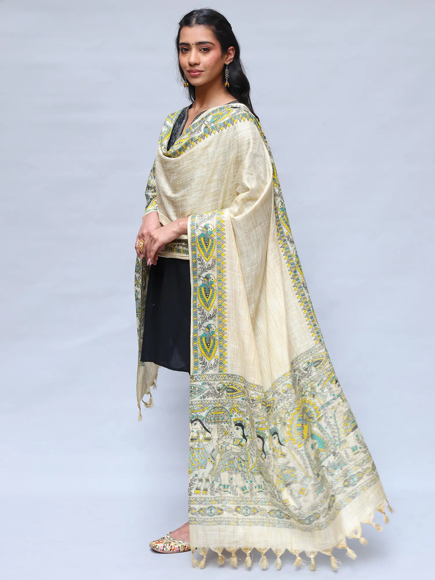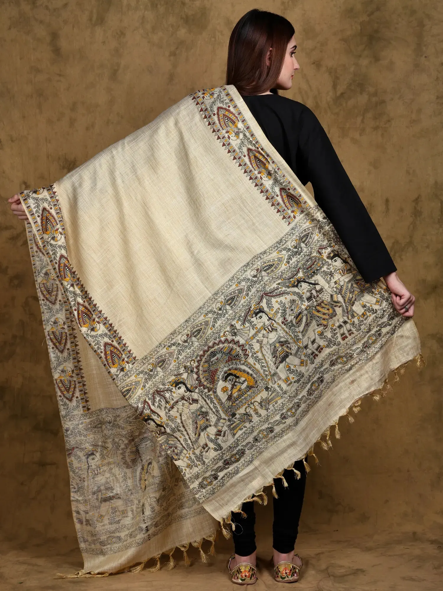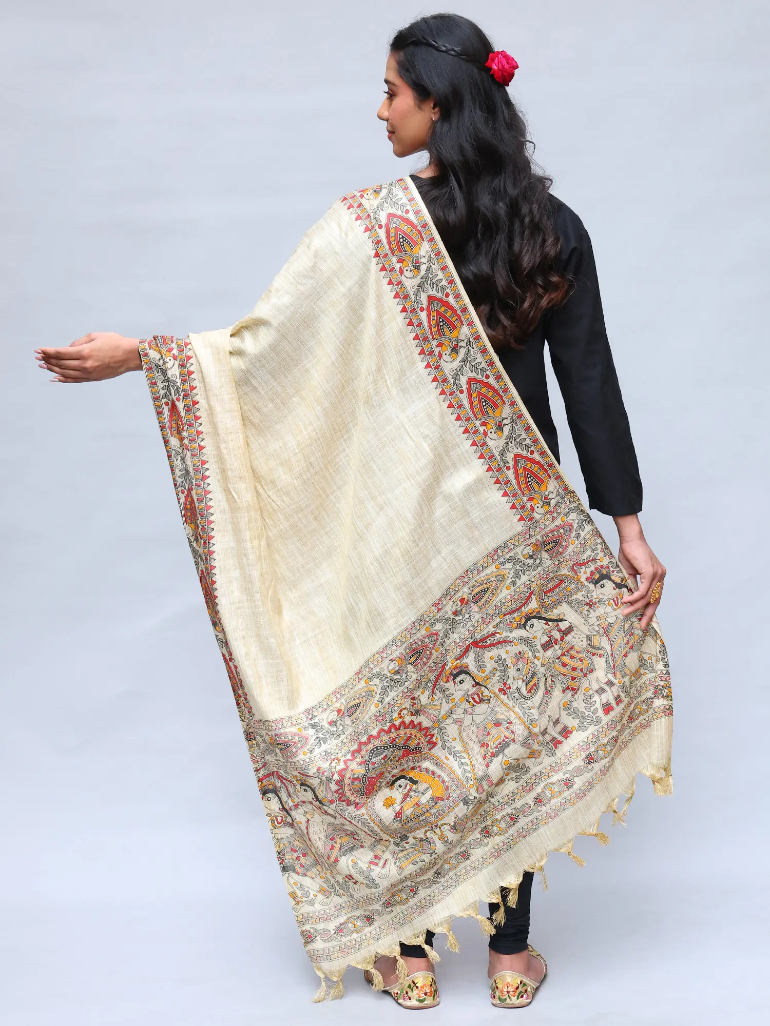 Warm-Sand Khadi Silk Madhubani Dupatta from Bihar with Hand-Painted Fishes