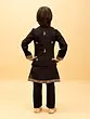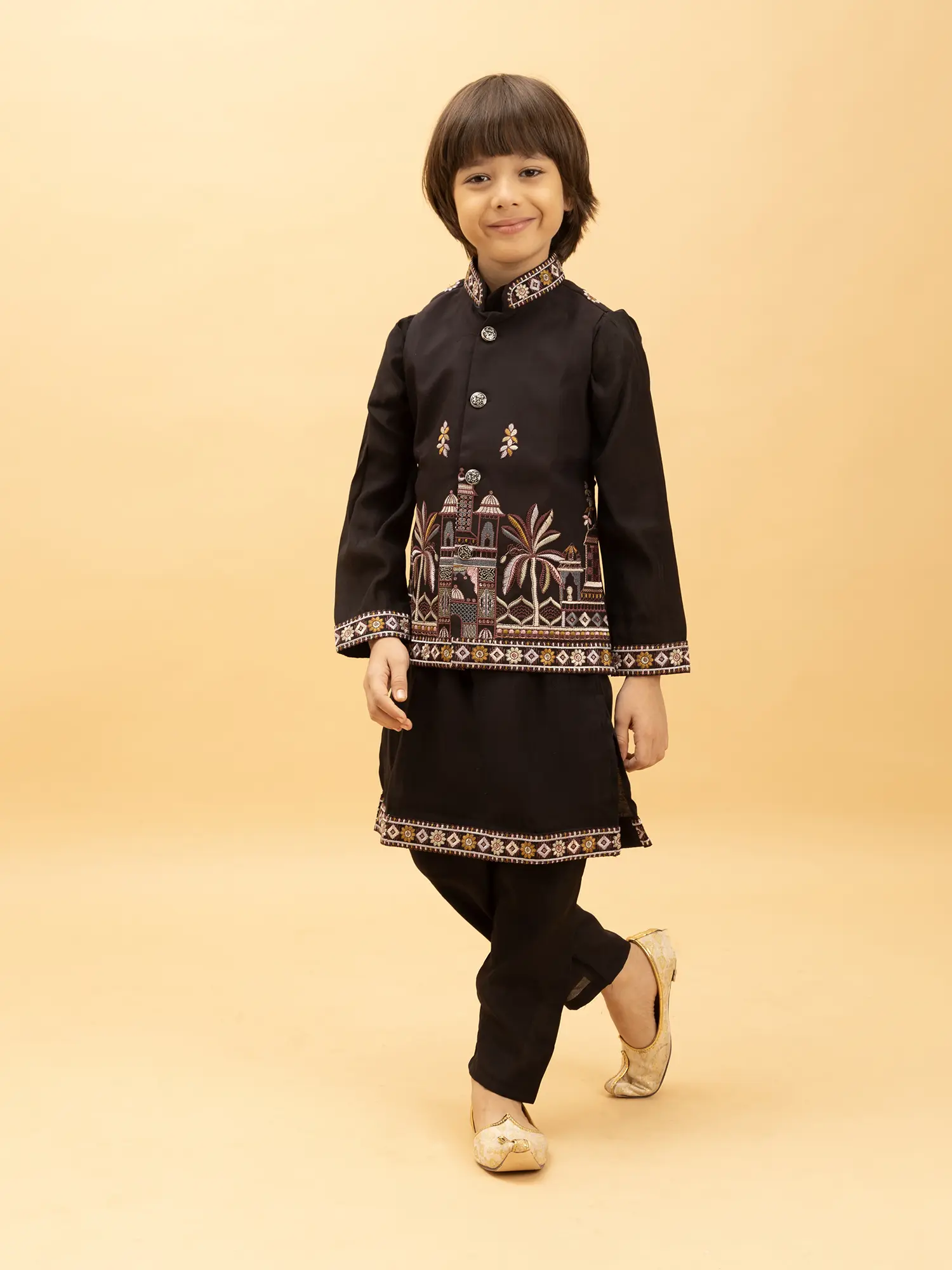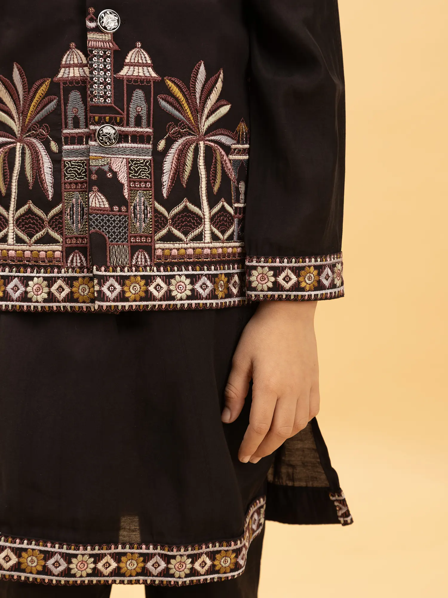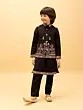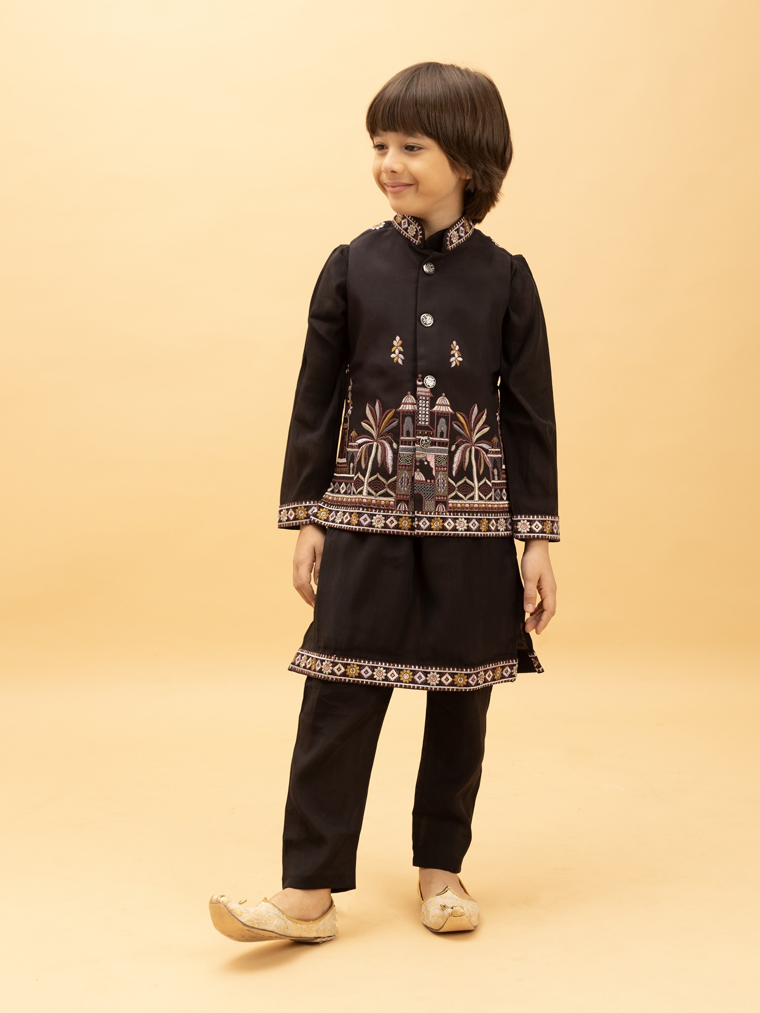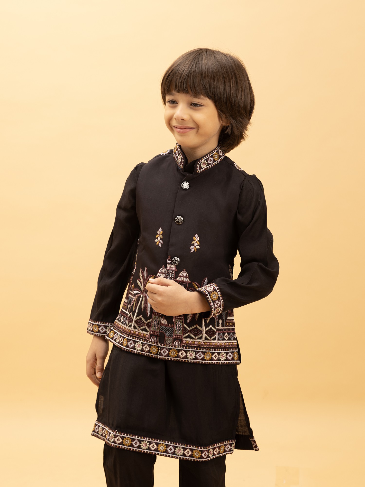 Elevate your young boy's festive wardrobe with this exquisite kurta set, designed to imbue him with an air of sophistication and charm. Crafted from luxurious viscose silk, this ensemble promises a smooth, lustrous feel against the skin, ensuring comfort without compromising on style. The rich black hue serves as a perfect canvas for the intricate embroidery that adorns the Koti jacket, creating a visually stunning statement piece.
