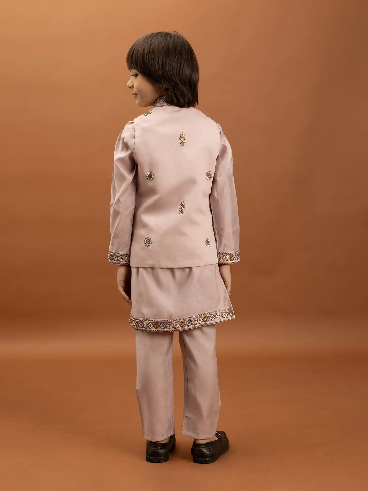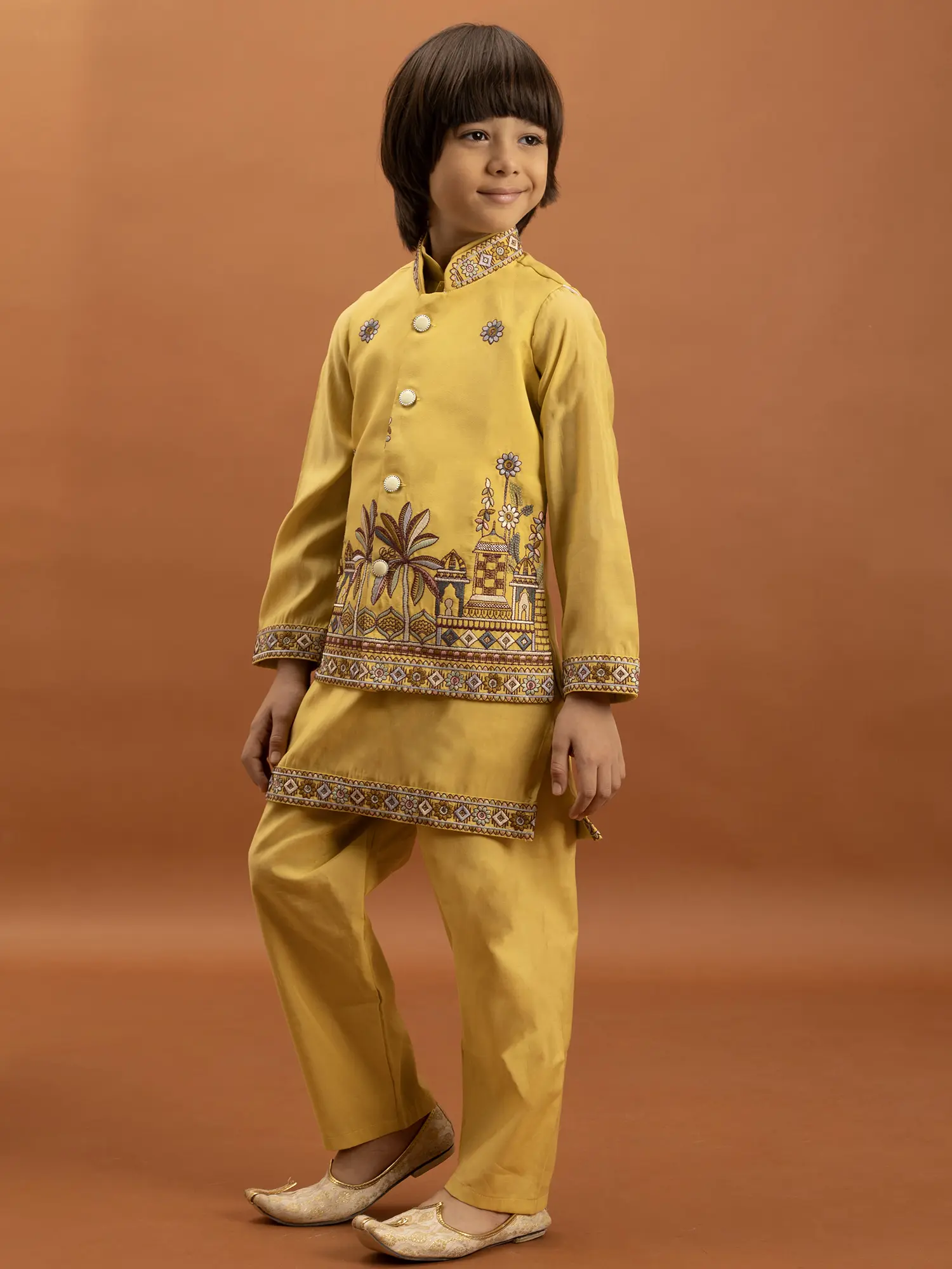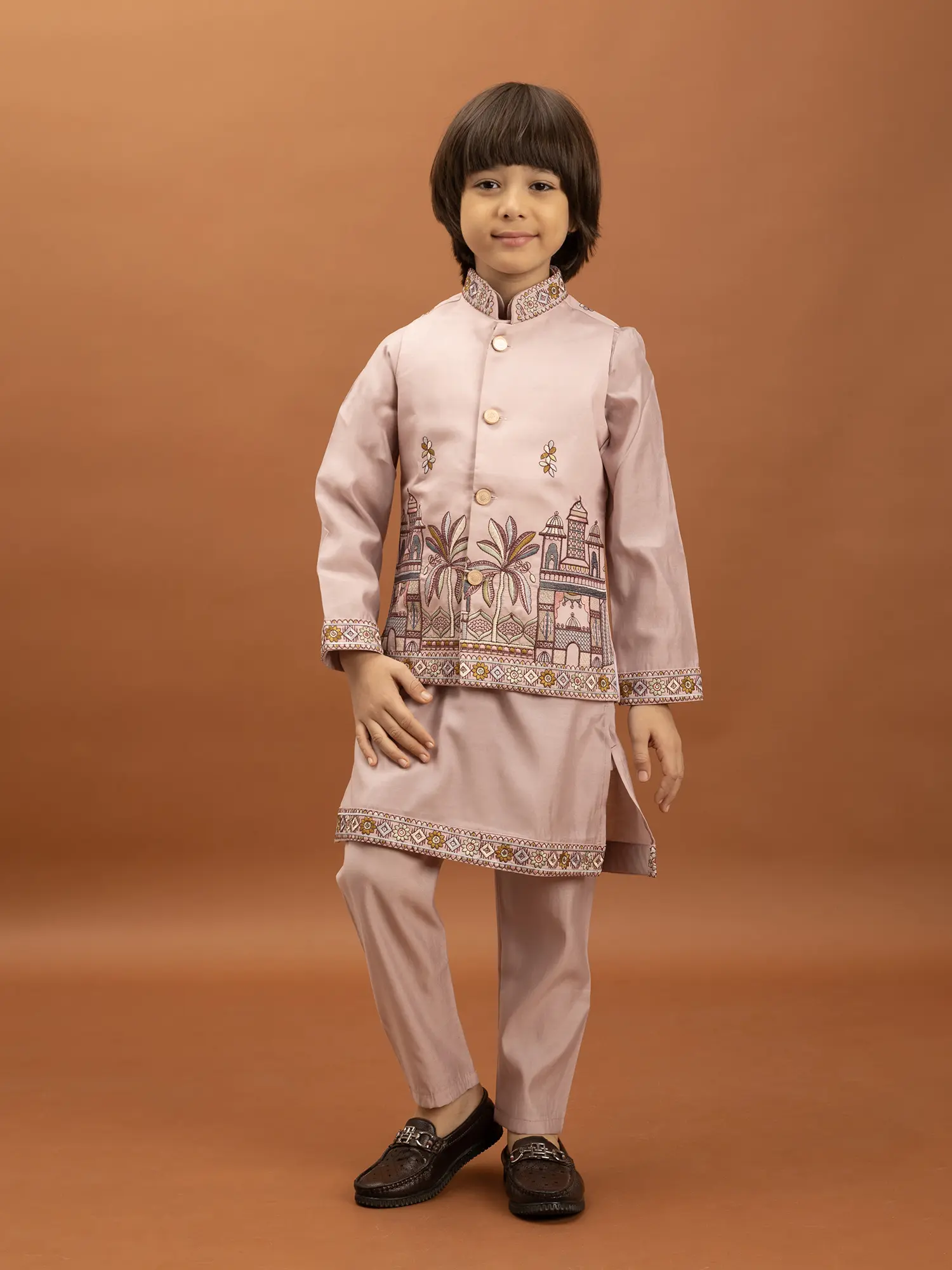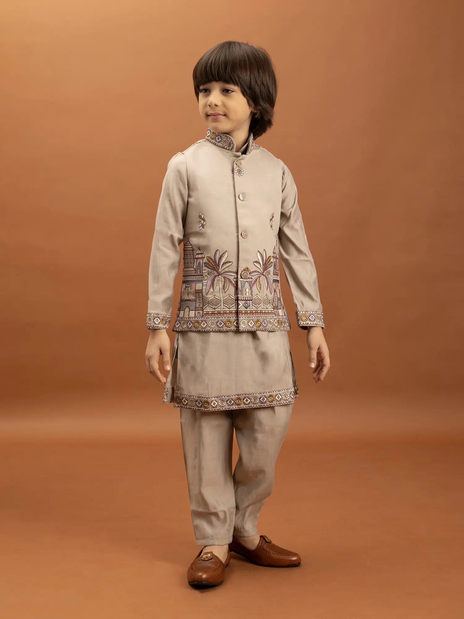 The accompanying kurta is designed with simplicity and comfort in mind, allowing the embroidered jacket to take center stage. Made from the same soft viscose silk, it provides a comfortable base layer. The sleeves and hem of the kurta are subtly accented with a coordinating embroidered border, mirroring the rich detailing of the jacket and creating a cohesive look. The trousers are tailored for a neat and comfortable fit, ensuring ease of movement for active young boys. This thoughtful combination ensures that your child looks his absolute best while remaining at ease throughout any occasion.