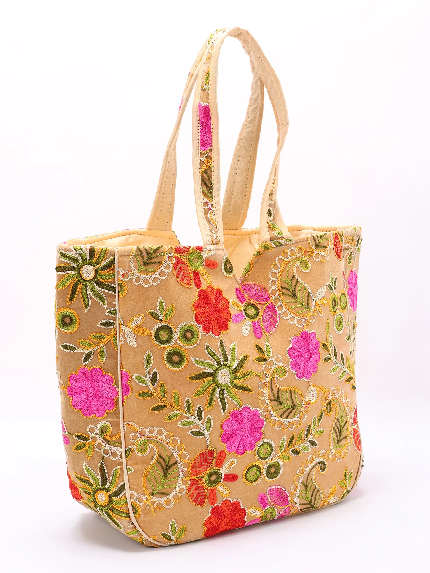 Embrace the vibrant spirit of India with our exquisite Kutch Shoulder Bag. This isn't just a bag; it's a wearable work of art, meticulously handcrafted using traditional techniques passed down through generations. The rich, luxurious velvet fabric provides a plush and sophisticated backdrop for the stunning hand-embroidered details. Each vibrant flower and paisley motif is a testament to the artistry and dedication of the skilled artisans who created it. The warm beige hue of the velvet serves as a perfect canvas, allowing the multicolored embroidery to truly pop. Carry this bag and let its beauty speak volumes.