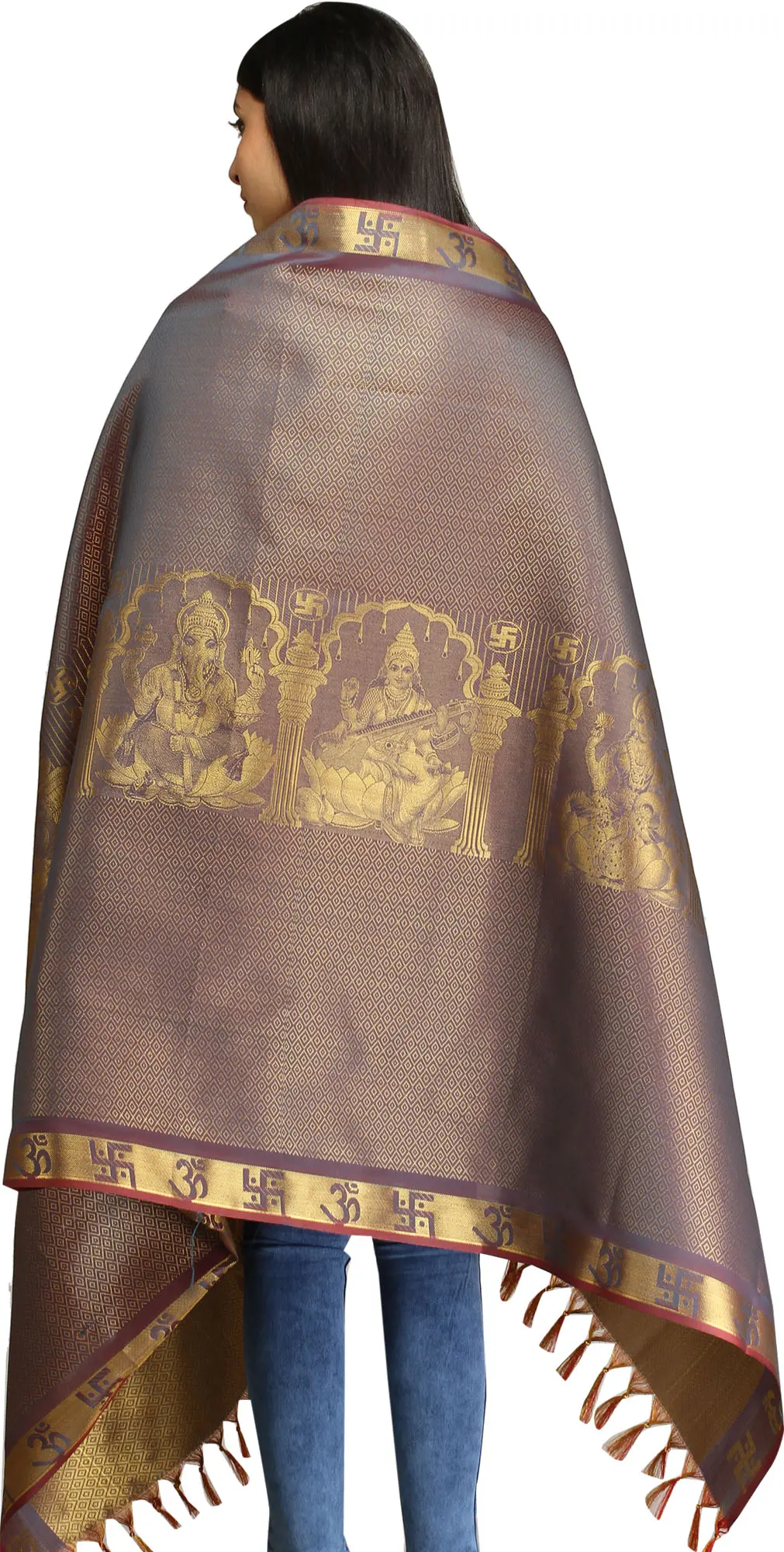 Elevate your spiritual practice and imbue your surroundings with positive energy with this exquisite brocaded prayer shawl. Crafted in the heart of Tamil Nadu, a region renowned for its rich textile heritage, this shawl is more than just an accessory; it's a symbol of devotion and a conduit for divine blessings. The intricate brocade work, a testament to masterful craftsmanship, depicts the auspicious symbols of Lakshmi, the goddess of wealth and prosperity, and Ganesha, the remover of obstacles, along with the sacred Om symbol, representing the primordial sound and the essence of the universe.