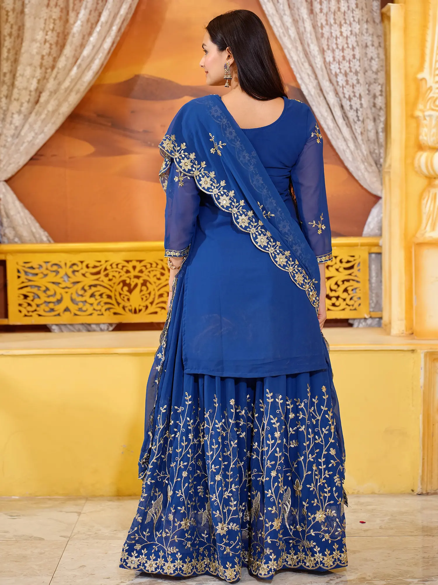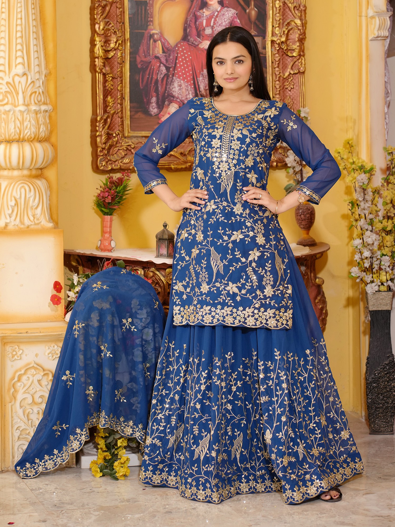 Faux Georgette Thread And Sequins Work Festive Wear Kurti Sharara Set With Dupatta