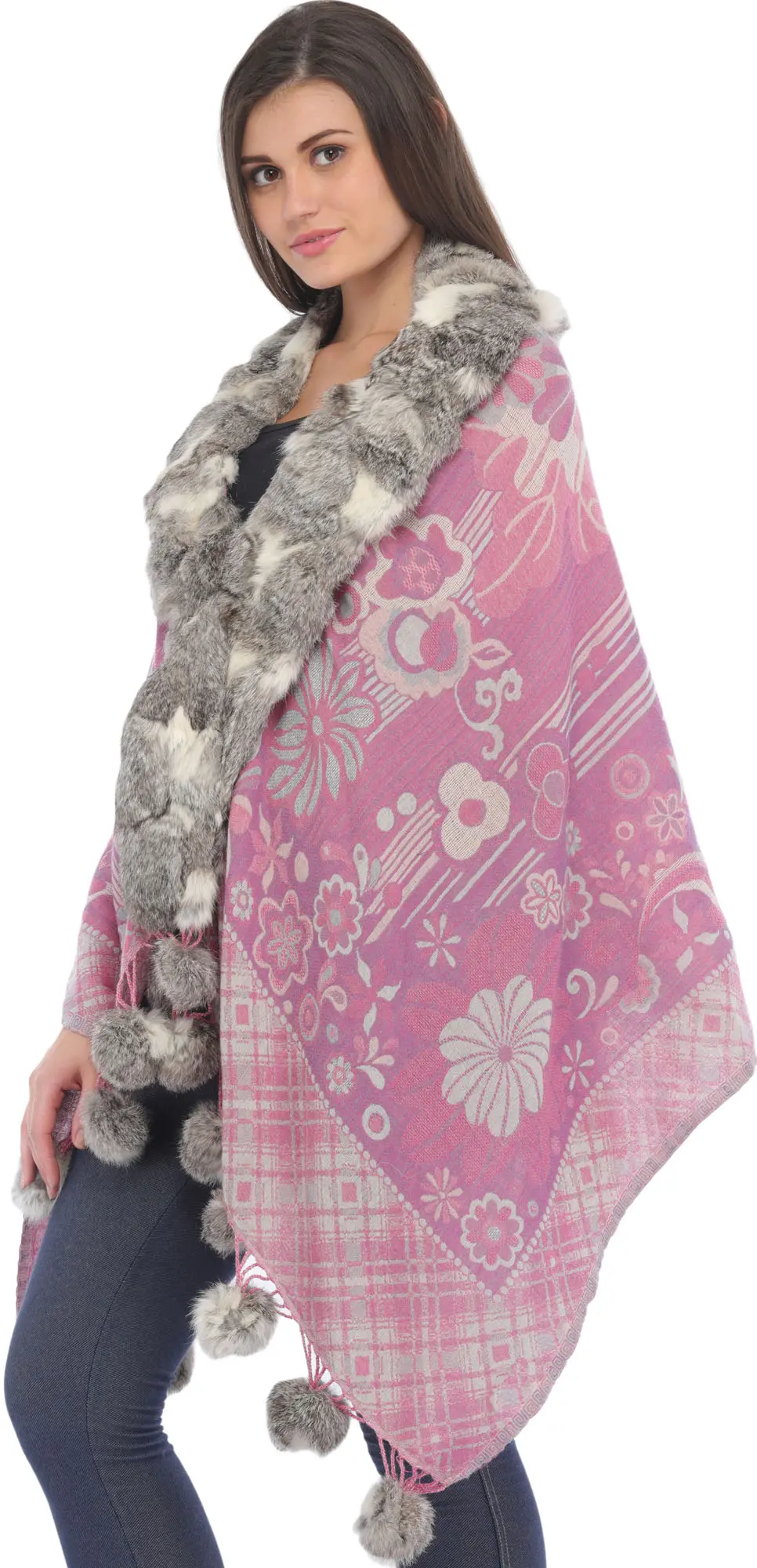 Adding a playful yet elegant flourish are the charming faux-fur pom-poms that adorn the hem. These delightful accents, suspended by delicate threads, sway gently with your movement, catching the light and drawing the eye. The wrap itself is generously sized, allowing for a multitude of styling options. Drape it effortlessly over your shoulders for a classic, regal look, or cinch it at the waist with a belt to create a more defined silhouette. It's equally stunning worn open, providing a chic layer over a simple top or dress. The generous dimensions ensure it can be wrapped, tied, or draped in various ways to suit your mood and the occasion, making it a truly versatile piece for your collection. Whether you're attending a special event, enjoying a brisk autumn day, or simply seeking an extra layer of warmth and style, this wrap promises to be your go-to accessory.
