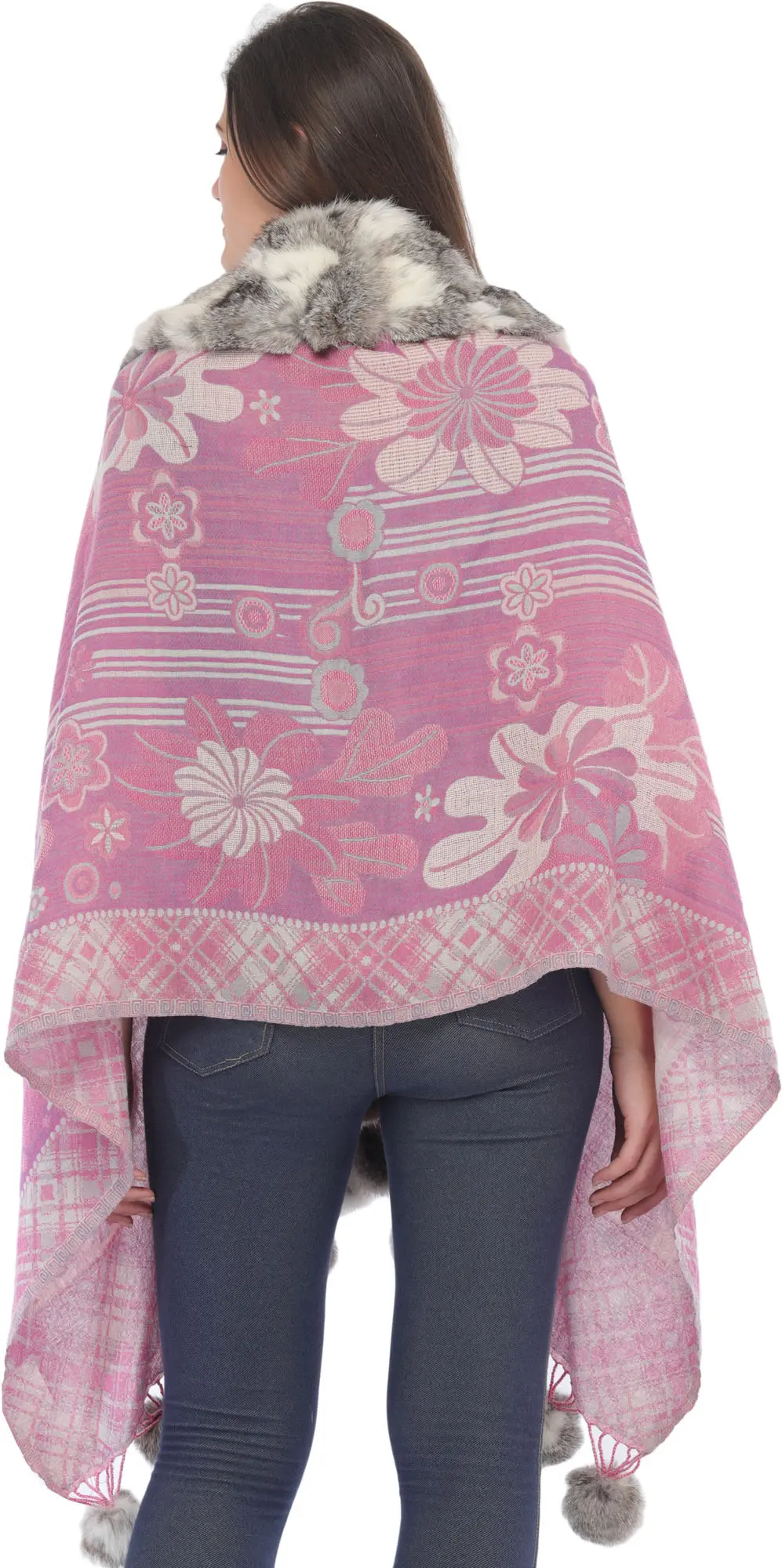 What truly sets this wrap apart is its opulent faux-fur collar. The plush, multi-toned grey and white fur drapes beautifully, framing the face and adding a cozy, high-fashion element. The softness of the faux-fur provides an inviting contrast to the textured wool, creating a tactile experience that is as delightful as it is visually appealing. This indulgent detail transforms the wrap from a simple accessory into a statement piece, perfect for adding a touch of glamour to cooler weather.