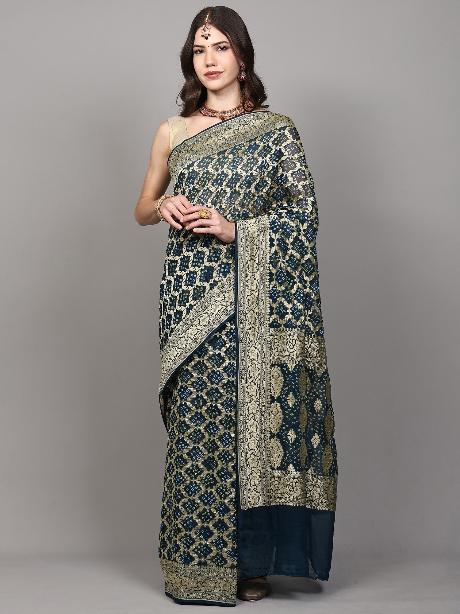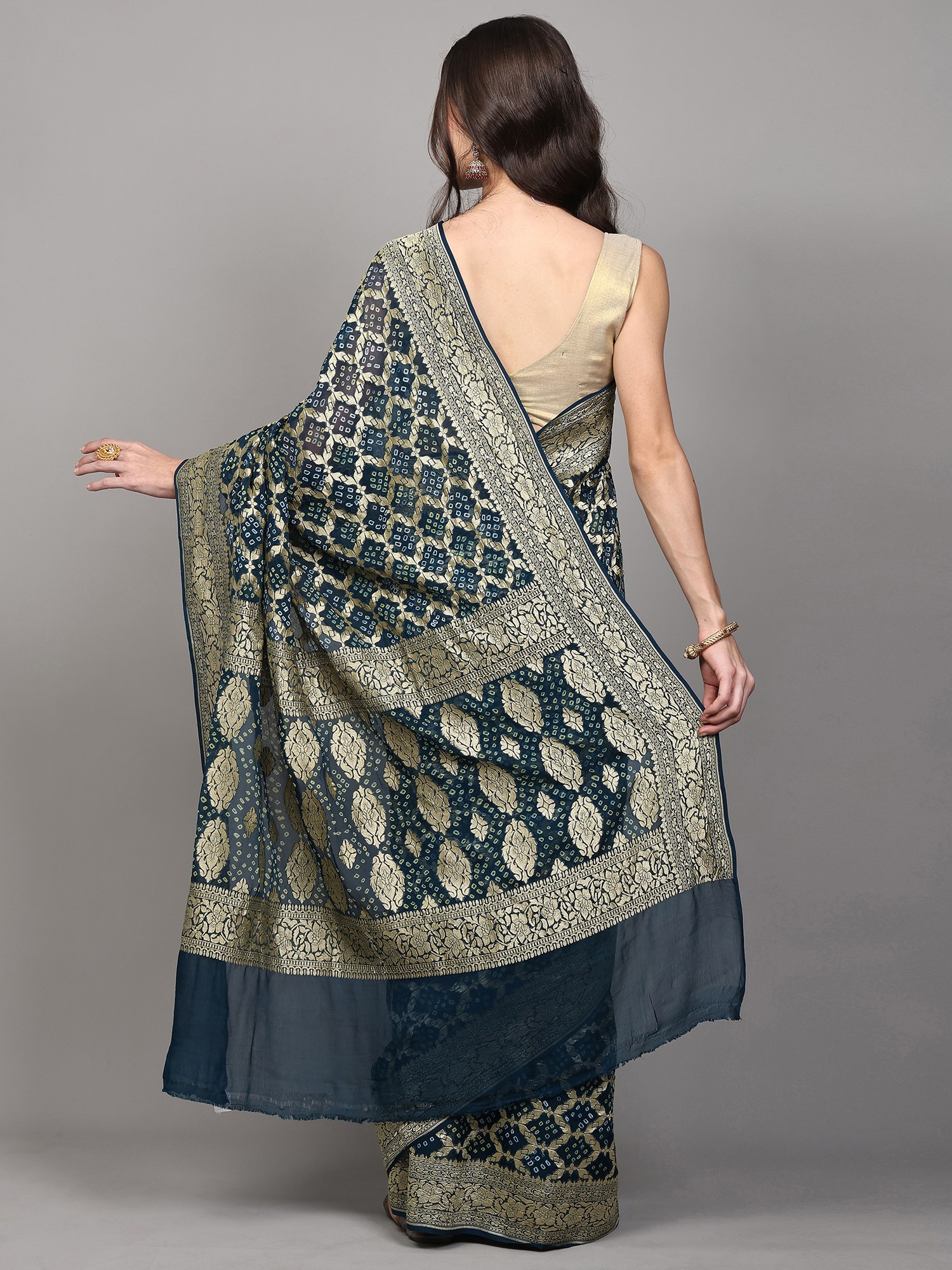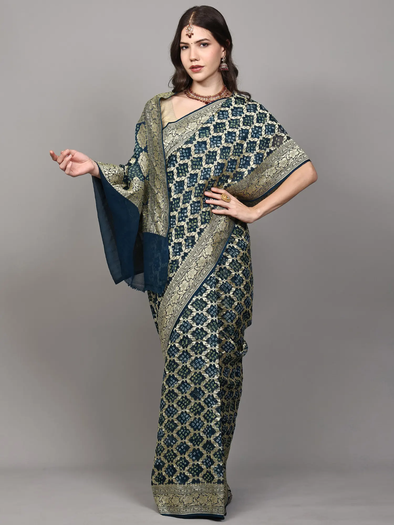 Moroccan-Blue Georgette Bandhej Saree with Zari Woven Paisley Jaal from Gujarat