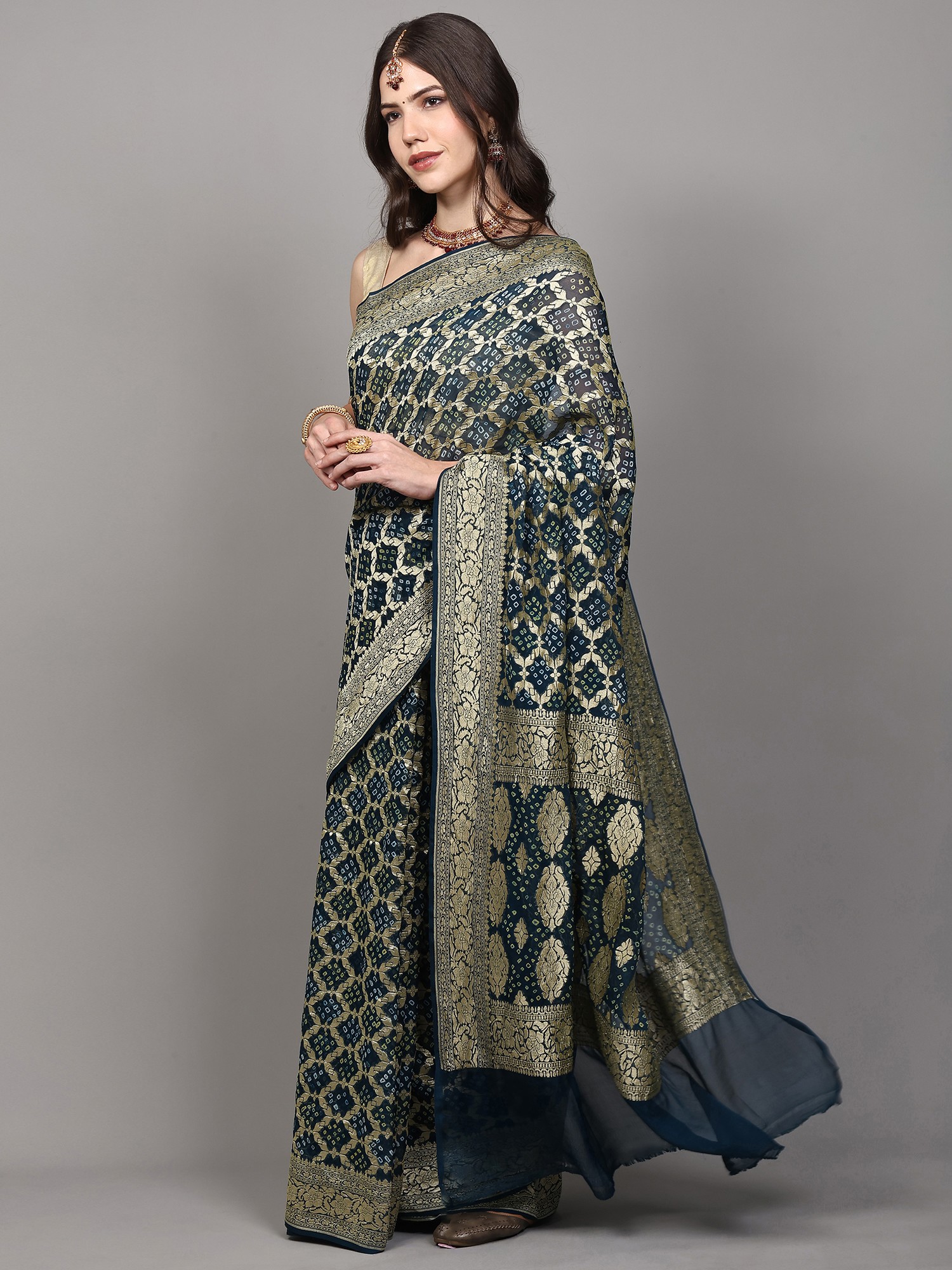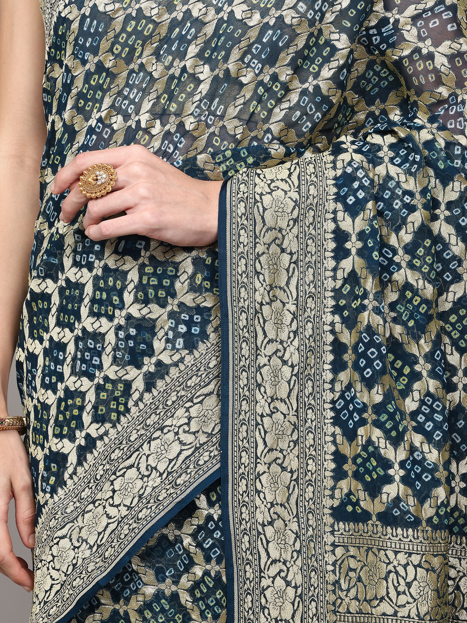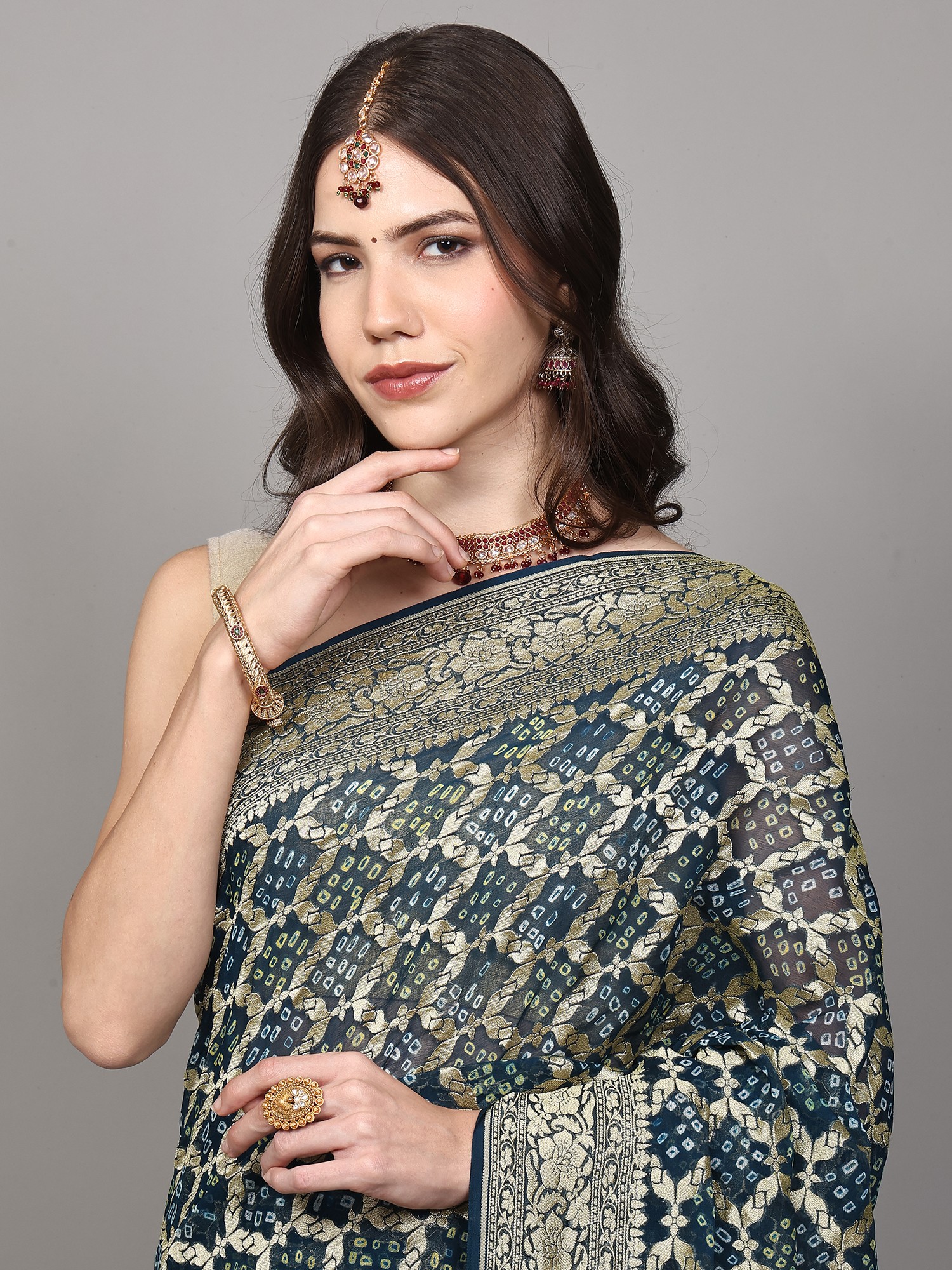 Moroccan-Blue Georgette Bandhej Saree with Zari Woven Paisley Jaal from Gujarat