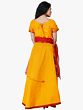 Each of the three pieces of this lahanga suit comes with its own quirk. The skirt sits a good few inches below the navel. Its almost straight cut as well as the hemline are a tad more practical than the voluminous, sweeping skirts we associate with traditional outfits. The choli is short-sleeved, and sits high on the torso in addition to revealing a good deal of the decolletage. The dupatta is short and sultry, a mass of translucent cotton fabric gathered together to complement the rich colours and the statement embroidery on the choli and the skrit. Zoom in on the sequined and laced-in panels to truly appreciate the handiwork of the rural Rajasthani artisan.