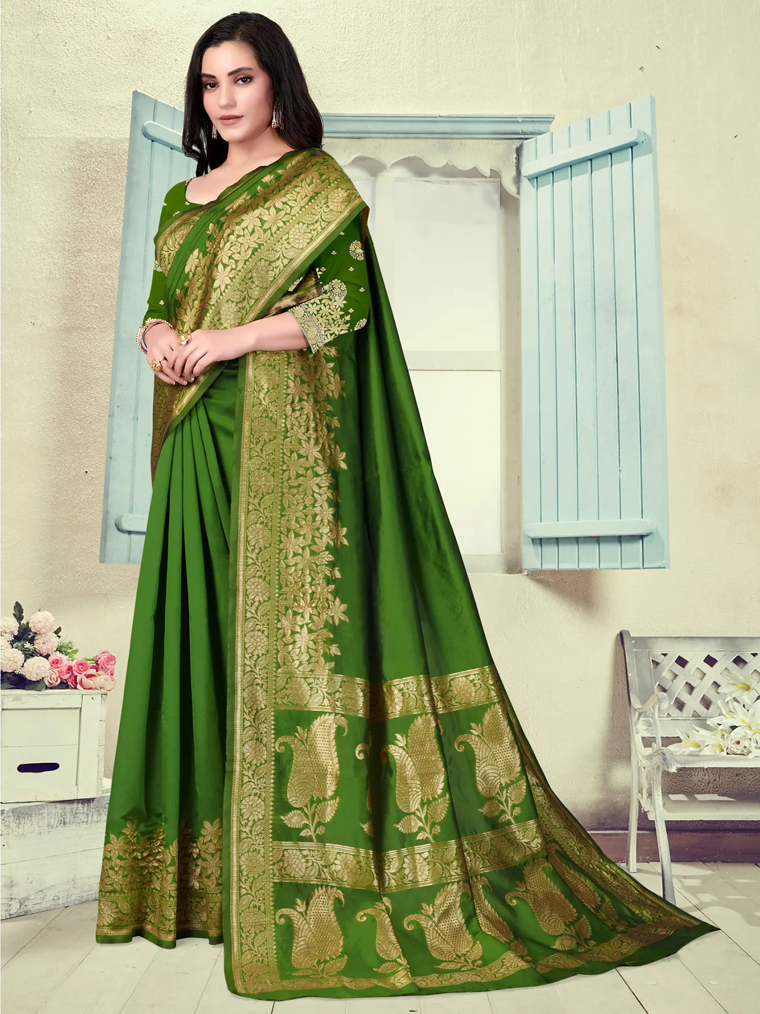 Ocean-Depths Bootis woven Pure Silk Saree from Bangalore with Golden Thread Weave on Border