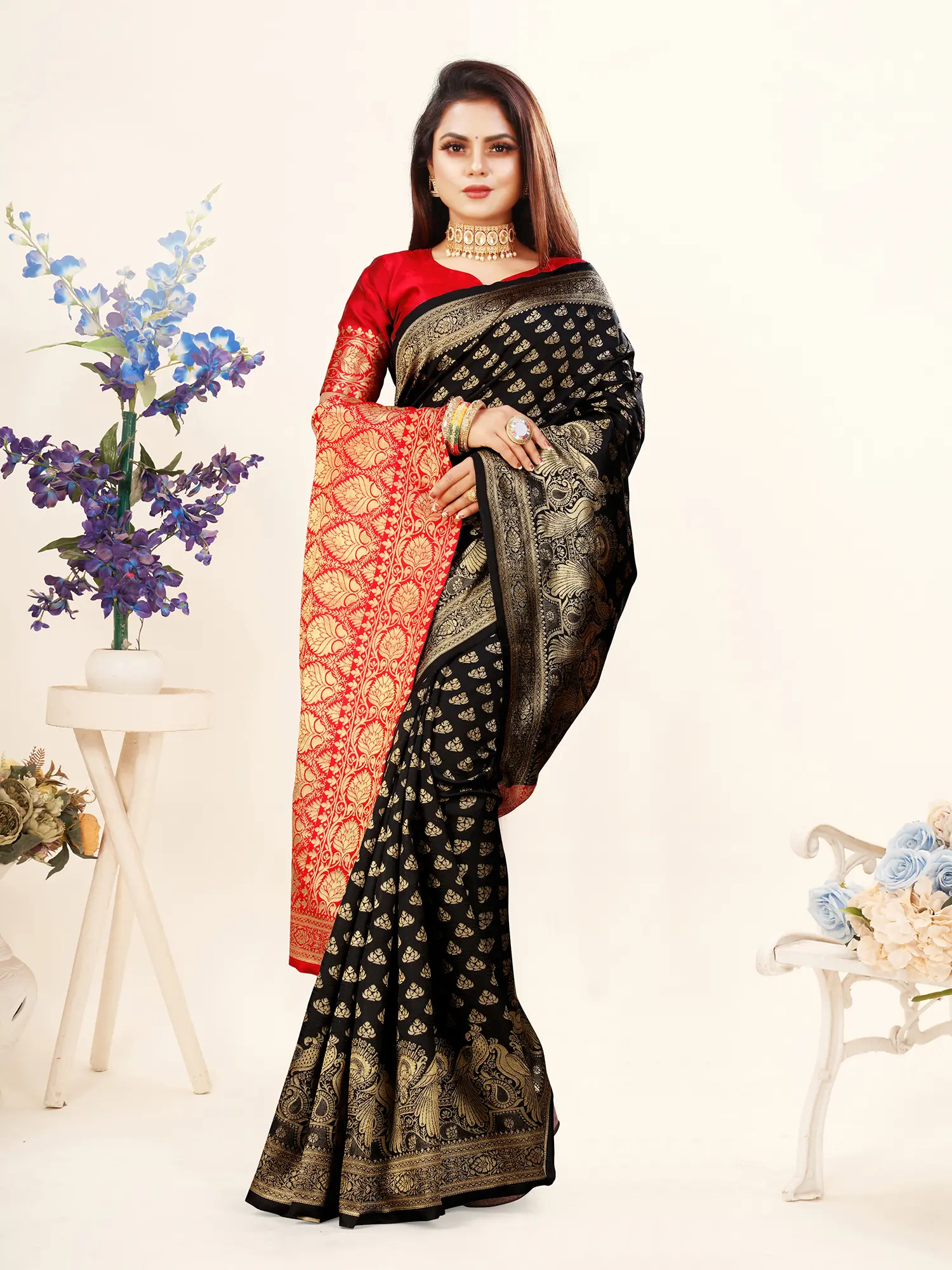 The striking combination of black, red, and gold makes this saree ideal for festive celebrations and special events.