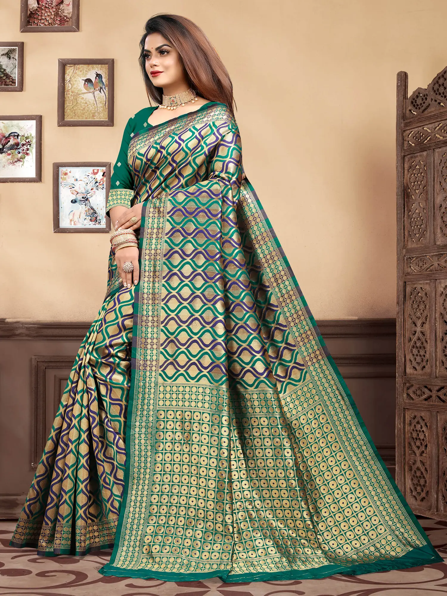 This saree is an ideal choice for wedding celebrations, bridal trousseaus, and engagements. Its inherent richness and sophisticated design speak volumes about traditional Indian attire. Paired with statement jewelry and complementary accessories, it promises a look that is both regal and undeniably stylish. The deep emerald green hue, combined with the opulent gold and regal purple accents, creates a color palette that is both vibrant and timeless, ensuring you are the center of attention.