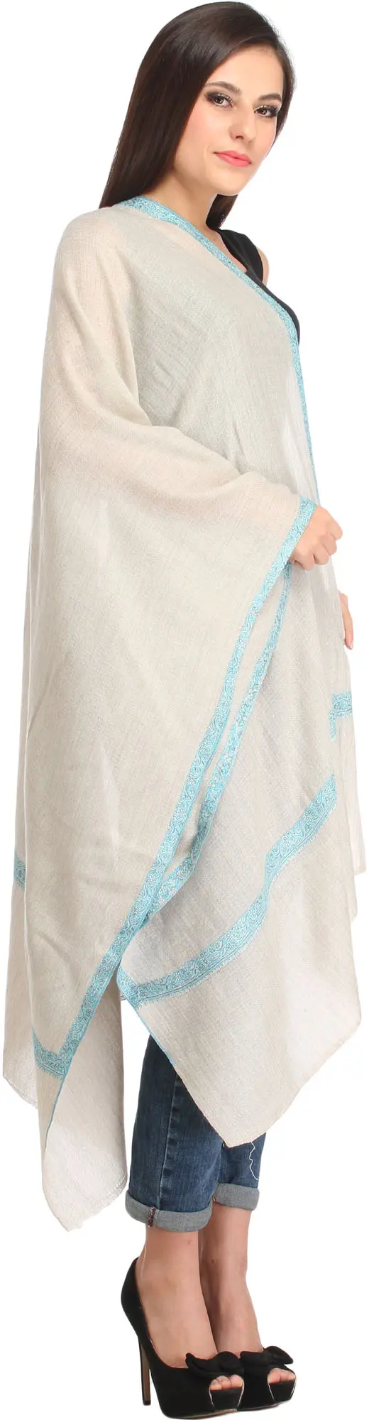 Evening-Blue Pure Wool Plain Shawl from Kashmir with Sozni Embroidered Border by Hand