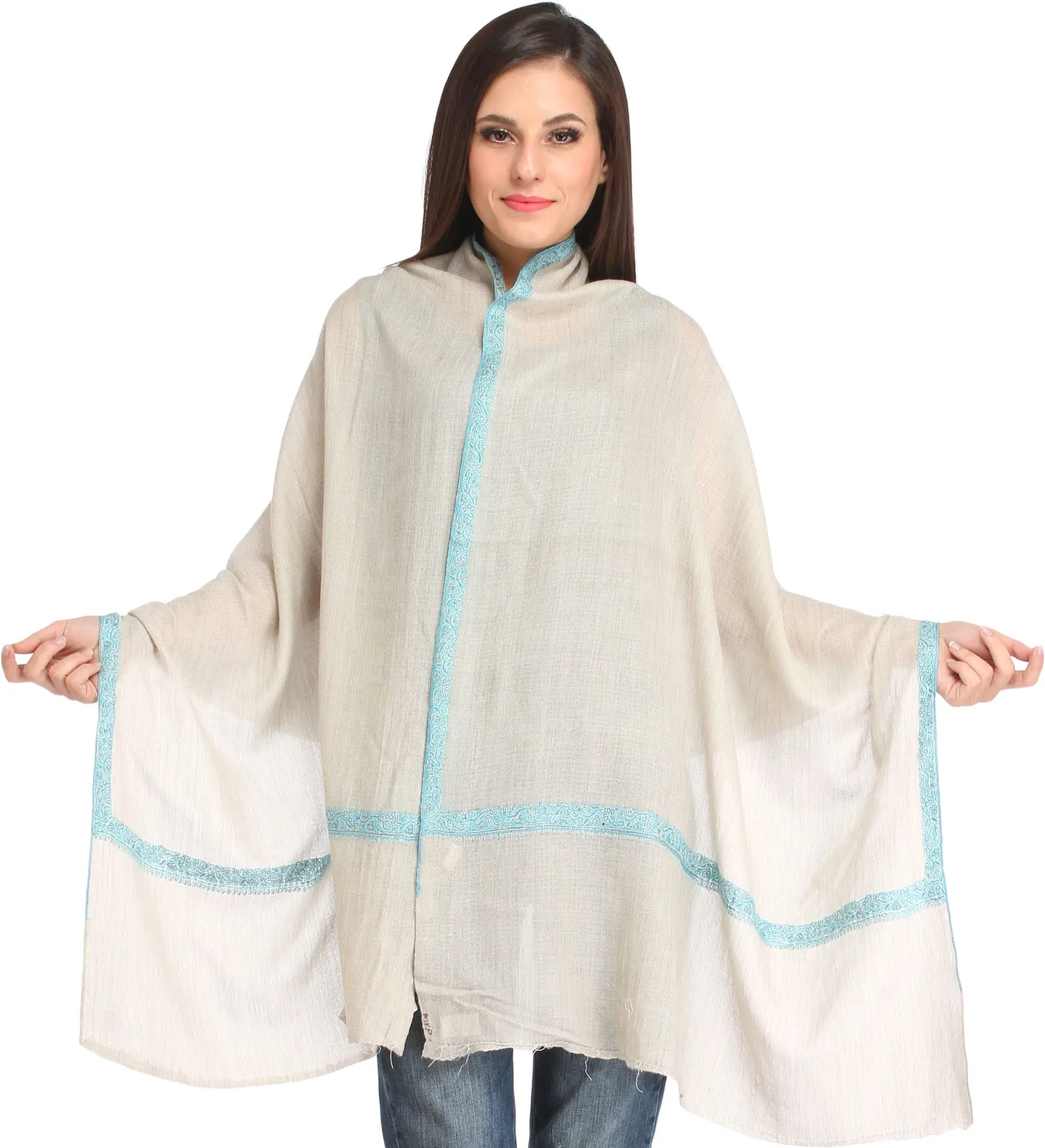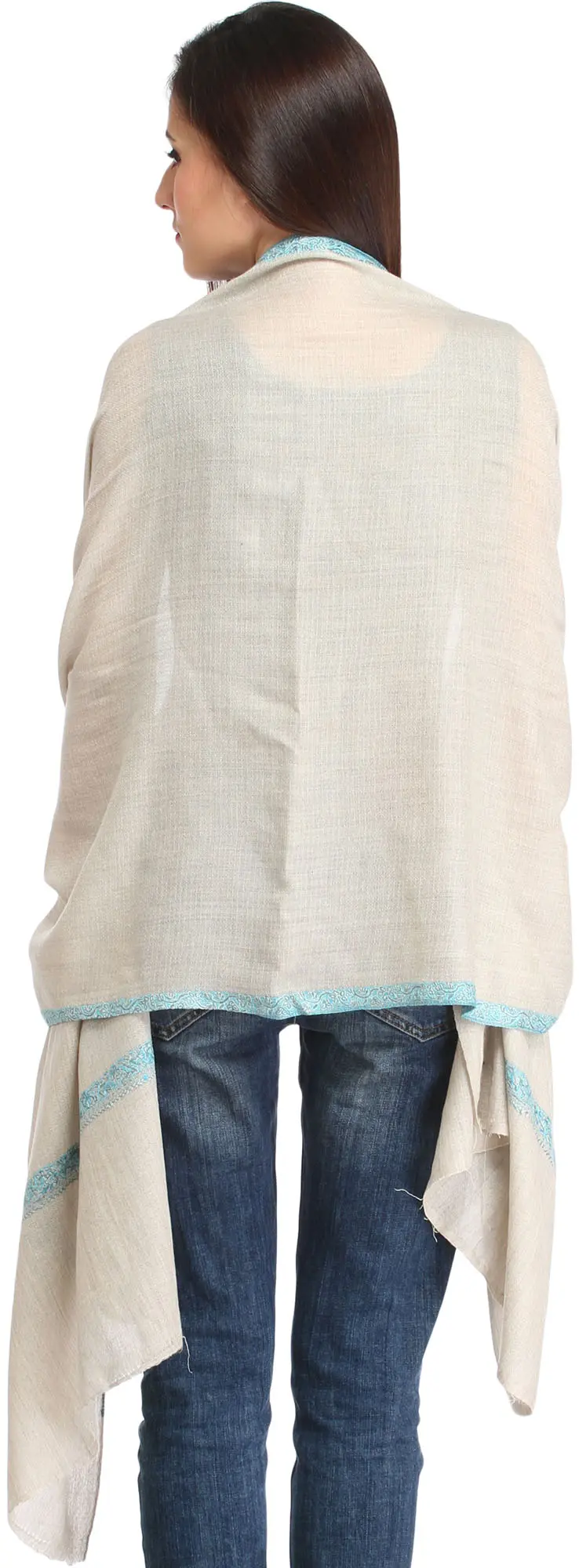 Aragon Plain Pure Pashmina Handloom Shawl from Kashmir with Intricate Sozni Embroidered Paisleys on Border
