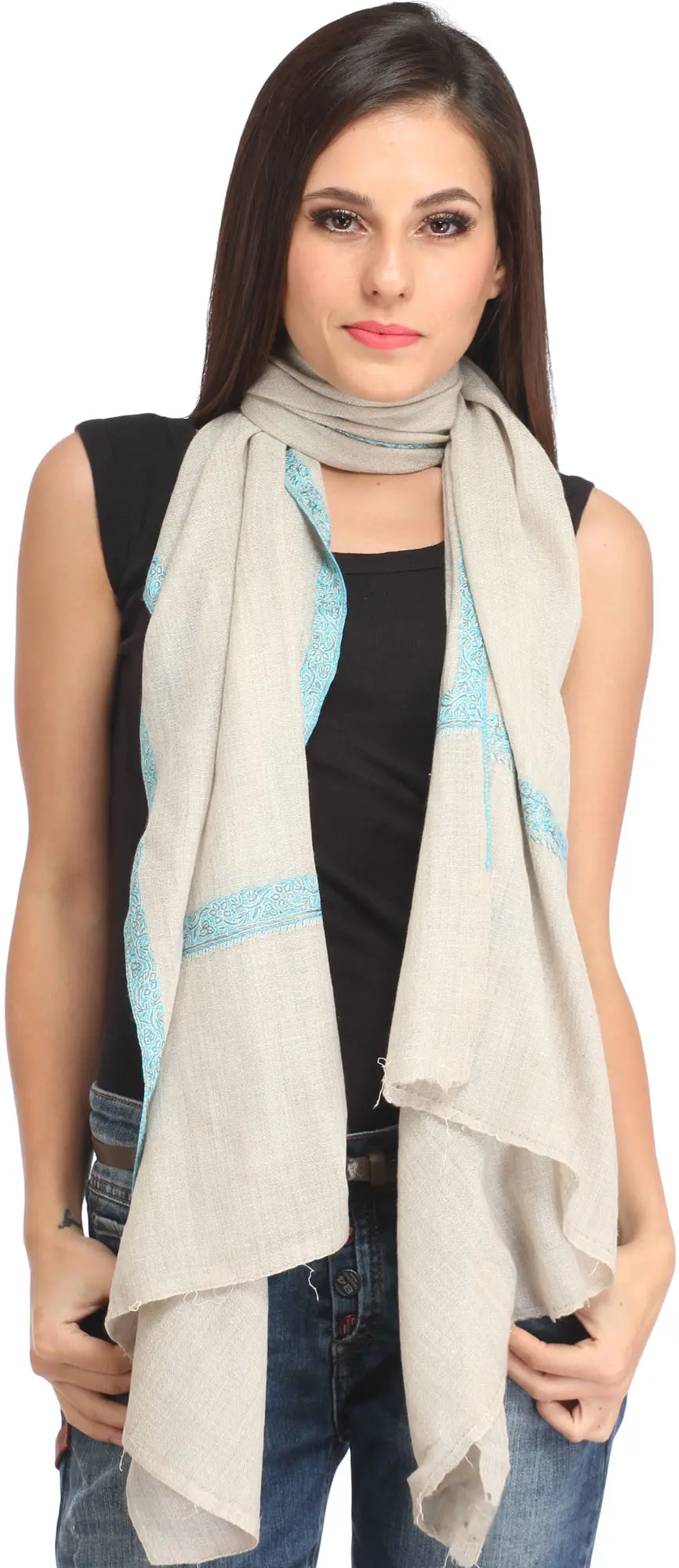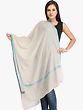 Plain Tusha Cashmere Stole from Kashmir with Sozni Hand-Embroidery on Border