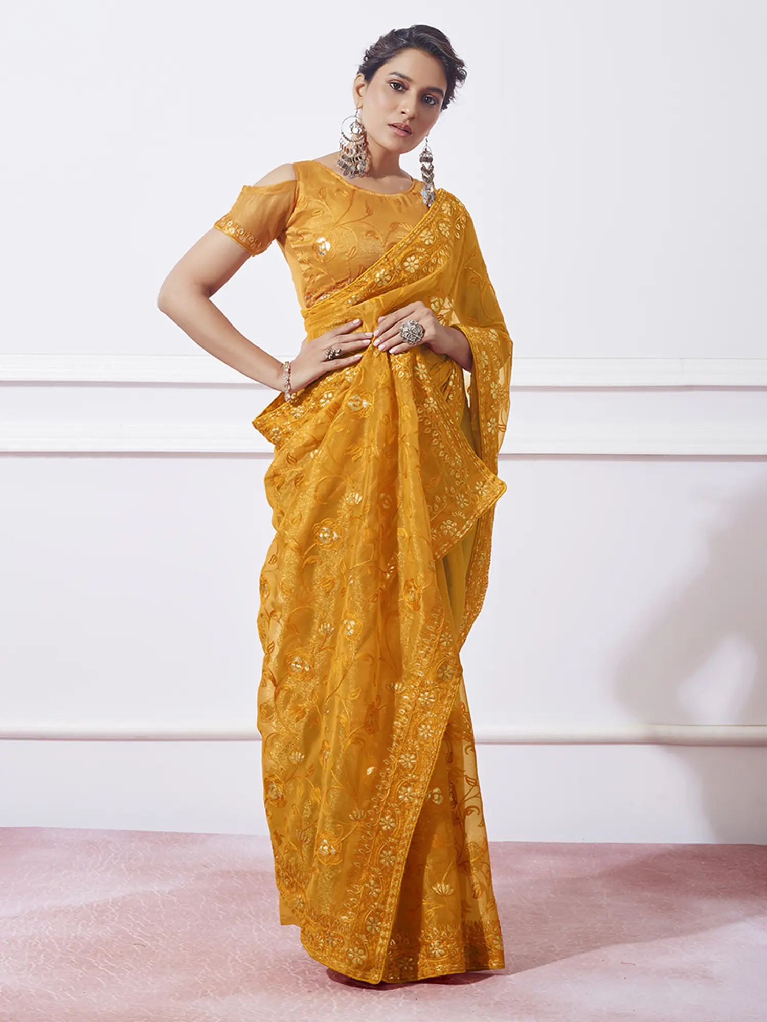 Light-Orange Attractive Simar Thread Floral Embroidery Work All Over Designer Saree With Blouse