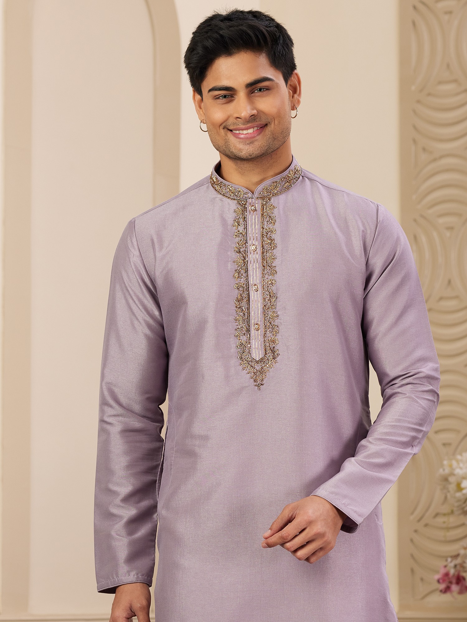 Plain Wedding Kurta Pajama with Embroidery on Neck
