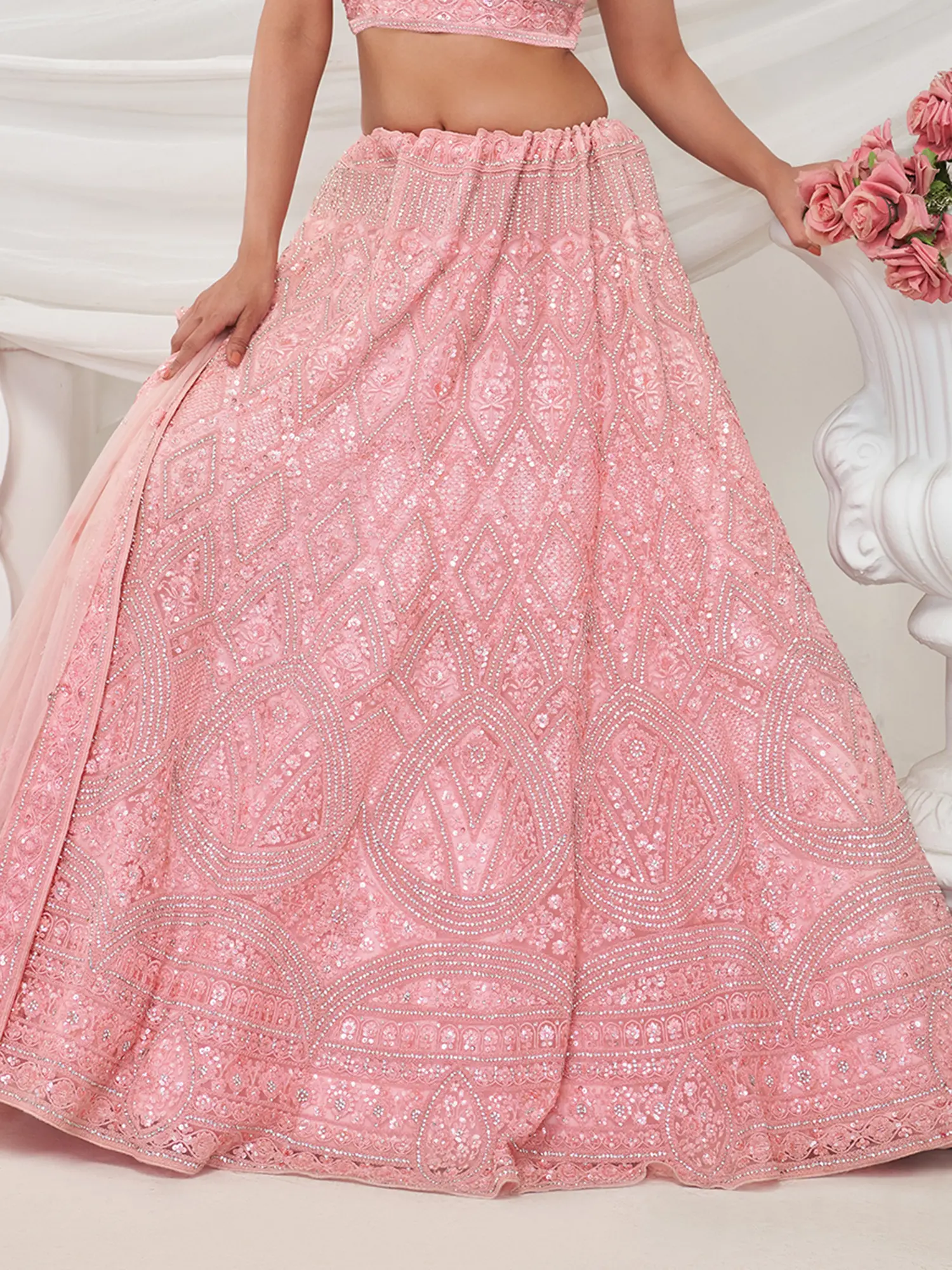 Light-Rose Floral Art Nouveau Patterned Sequins Embellishments Bridal Lehenga With Soft Net Dupatta