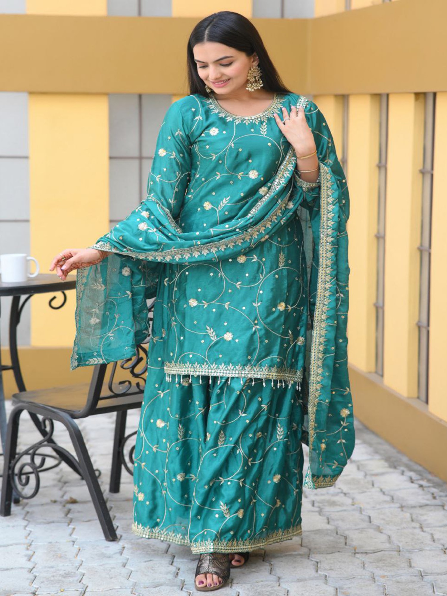 Attractive Embroidery And Sequins Work Chinon Silk Kurti Sharara Set