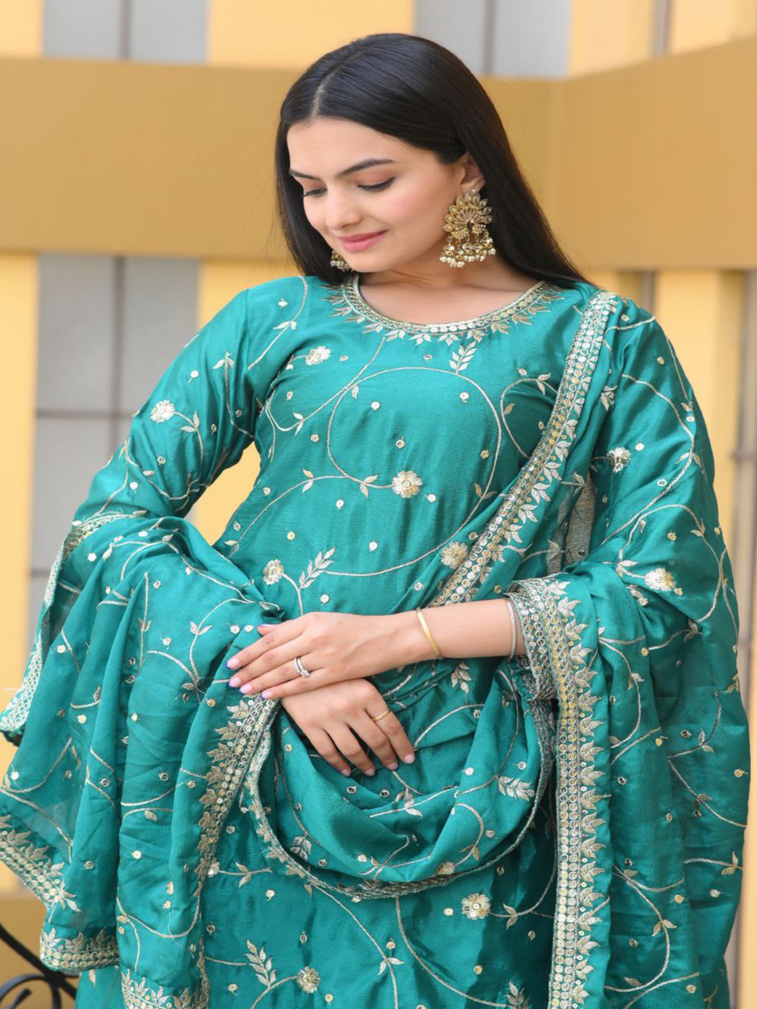 Chinon Attractive Embroidery And Sequins Work Kurti Sharara Set With Matching Dupatta