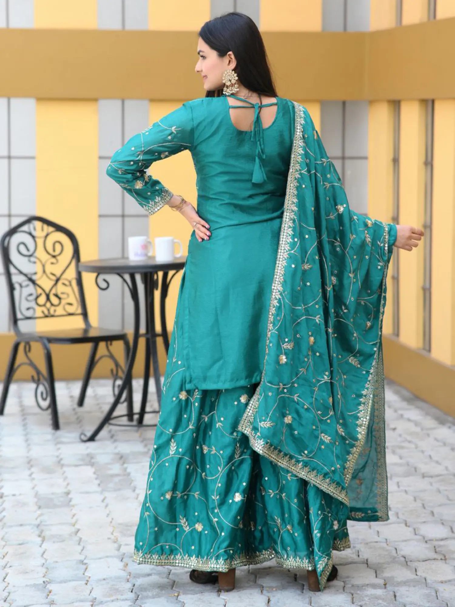 Attractive Chinon Sequins And Embroidery Work Kurti Sharara Set With Dupatta