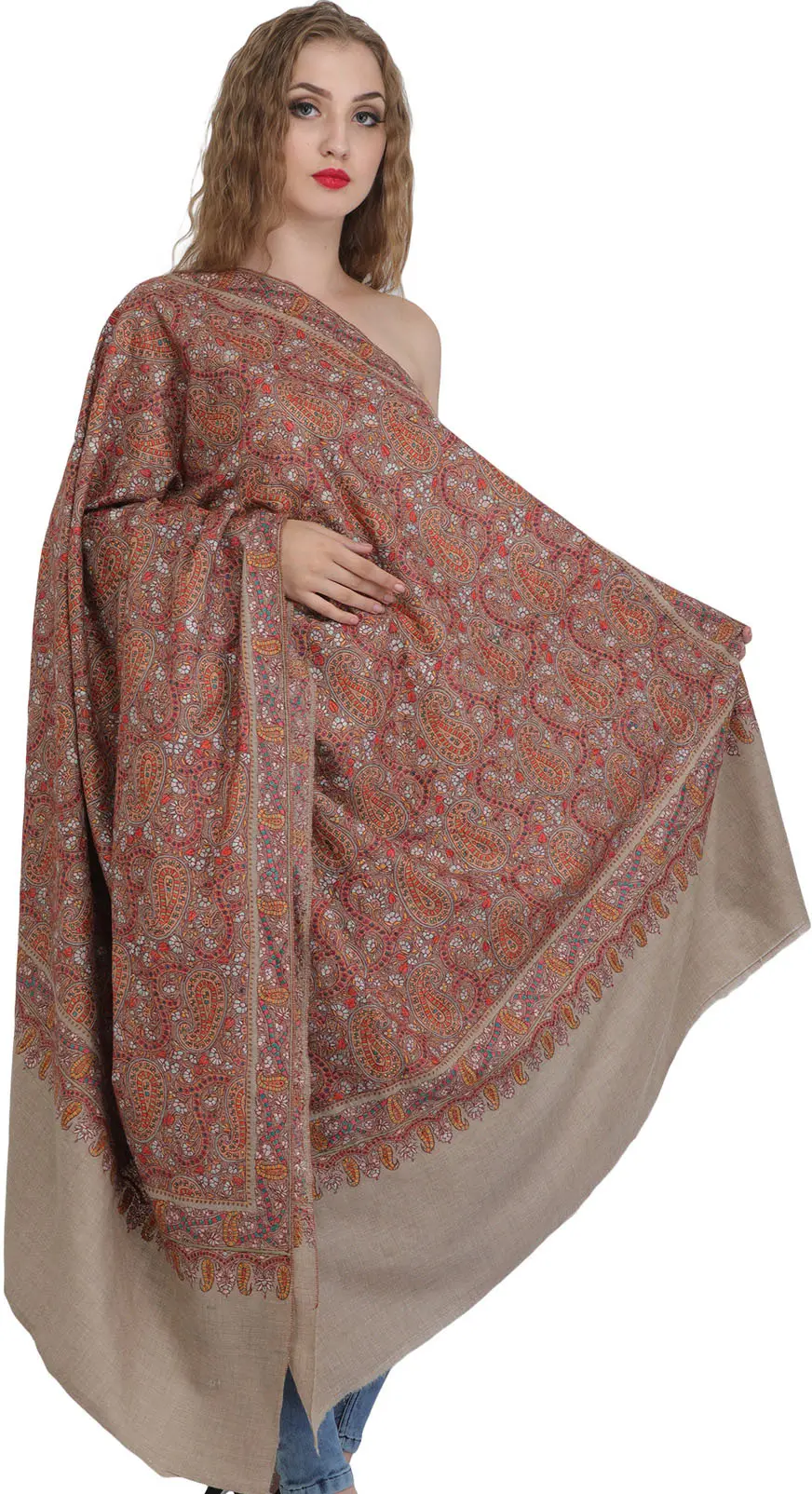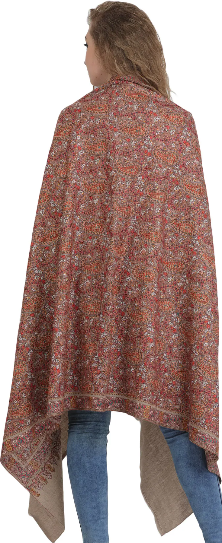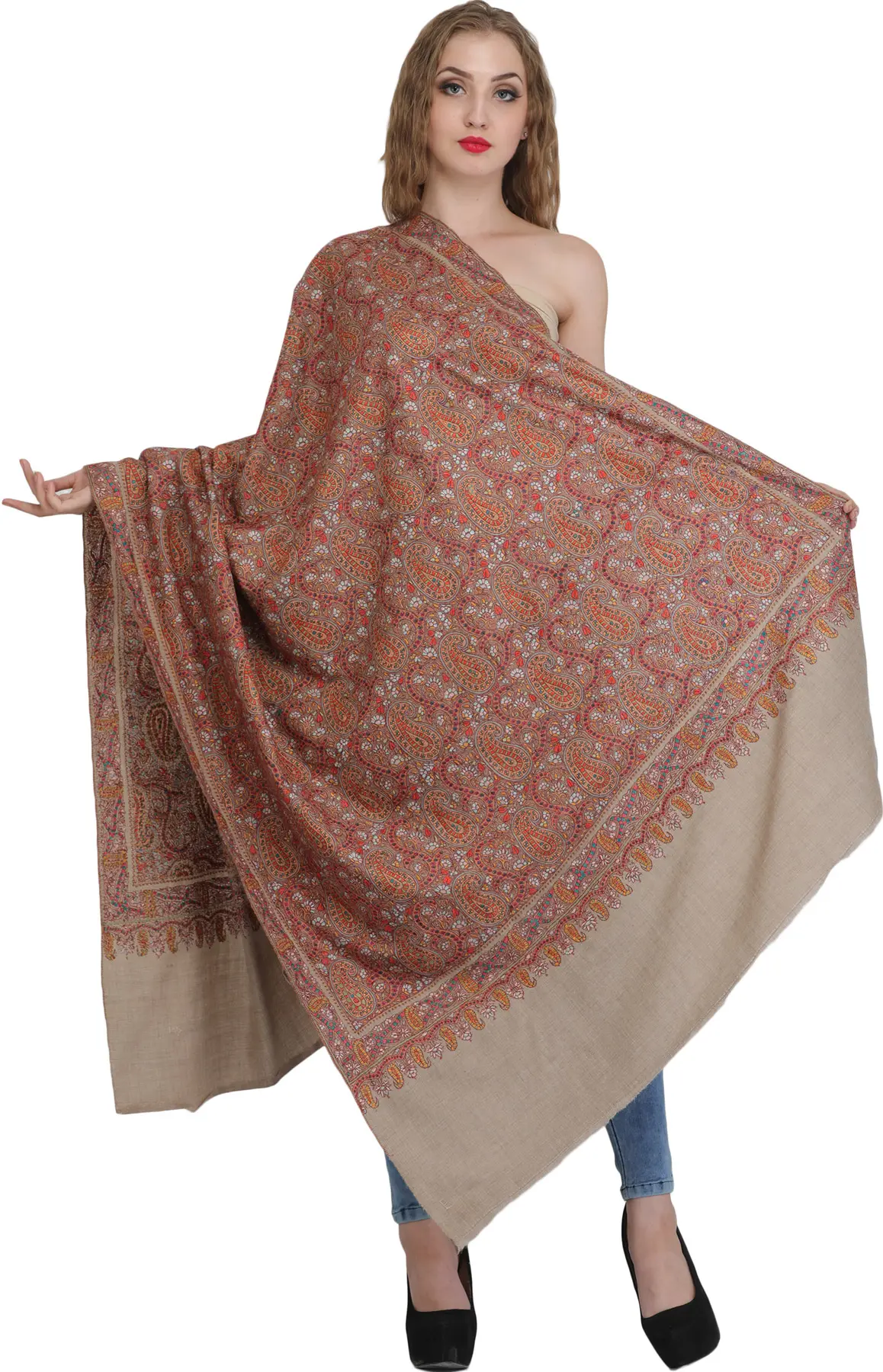 Affogato Pashmina Shawl from Kashmir with Heavy Sozni Embroidered Paisley and Flowers
