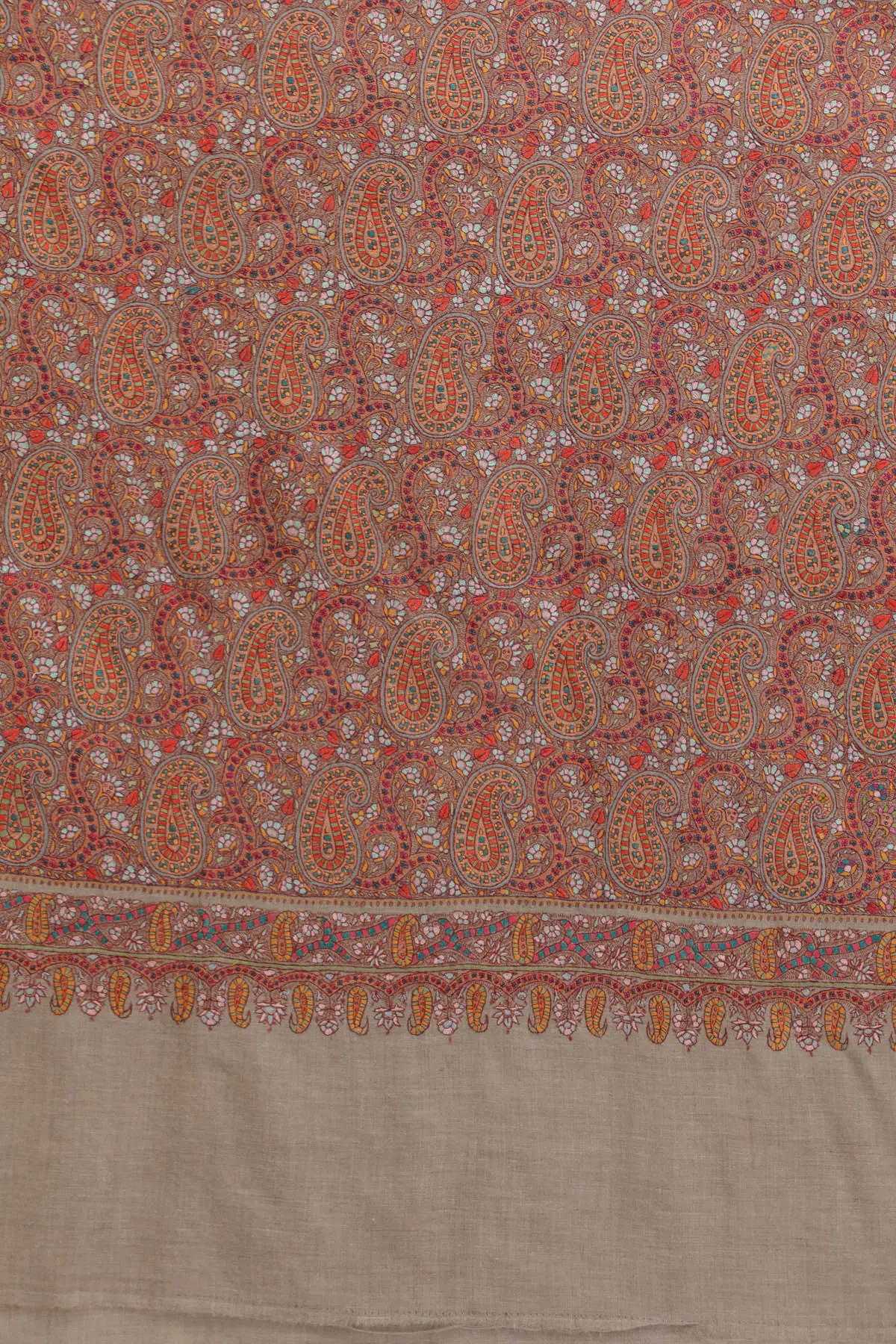 The foundation of this creation is a sublime light-taupe hue, offering a sophisticated backdrop to the vibrant, all-over floral embroidery. The rich tapestry of paisley and floral motifs dances across the generous expanse, creating a visual symphony of color and texture. Its substantial size, measuring a generous 6.5 feet by 3.4 feet, ensures you can drape it in myriad elegant ways, each accentuating its stunning detail.