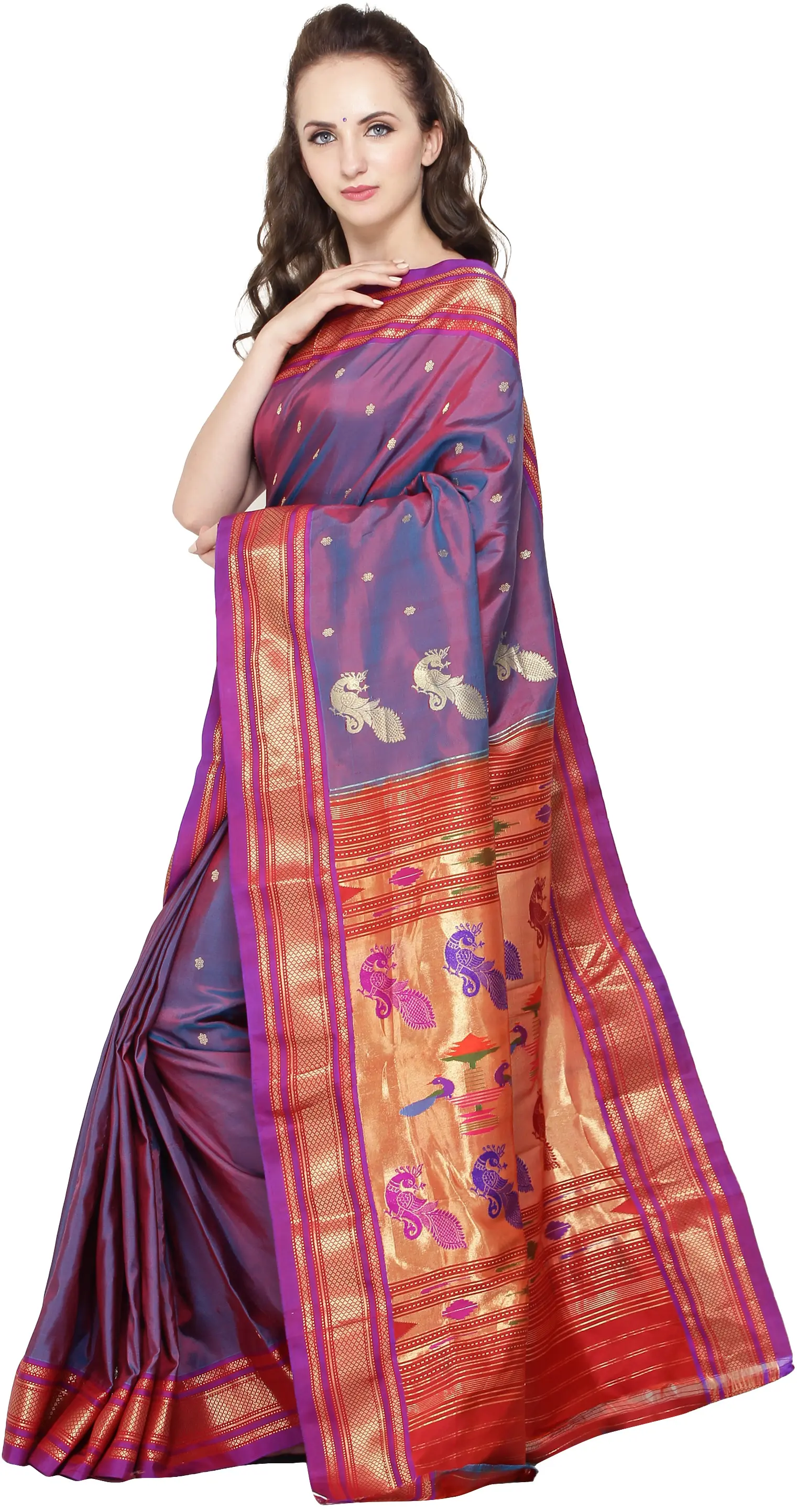 Immerse yourself in the timeless elegance of traditional Indian craftsmanship with this exquisite Paithani silk sari. A masterpiece of textile artistry, this sari features a captivating blend of lilac-rose and deep purple hues, creating a rich and dynamic canvas that shimmers with every movement. The luxurious feel of pure silk drapes beautifully, offering both comfort and a regal presence for any occasion.